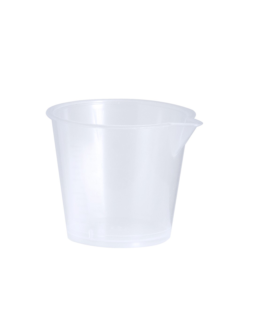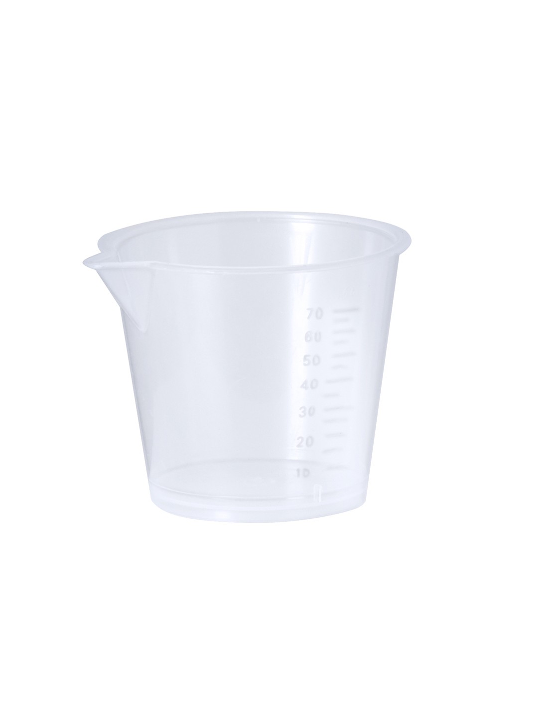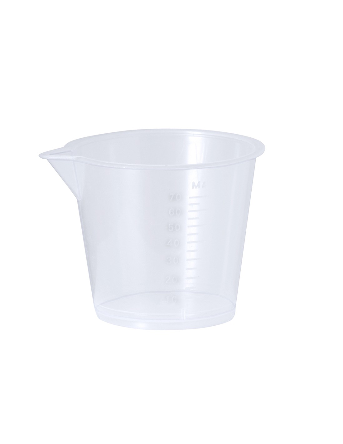 Vaso medidor de 70 ml fabricado en resistente PP transparente. Con medidor lateral en tramos de 10 ml y vertedor en el borde para evitar derrames.
