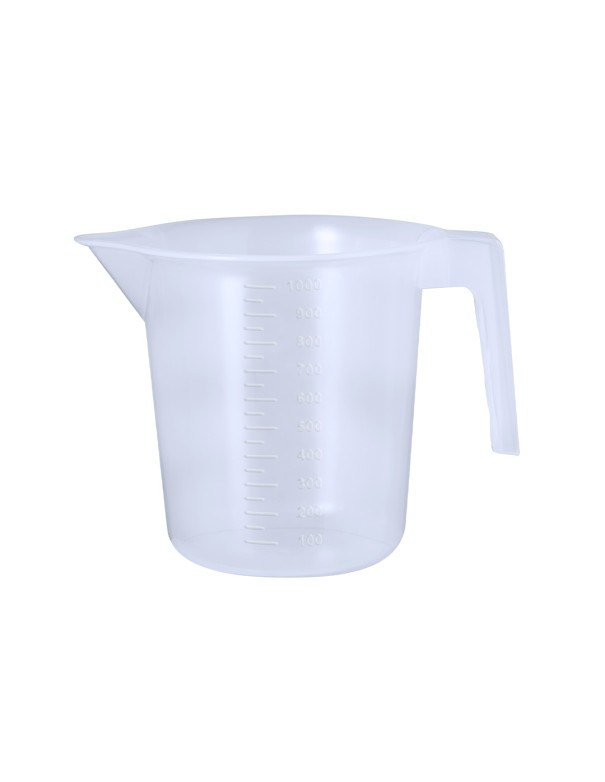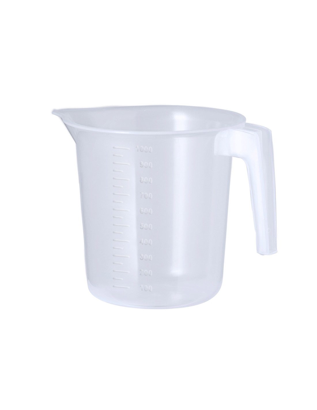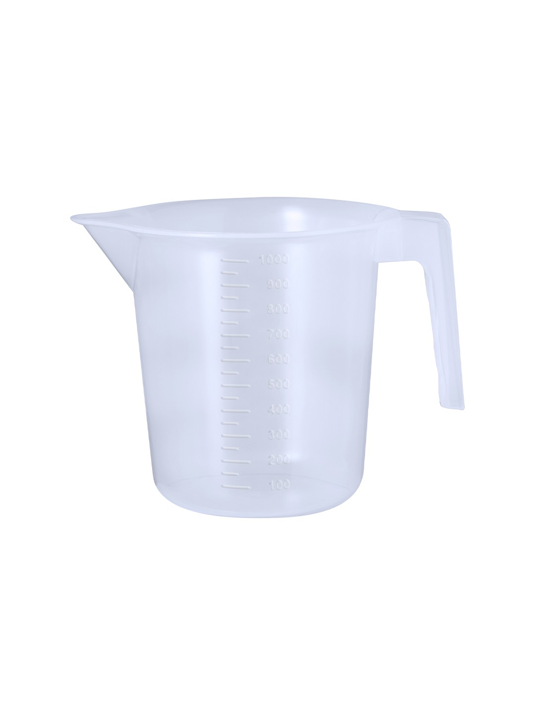 Jarra medidora de 1L fabricada en resistente PP transparente con asa. Con medidor lateral en tramos de 50 ml y vertedor en el borde para evitar derrames.