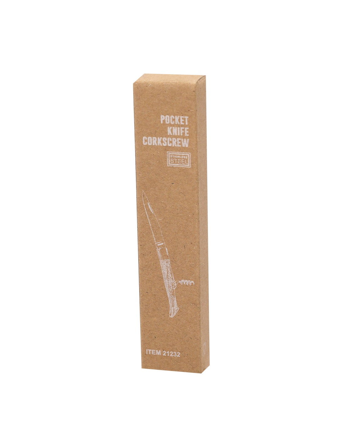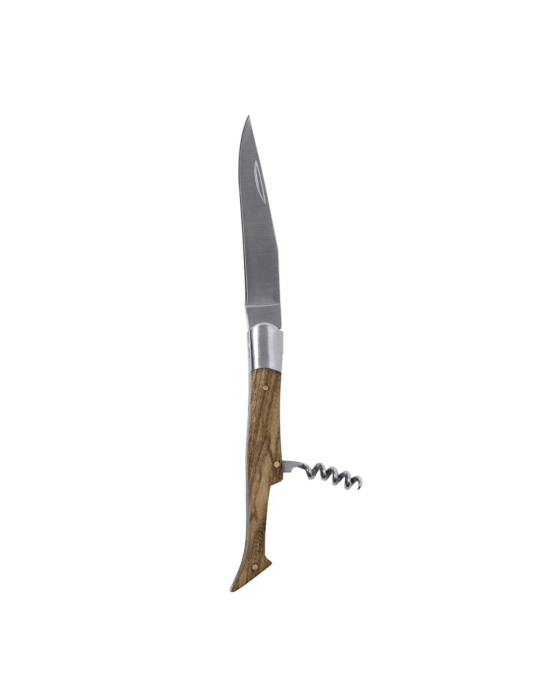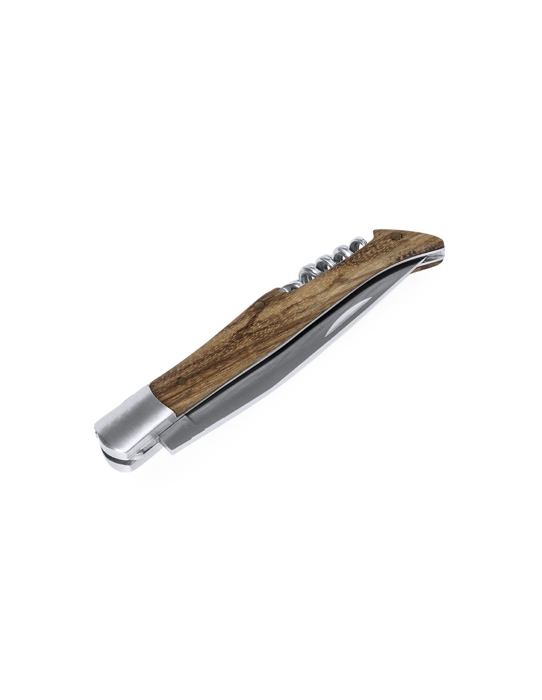 Navaja fabricada en resistente acero inox, con mango ergonómico fabricado en madera natural lacada y sacacorchos integrado. La aleación de la hoja garantiza resistencia a la corrosión y abrasión, siendo ideal para el uso frecuente con materiales duros. La hoja es de tipo punta de aguja, que se caracteriza por su forma puntiaguda, con la parte superior recta. Presentada individualmente en caja de diseño kraft.