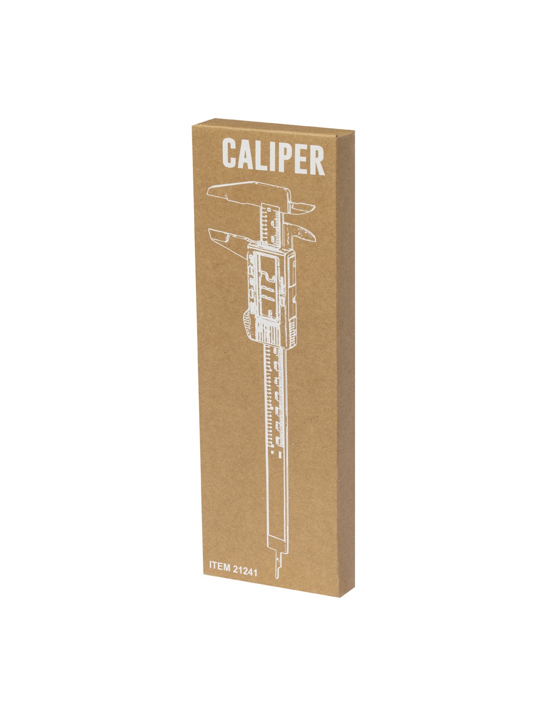 Calibre pie de rey con modo de medición digital y analógico. Con pantalla LCD y botones ON/OFF, ZERO para ajuste y otro para seleccionar la medida en mm o en pulgadas. Incluye sonda para medir la profundidad y pinzas para el medir el interior de los objetos. Rango de medición hasta 150 mm, con instrucciones en español e inglés y presentado en caja individual de diseño kraft.