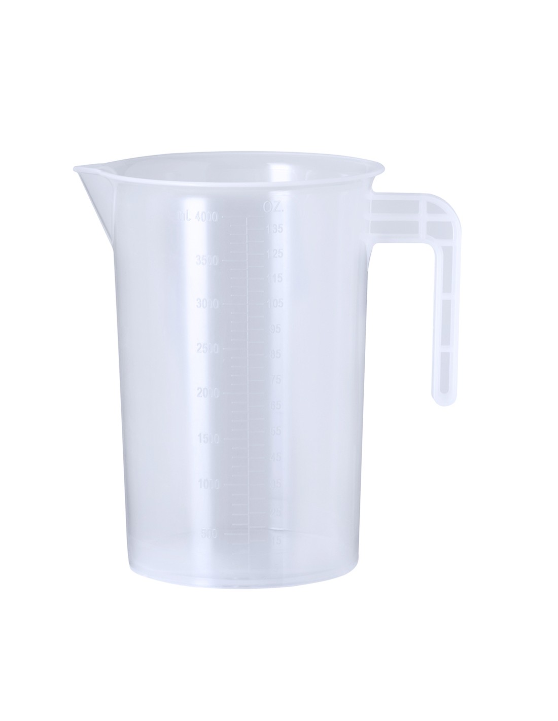 Jarra medidora de 4L fabricada en resistente PP transparente con asa. Con medidor lateral en tramos de 100 ml / 5oz y vertedor en el borde para evitar derrames.