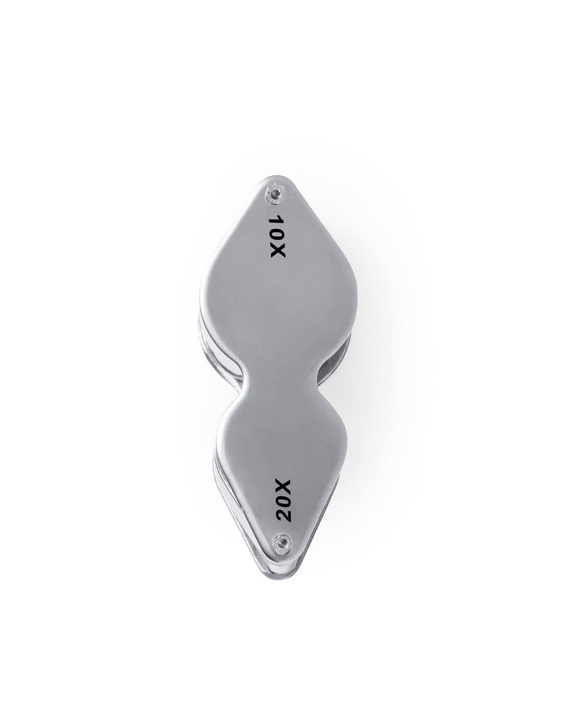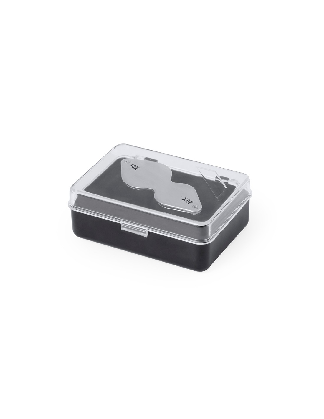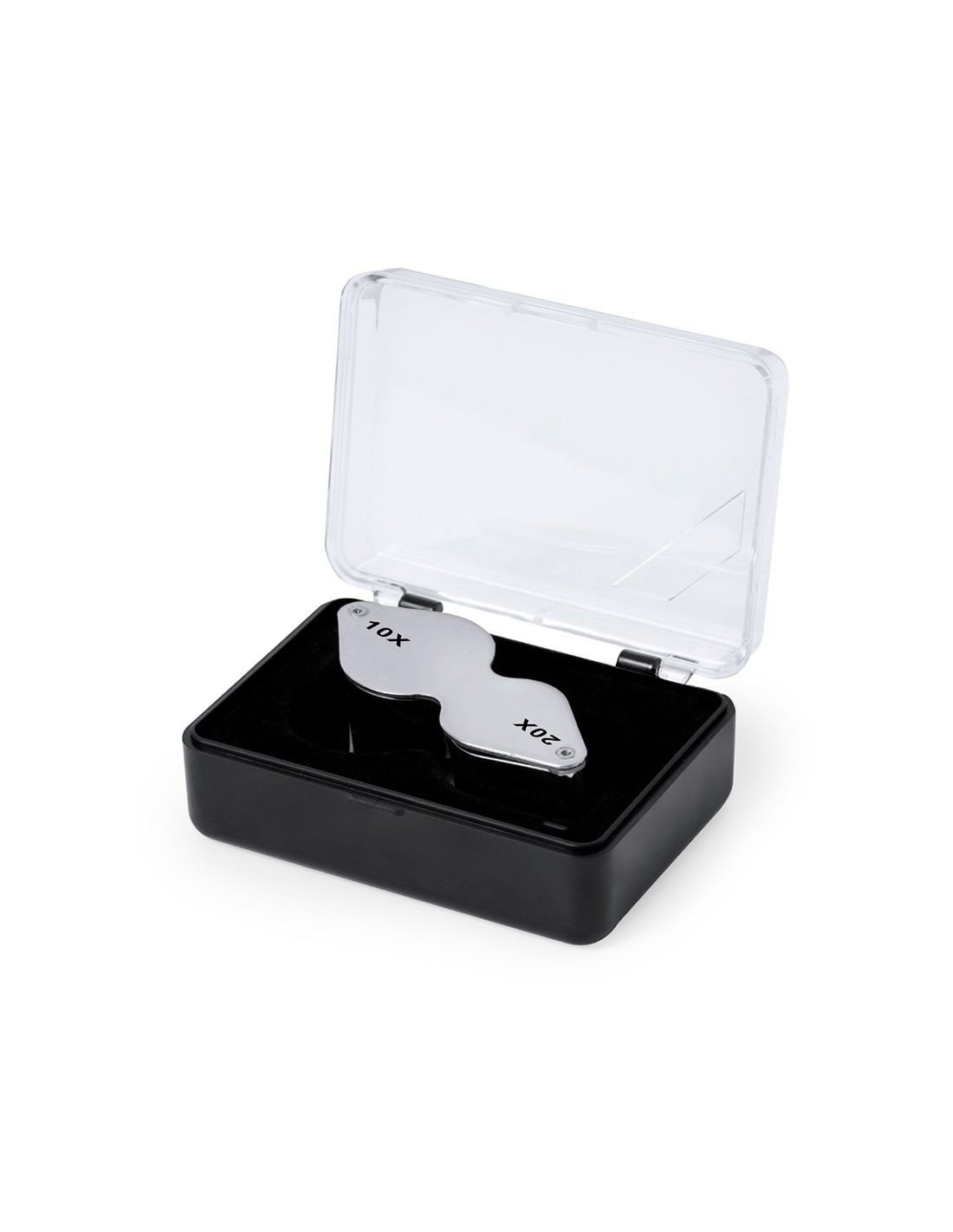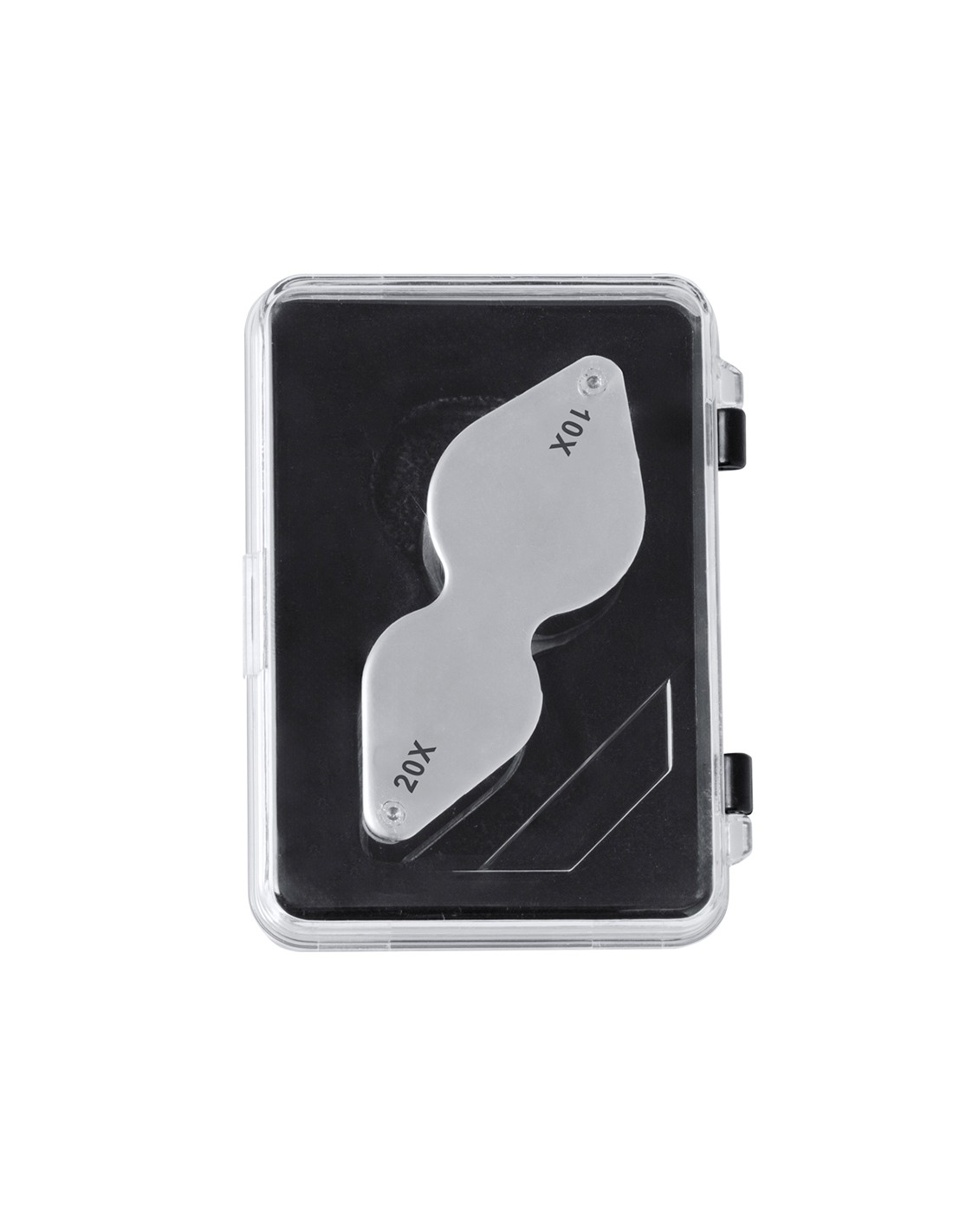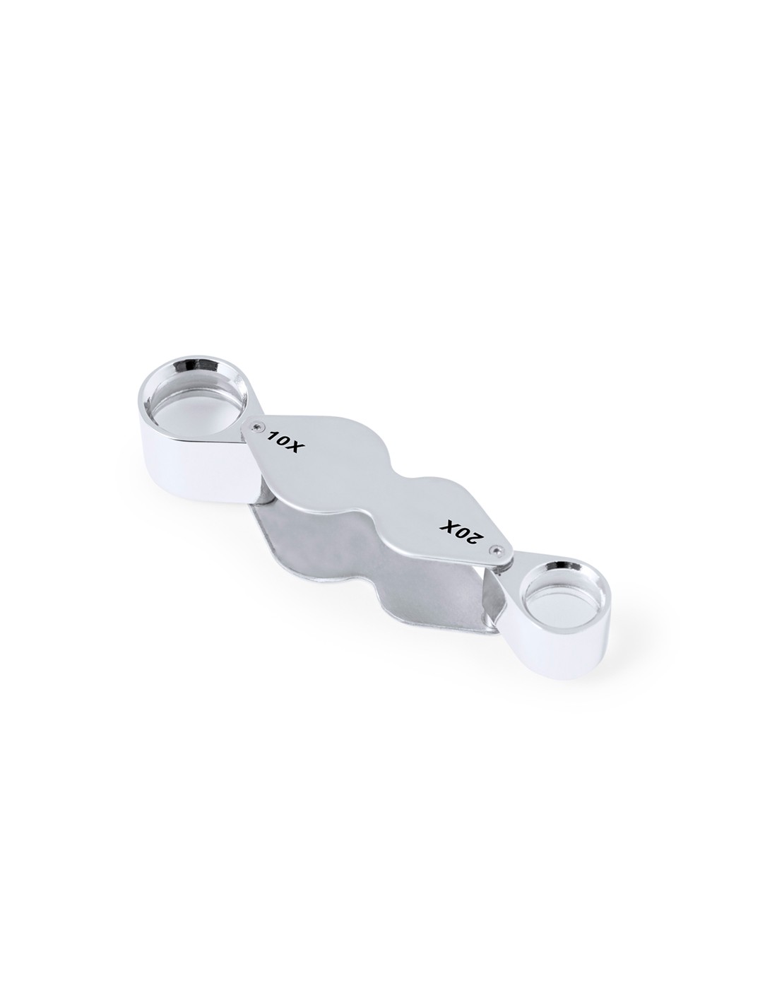 Lupa plegable doble con aumento 10x y 20x, fabricada en resistente metal. Gran potencia de aumento para obtener una visión muy cercana de los detalles más pequeños, con ampliación sin distorsión. Ideal para inspeccionar objetos de tamaño reducido, textos, etc. Además, viene dentro de un estuche con interior acolchado para una mayor protección. Presentada en caja de cartón negra.