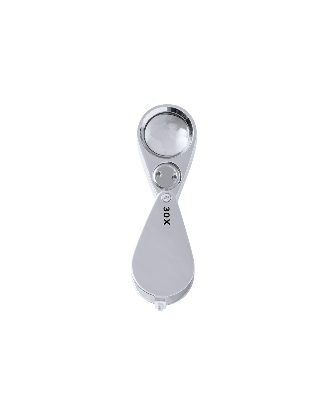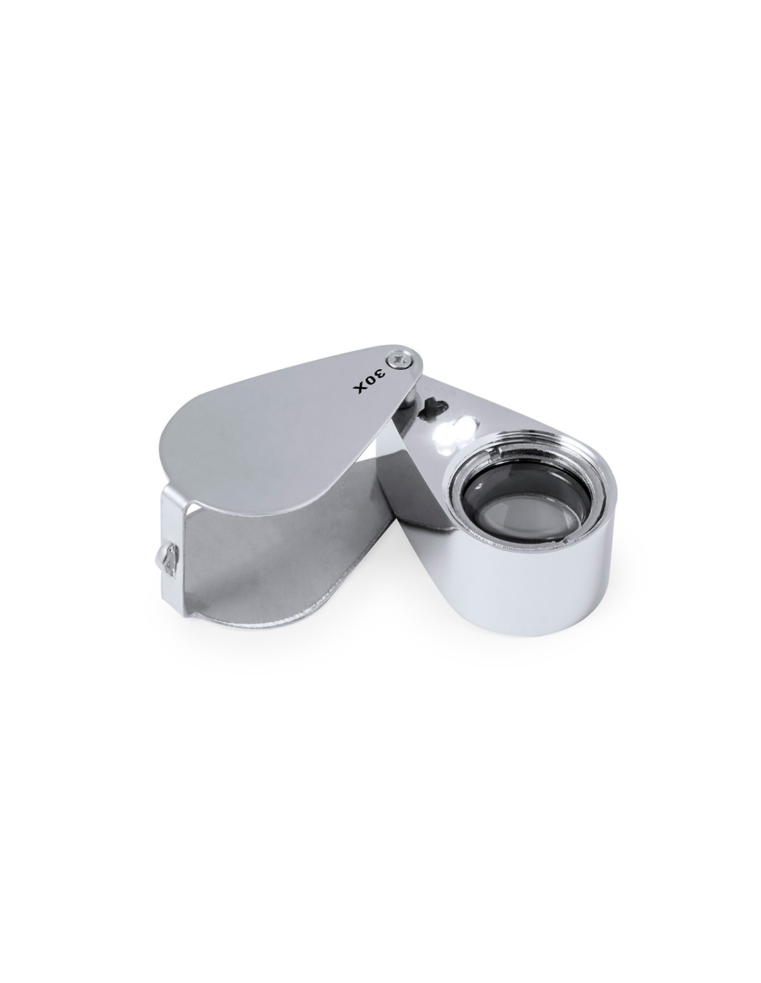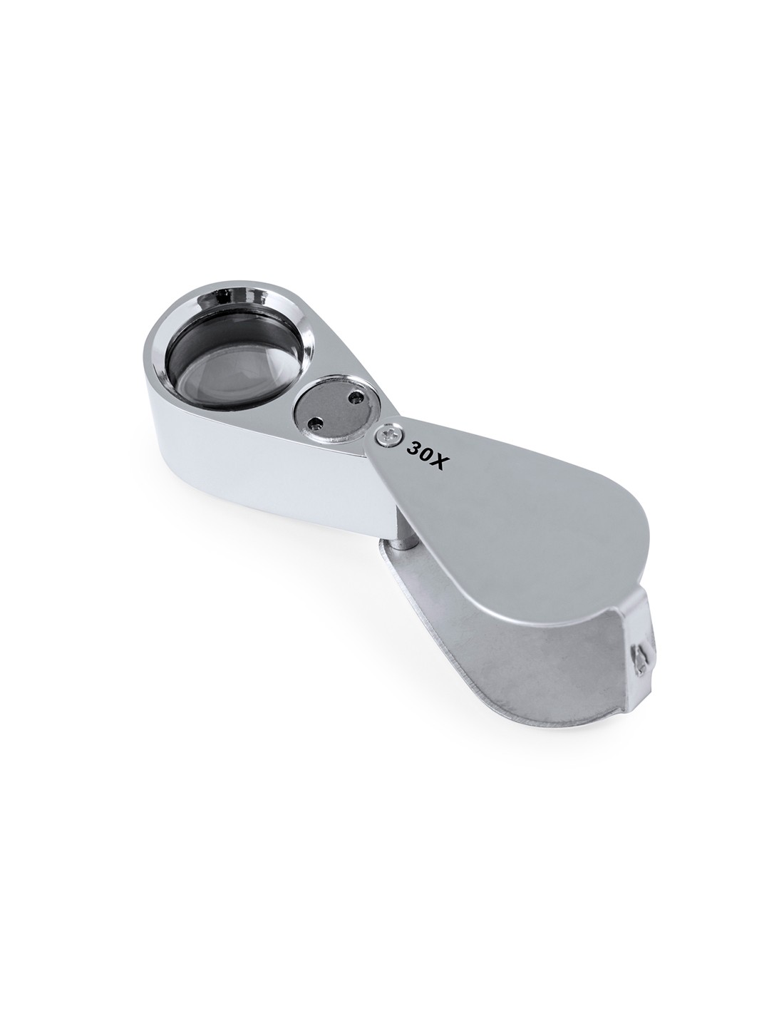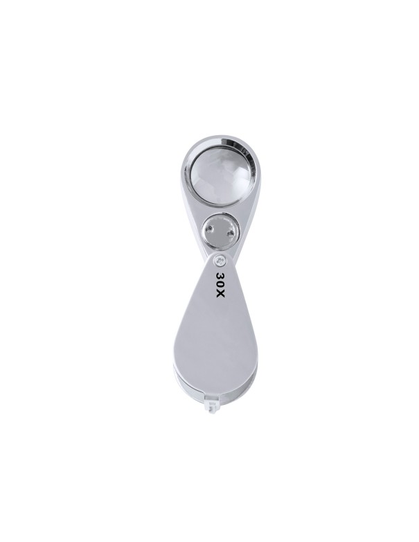 Lupa plegable con aumento 30x fabricada en resistente metal. Con luces LED integradas y gran potencia de aumento para obtener una visión muy cercana de los detalles más pequeños, con ampliación sin distorsión. Ideal para inspeccionar objetos de tamaño reducido, textos, etc. Además, tiene un accesorio para colgar, y viene dentro de un estuche con interior acolchado para una mayor protección. Alimentación a pilas (de botón incluidas), con llave especial para reemplazarlas cuando se agoten. Presentada en caja de cartón negra.
