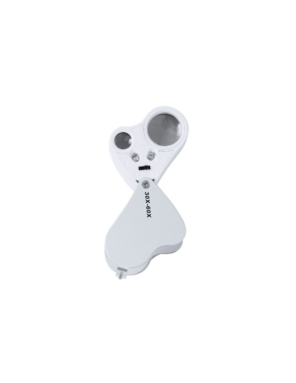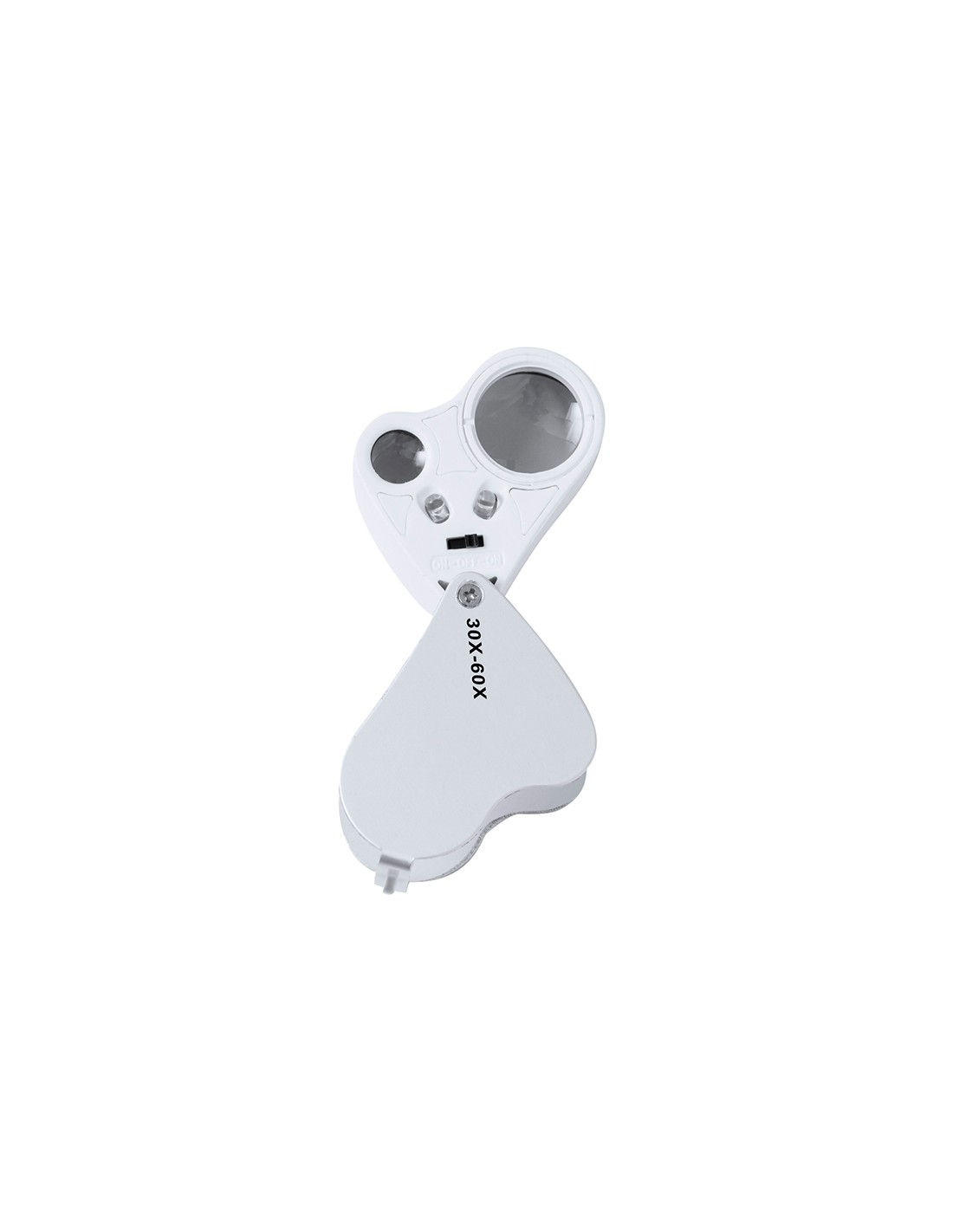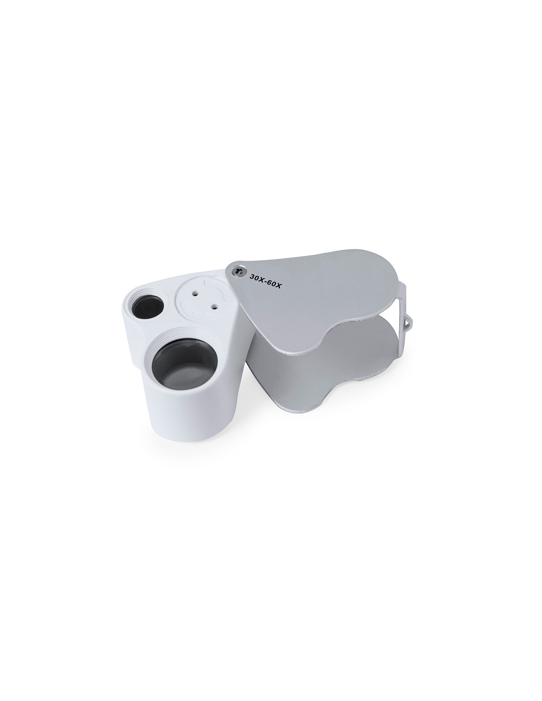 Lupa plegable doble con aumento 30x y 60x, fabricada en resistente metal. Con luces LED integradas y gran potencia de aumento para obtener una visión muy cercana de los detalles más pequeños y ampliación sin distorsión. Ideal para inspeccionar objetos de tamaño reducido, textos, etc. Además, tiene un accesorio para colgar, y viene dentro de un estuche con interior acolchado para una mayor protección. Alimentación a pilas (de botón incluidas), con llave especial para reemplazarlas cuando se agoten. Presentada en caja de cartón negra.