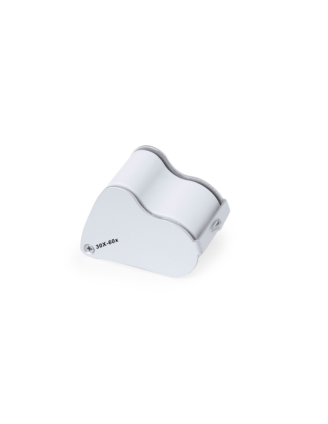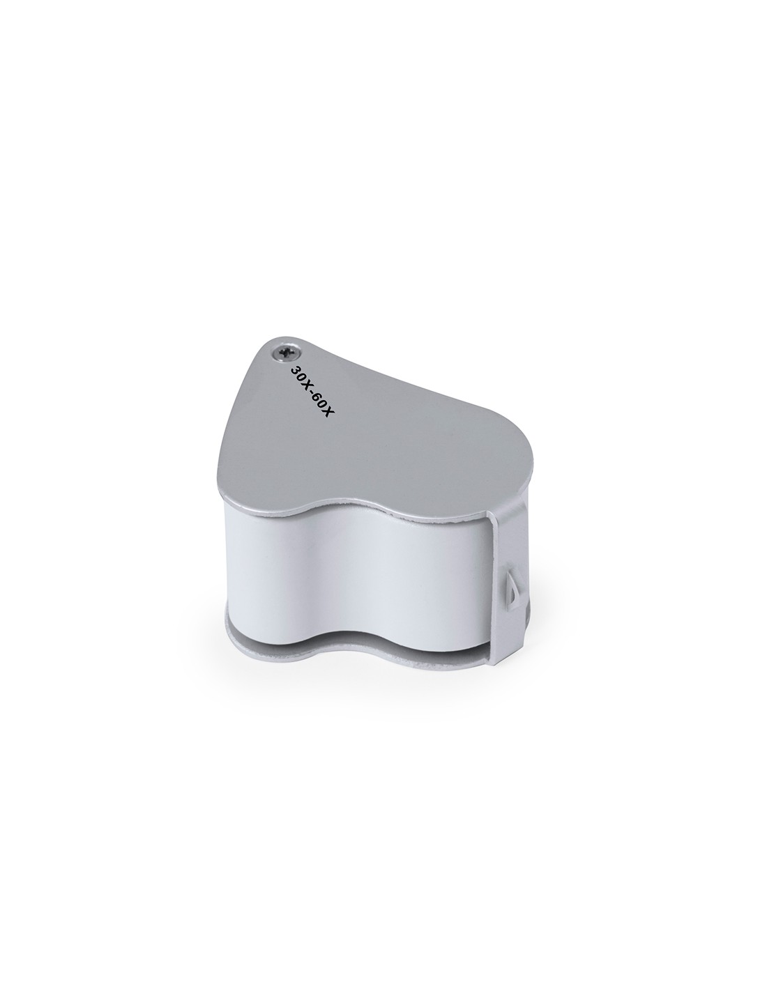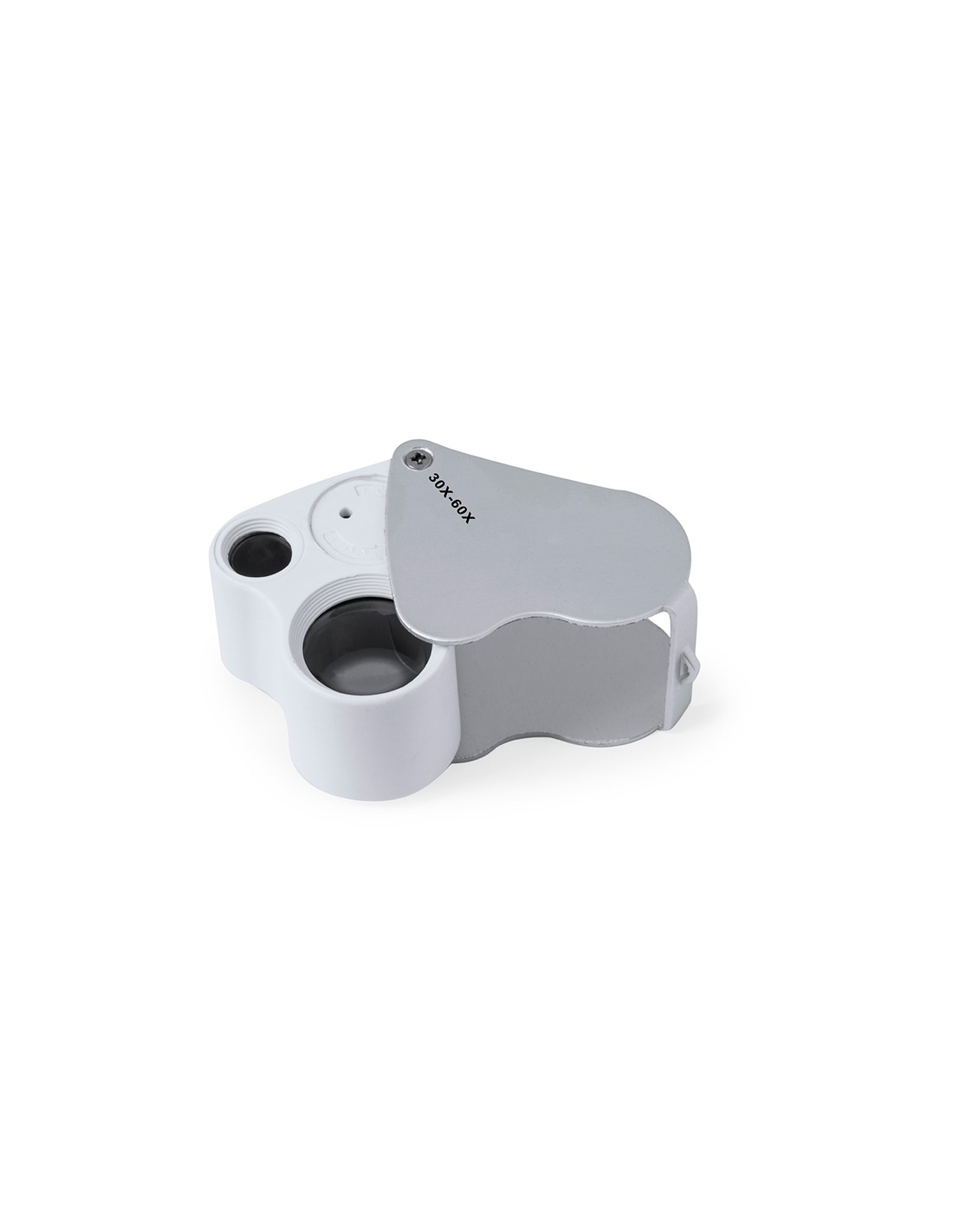 Lupa plegable doble con aumento 30x y 60x, fabricada en resistente metal. Con luces LED integradas y gran potencia de aumento para obtener una visión muy cercana de los detalles más pequeños y ampliación sin distorsión. Ideal para inspeccionar objetos de tamaño reducido, textos, etc. Además, tiene un accesorio para colgar, y viene dentro de un estuche con interior acolchado para una mayor protección. Alimentación a pilas (de botón incluidas), con llave especial para reemplazarlas cuando se agoten. Presentada en caja de cartón negra.
