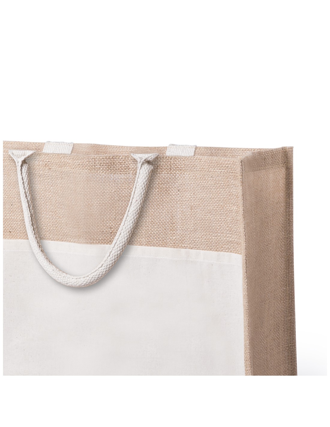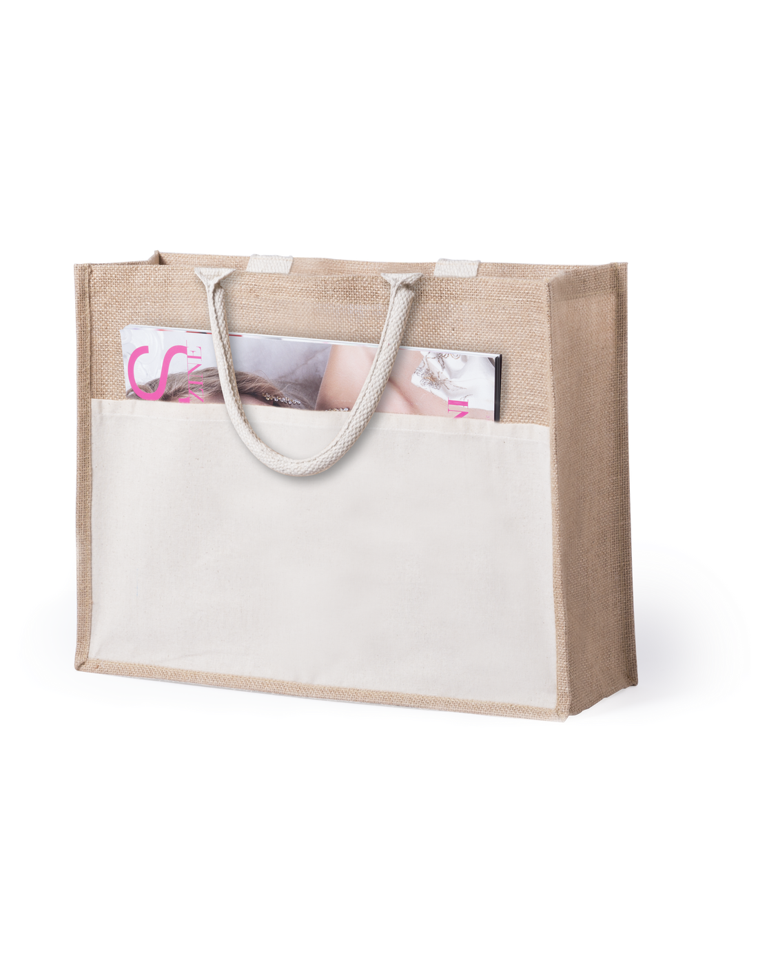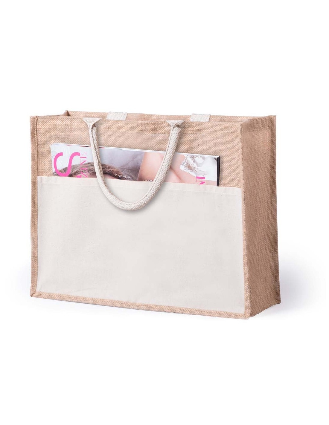 Bolsa de yute con bolsillo frontal de algodón. Con asas de algodón cortas en color blanco y reforzadas. Con fuelle, de acabado cosido y resistencia hasta 10kg de peso.