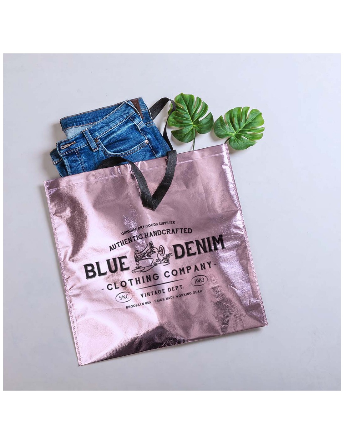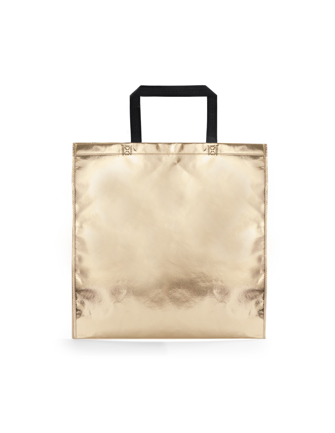 Bolsa en non-woven laminado de acabado metalizado. Disponible en colores dorado, plateado y oro rosa. Con asas medianas reforzadas de 42 cm de largo. De acabado termosellado, con fuelles y ribetes reforzados. Resistencia hasta 7kg de peso.