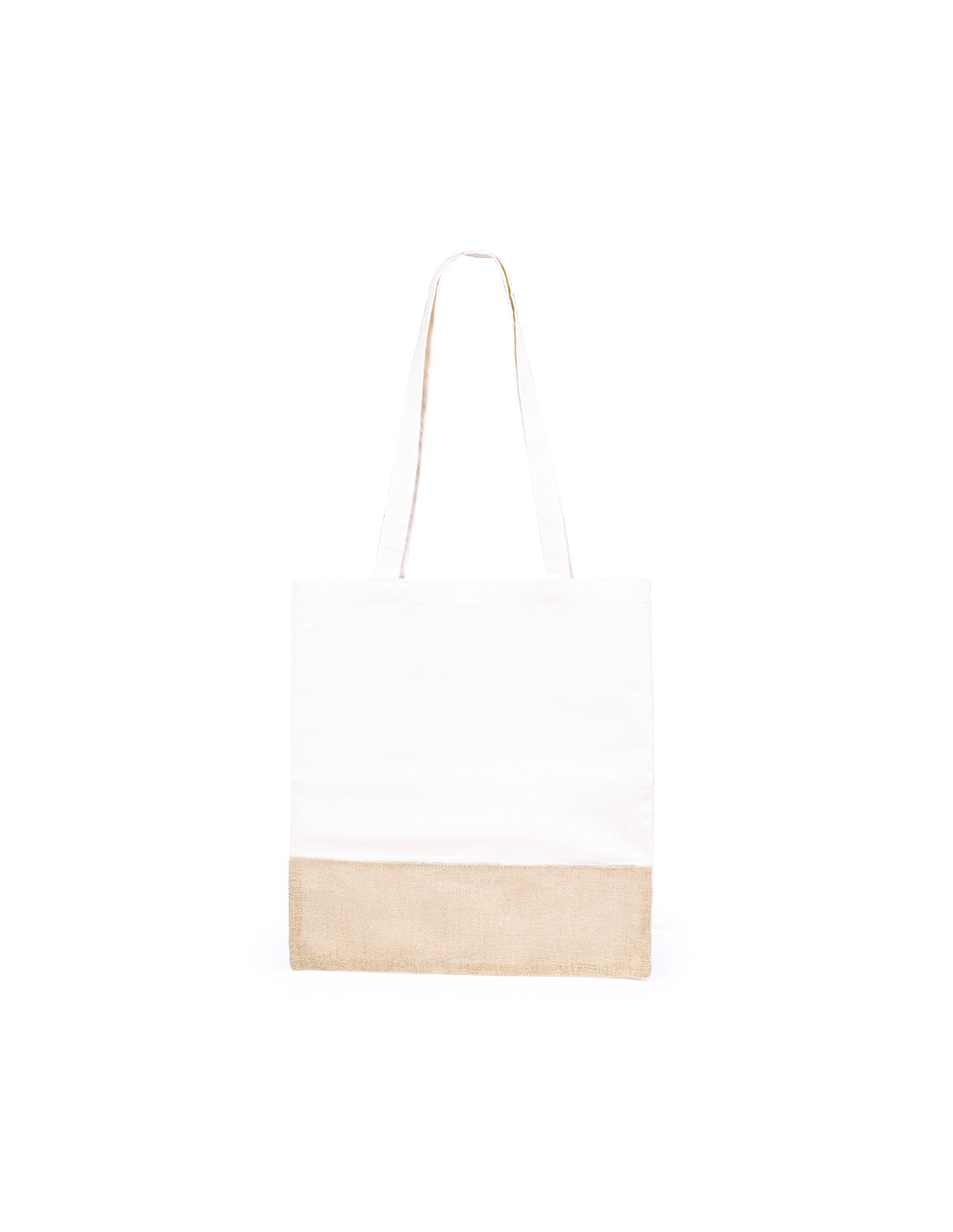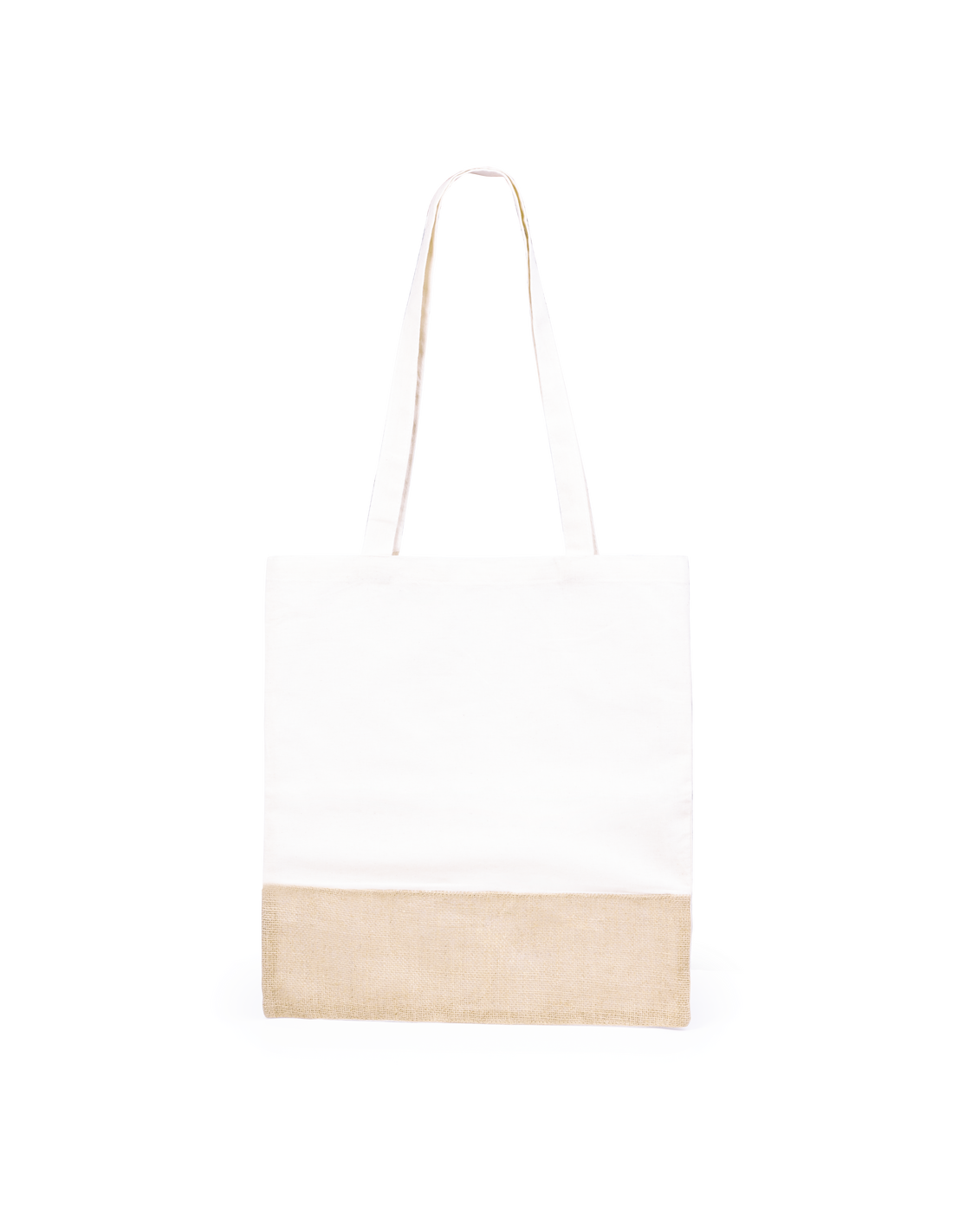 Bolsa ecológica en resistente combinación de materiales naturales -yute y algodón- de 245g/m2. Con atractivo diseño bicolor y acabado cosido. Asas largas de 70 cm reforzadas y resistencia hasta 8kg de peso.