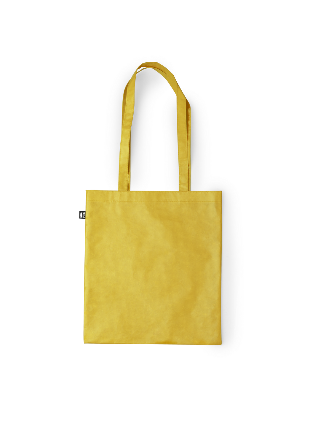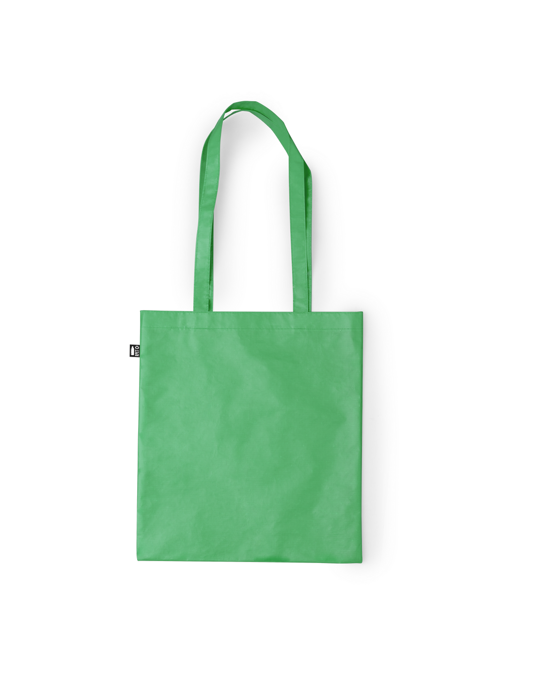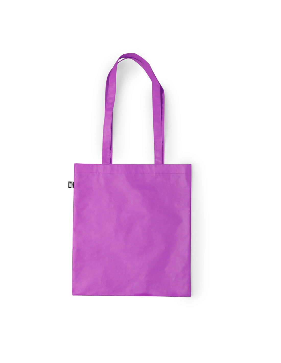 Bolsa de línea nature en material RPET, elaborado a partir de plástico reciclado, para así fomentar la reutilización de residuos plásticos y ayudar a la sostenibilidad del planeta. En material laminado de 100 g/m2 de acabado mate, con asas largas y costuras reforzadas. Resistencia de hasta 5 kg de peso. Disponible en extensa gama de colores con etiqueta distintivo RPET.