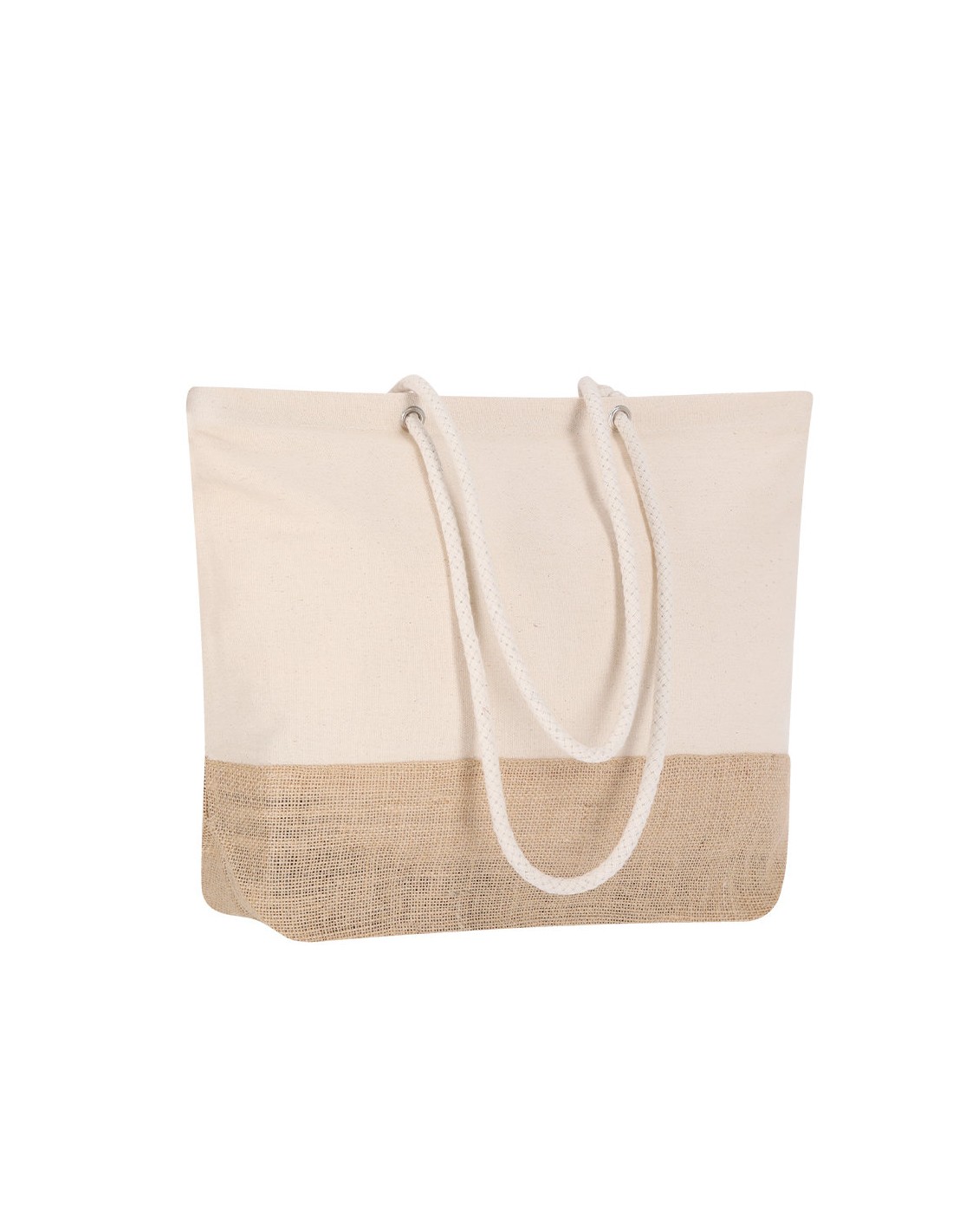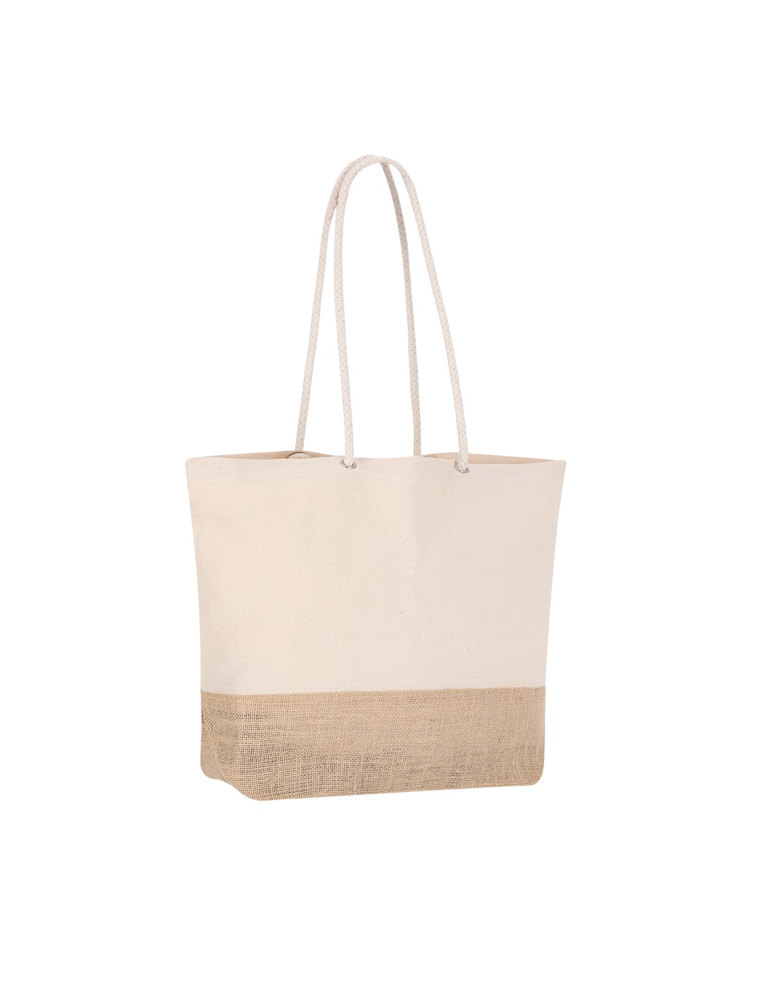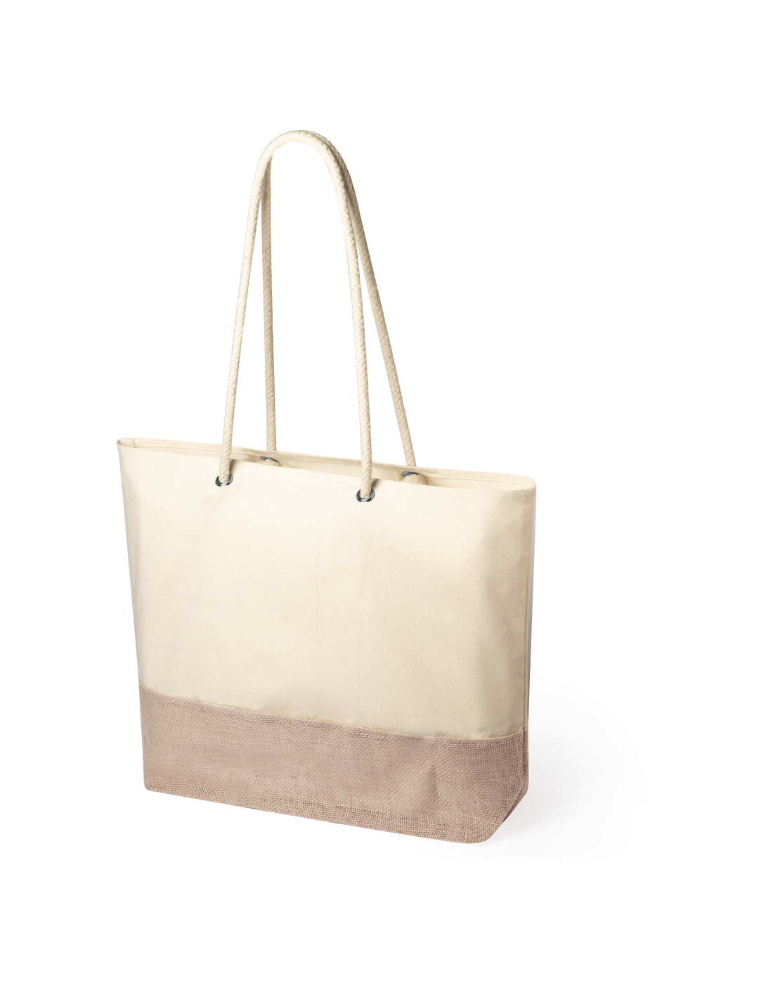 Bolsa de línea nature, en combinación de materiales yute y algodón. Tamaño 48 x 35 + 15 cm, de acabado cosido y con asas largas reforzadas de 90 cm en algodón. Resistencia de hasta 9 kg de peso.
