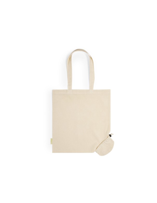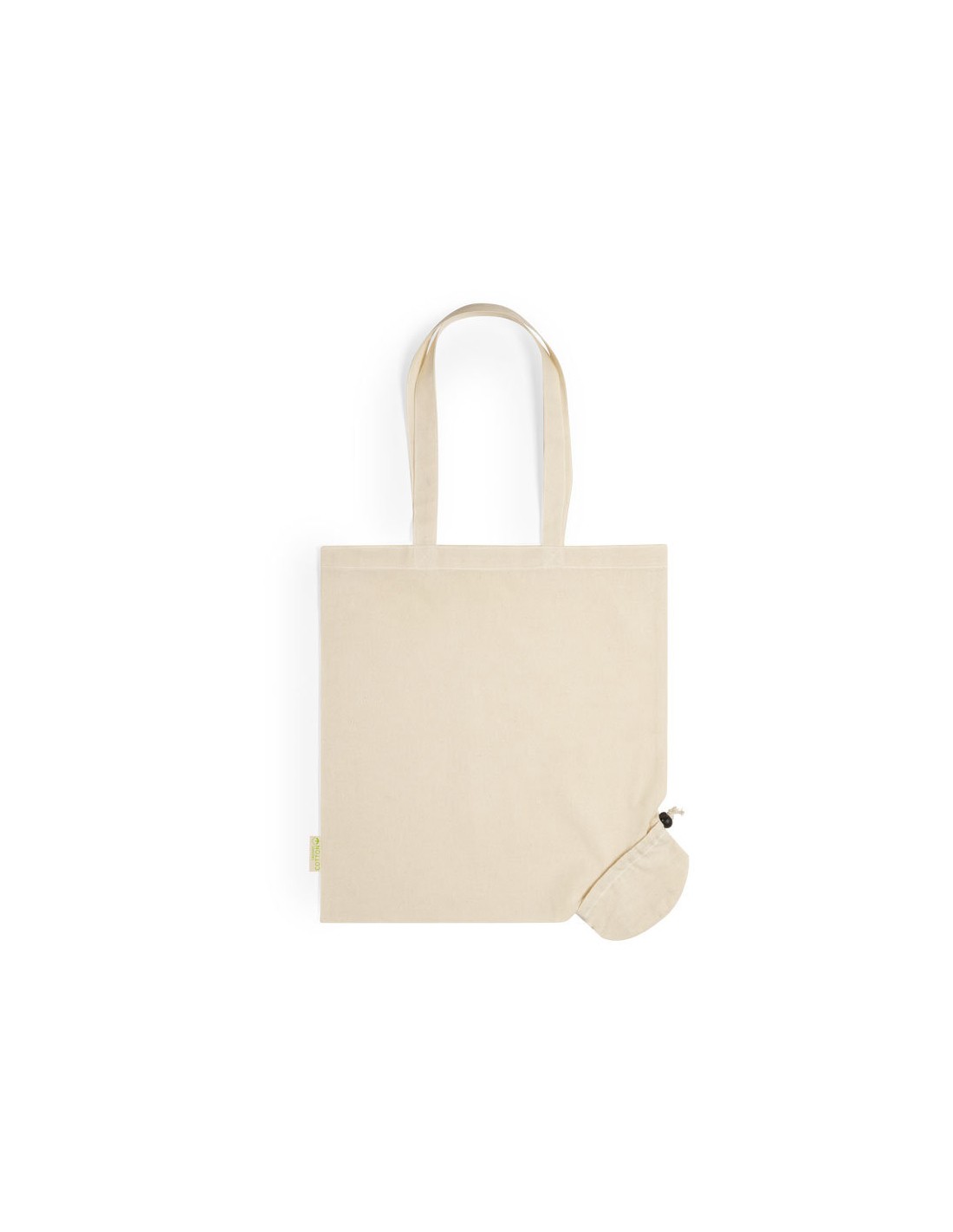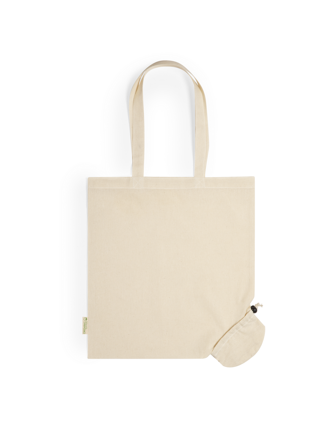 Bolsa plegable de línea nature en material 100% algodón orgánico natural de 120 g/m2. Asas largas de 70cm con refuerzo y de acabado cosido. Distintivo organic en etiqueta lateral y resistencia hasta 9 kg de peso. Plegado de pequeño tamaño para fácil transporte.