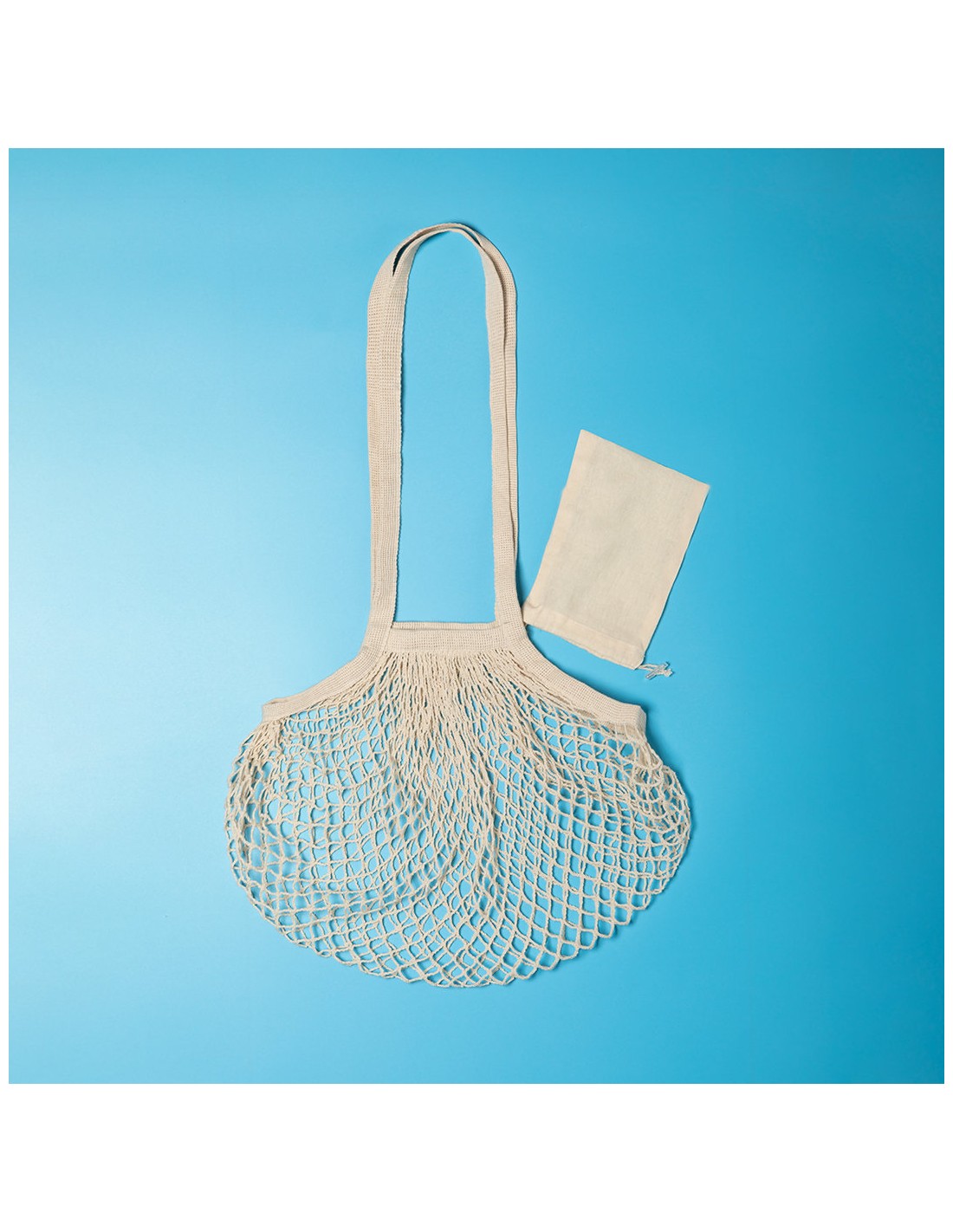 Bolsa plegable de redecilla de gran capacidad. De línea nature enalgodón crudo, con bolsita lisa para impresión de cierre de cordón. Asas largas y plegado de pequeño tamaño para fácil transporte.