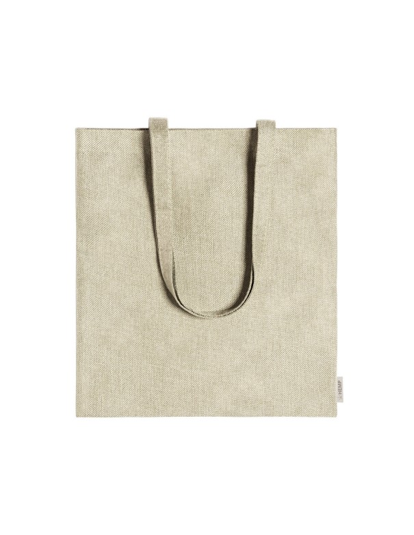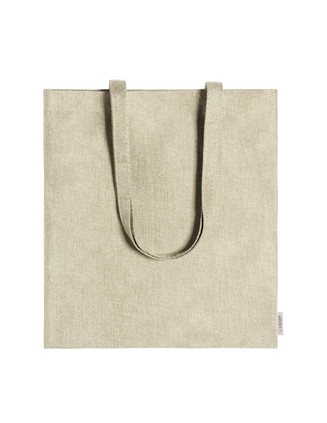 Bolsa de línea nature, fabricada en 100% tela de cáñamo de 200g/m2 obtenida de la planta Cannabis, cuyos procesos tanto de cultivo como de obtención de fibras son respetuosos con el medio ambiente, dando como resultado un tejido de gran resistencia, de origen natural y sostenible. De acabado cosido, con asas largas de 70cm y resistencia hasta 7kg de peso. Distintivo HEMP en etiqueta.