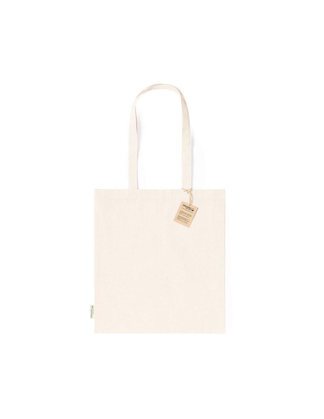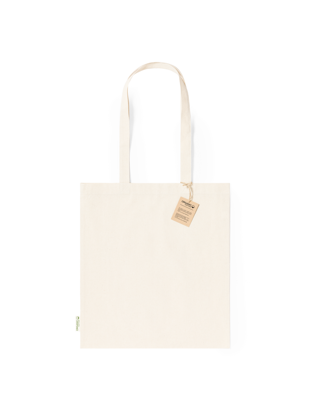 Bolsa fabricada en material100% algodón orgánico de 140g/m2 y en tono natural. De acabado cosido, con asas medianas reforzadas de 70 cm. Resistencia hasta 8kg, incluida etiqueta con distintivo de algodón orgánico y hangtag en cartón reciclado.