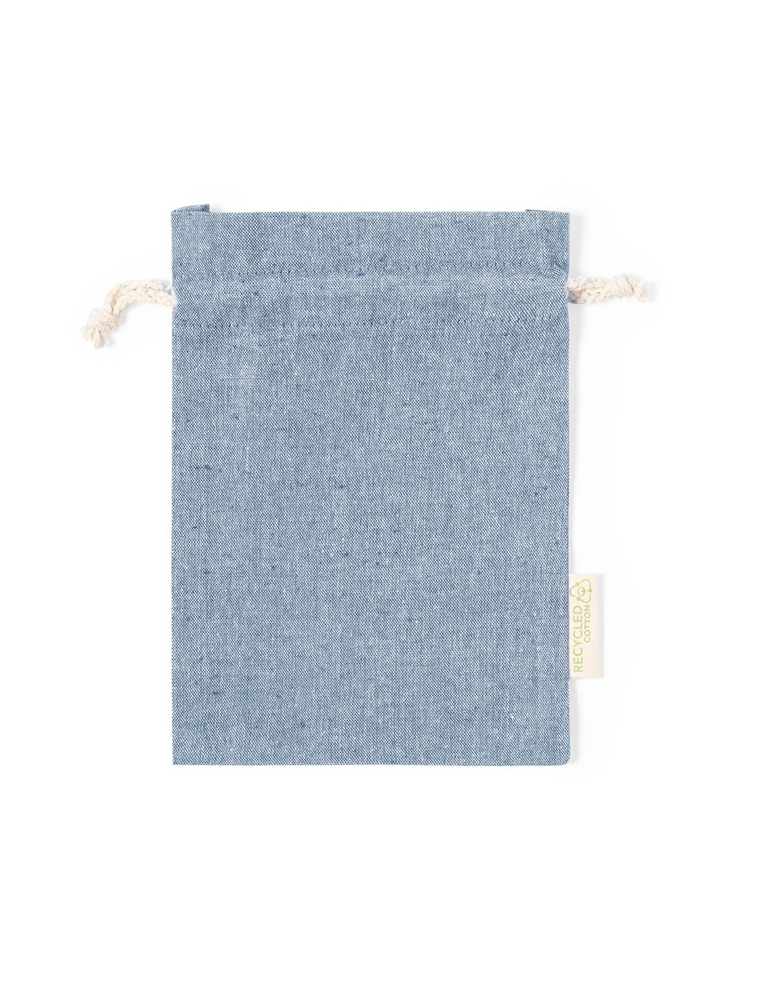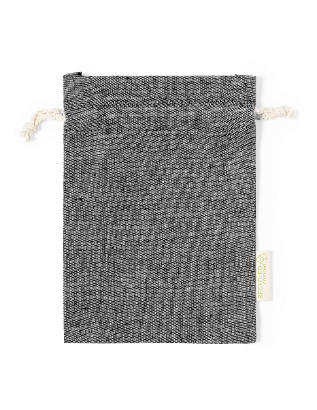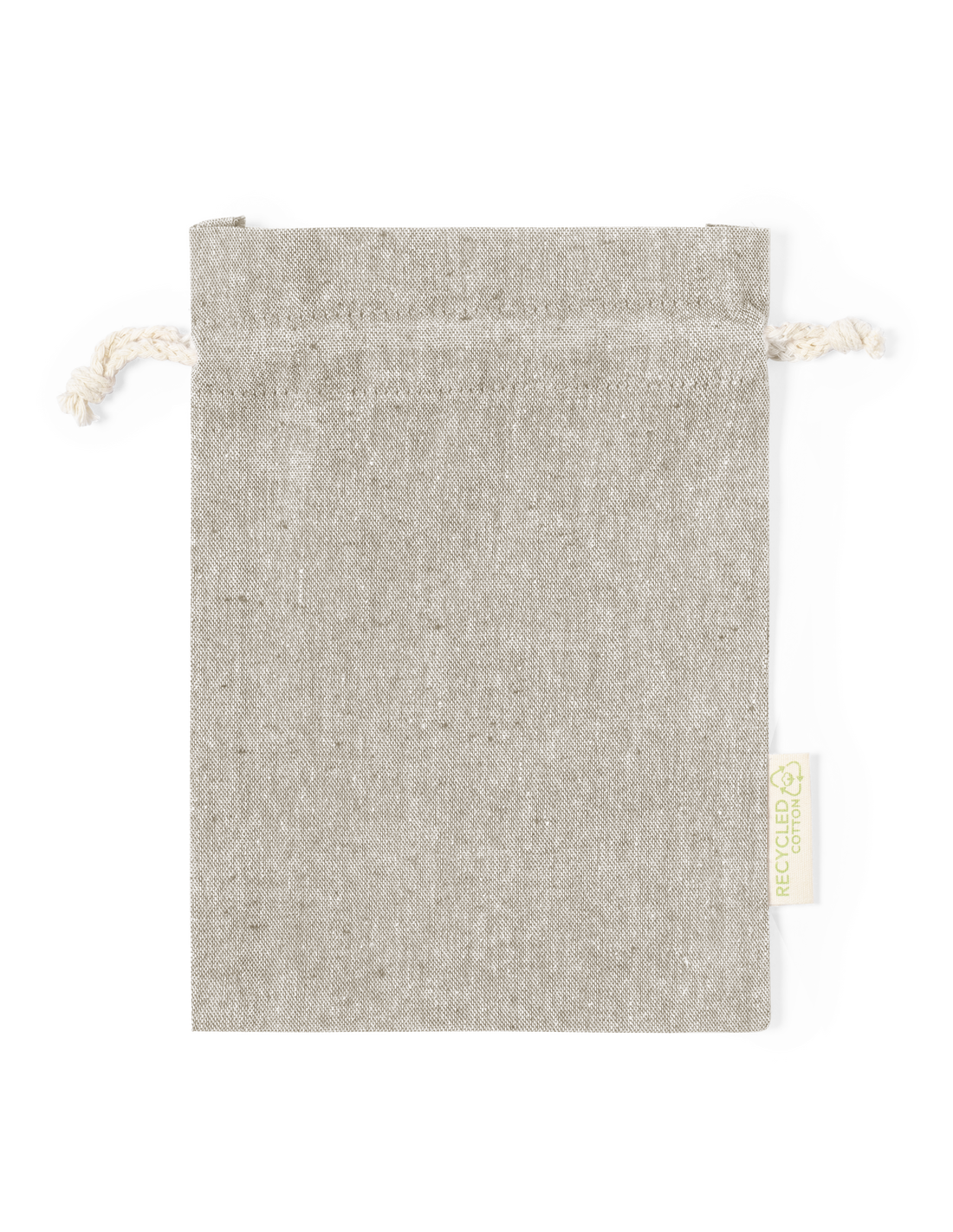 Bolsa eco-friendly en resistente material 100% algodón reciclado GRS de 120g/m2. Certificación GRS (Global Recycled Standard / Estándar de Reciclaje Global), que garantiza el origen reciclado del material usado para fabricar el producto. Cierre de cordón de algodón y acabado cosido, incluye etiqueta exterior con distintivo algodón reciclado.