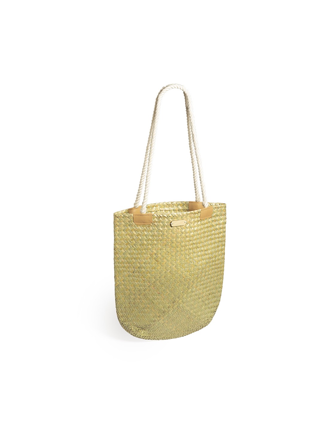 Bolso de desenfadado diseño en paja y con forma rectangular, un must. De gran capacidad y con originales asas largas en algodón, reforzadas en PU. Con superficie para personalización en madera, especialmente diseñada para marcaje en láser.