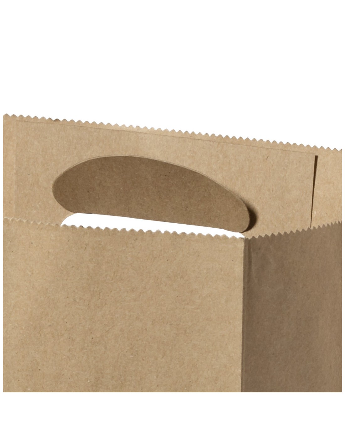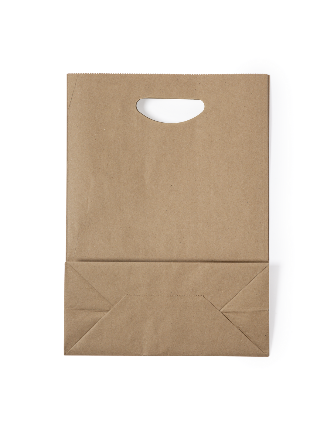 Bolsa ligera de línea nature fabricada en papel reciclado de 80g/m2. Con original asa troquelada y fuelle.