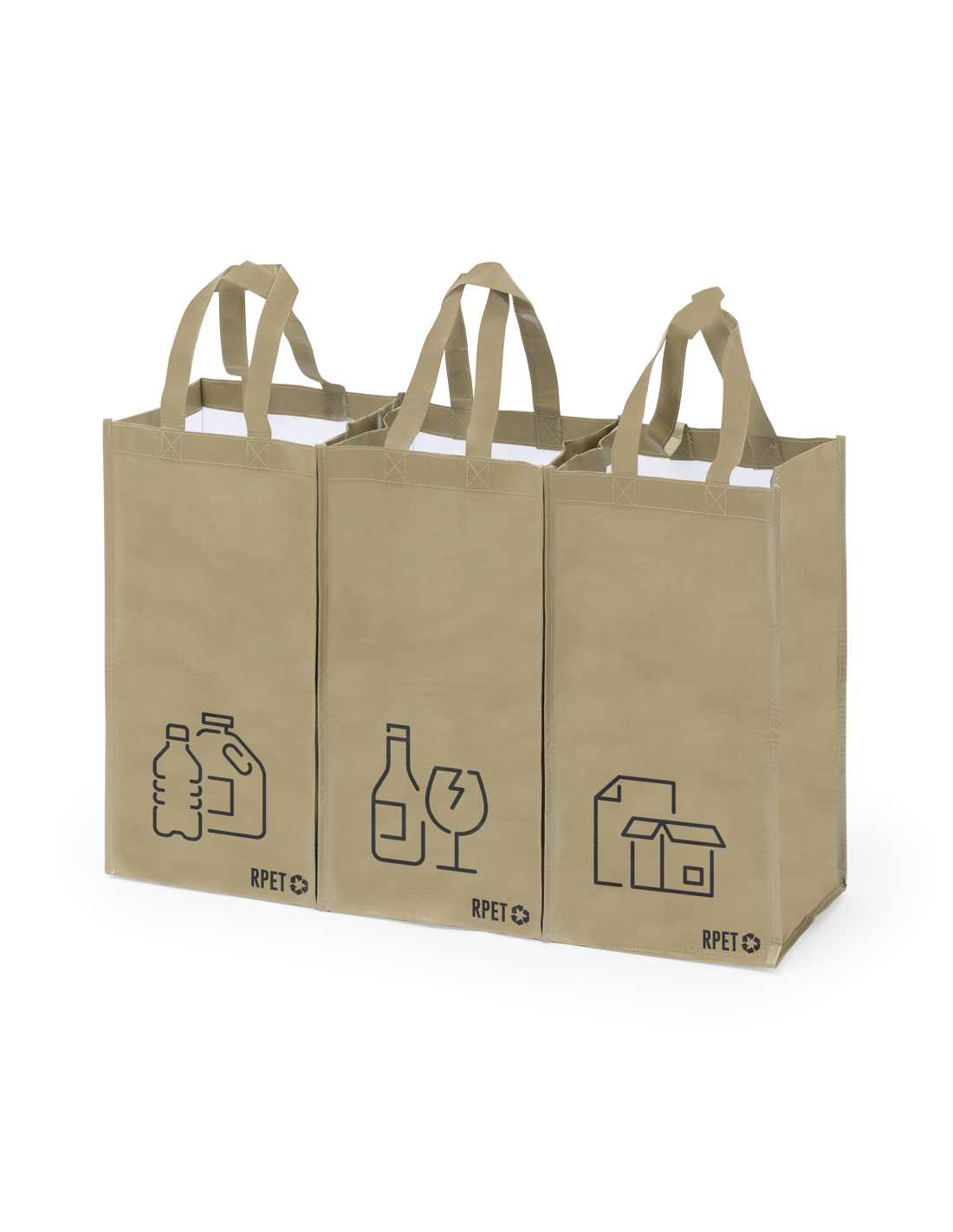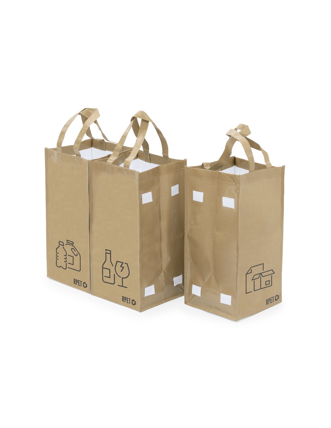 Set de 3 bolsas de reciclaje. Fabricadas en resistente poliéster RPET laminado, elaborado a partir de plástico reciclado, para así fomentar la reutilización de residuos plásticos y ayudar a la sostenibilidad del planeta. Incluye 3 bolsas de 23x45x23 cm unidas entre sí mediante velcros laterales. Con asas reforzadas e indicación de tipos de residuo: plásticos y envases vidrio, y papel. Distintivo RPET en la base de cada bolsa.