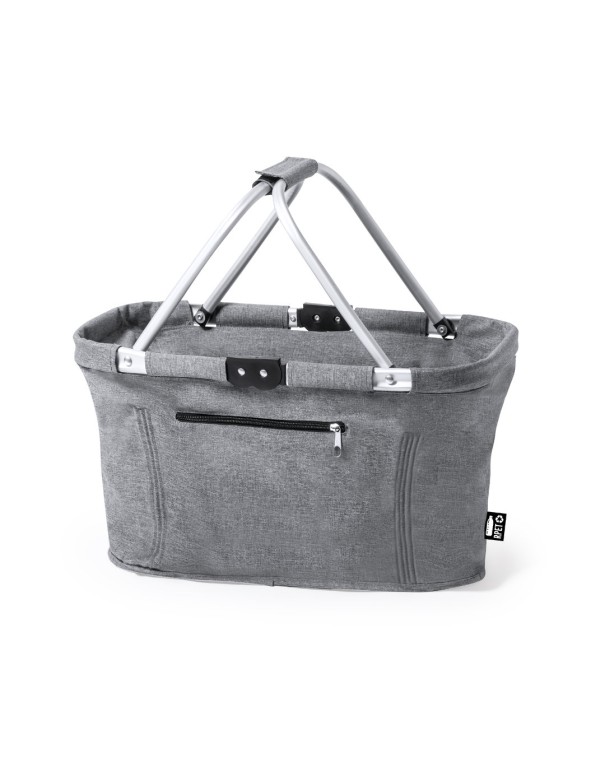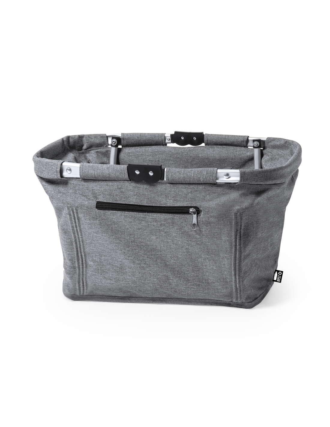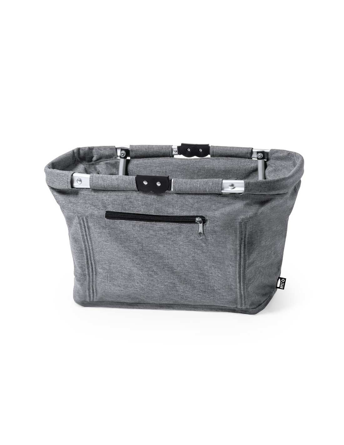 Cesta plegable fabricada en resistente 600D RPET. Con resistente estructura de aluminio y 2 asas de transporte plegables en aluminio, con cinta de velcro a juego. Bolsillo exterior con cierre de cremallera y etiqueta exterior con distintivo RPET. El material RPET se elabora a partir de plástico reciclado, para así fomentar la reutilización de residuos plásticos y ayudar a la sostenibilidad del planeta.