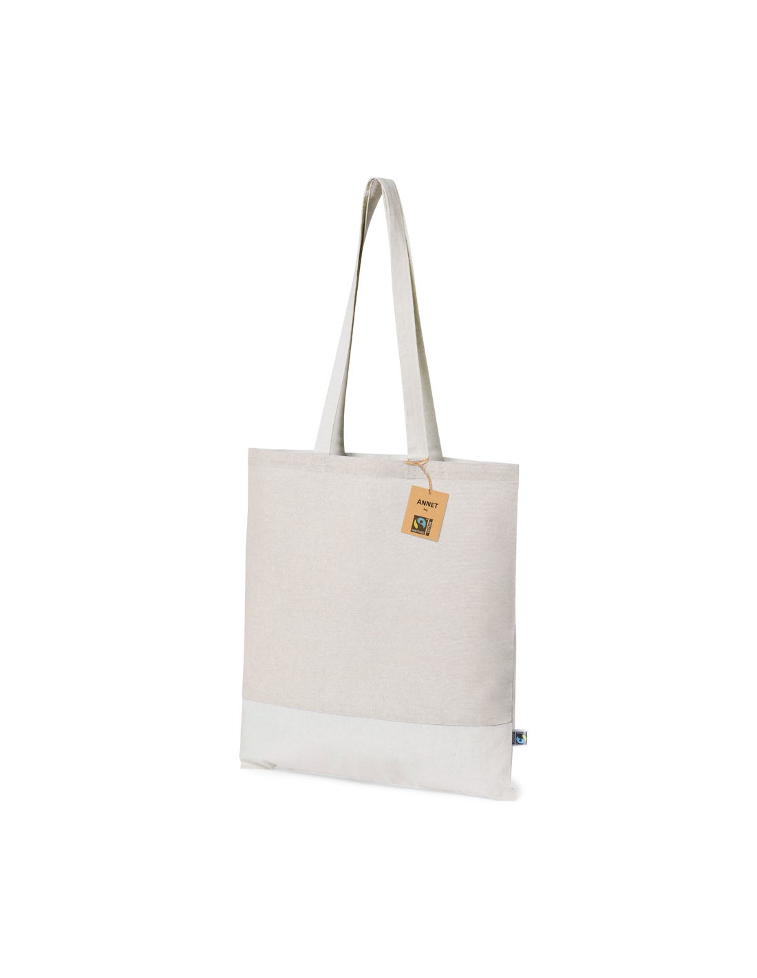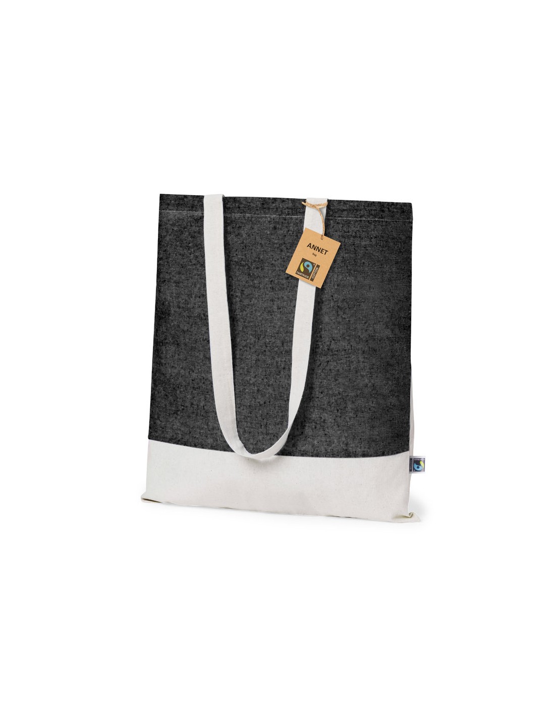 Bolsa de línea nature, fabricada en algodón 100% de 140g/m2. Con certificación Fairtrade (Comercio Justo), un sistema comercial solidario y alternativo al convencional que persigue el desarrollo de los pueblos y la lucha contra la pobreza. De acabado cosido y asas largas reforzadas con base en tono natural y parte frontal superior disponible en tonos negro y natural. Incluida etiqueta Fairtrade y hangtag distintivo en cartón reciclado.