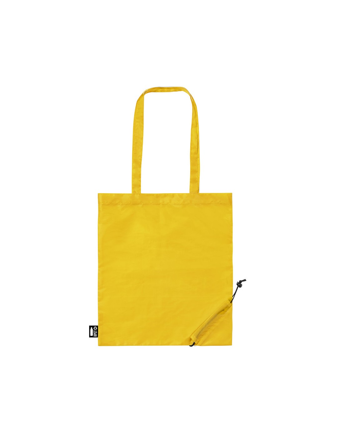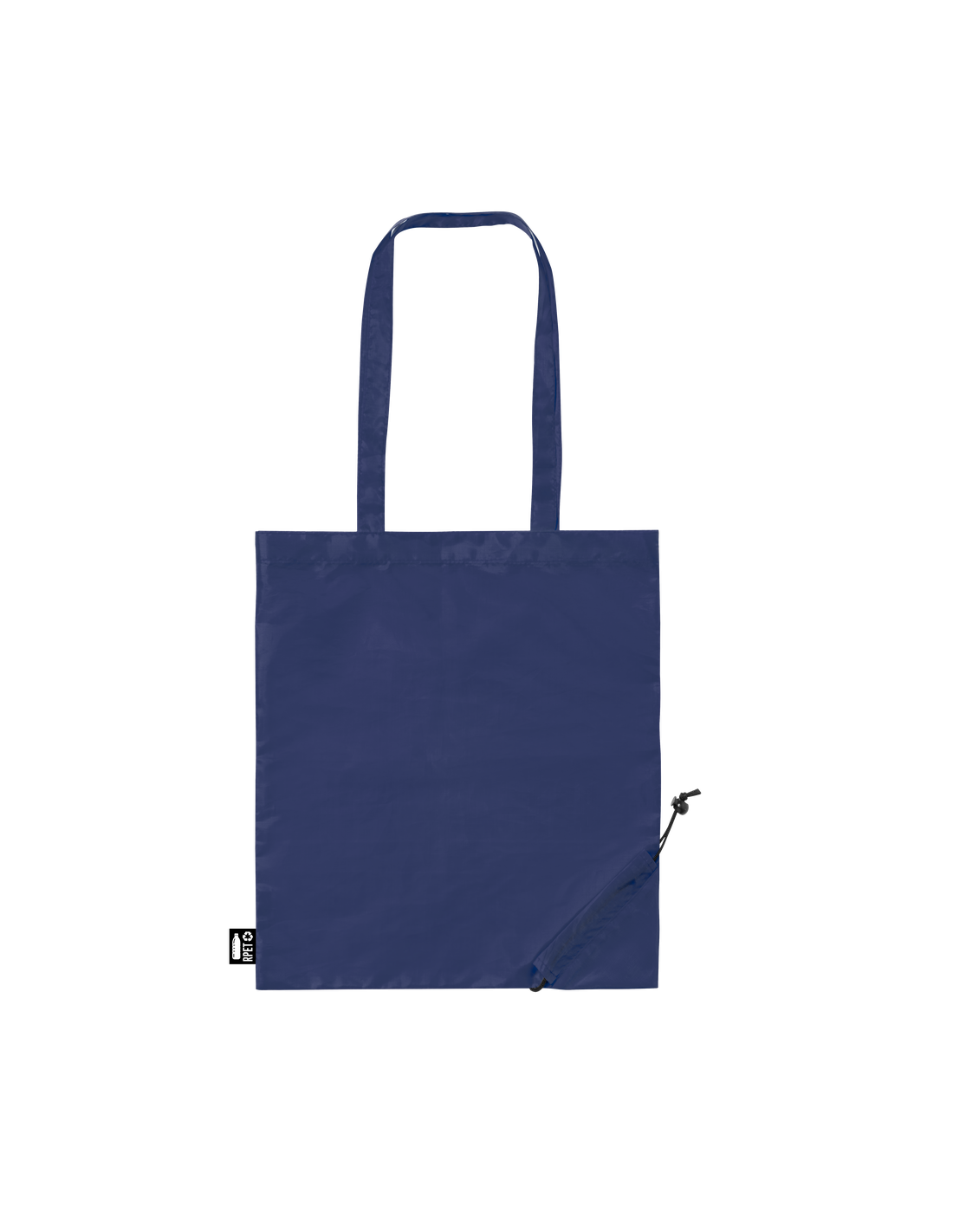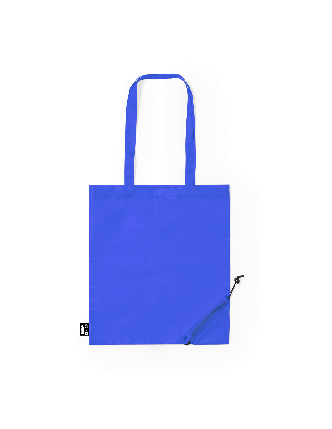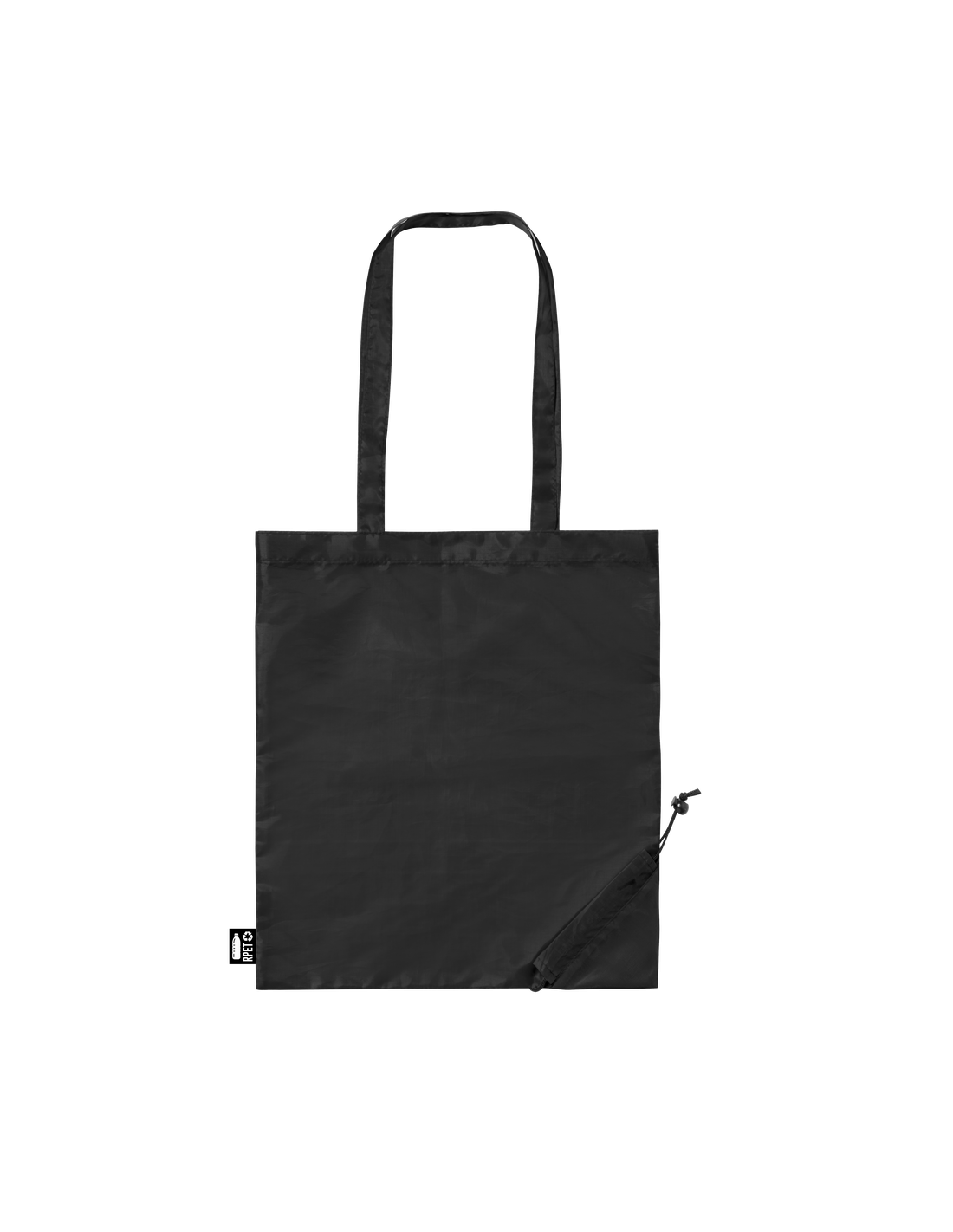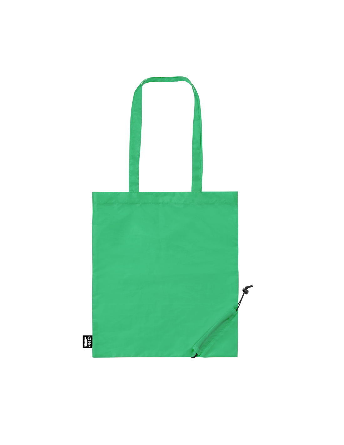 Bolsa plegable de línea nature fabricada en 190T RPET. De acabado cosido y con asas largas reforzadas (70 x 2,5cm). Plegado de pequeño tamaño mediante cordón con accesorio de ajuste. Disponible en variada gama de colores, con distintivo RPET en etiqueta exterior. Resistencia hasta 8 kg de peso. El material RPET se elabora a partir de plástico reciclado, para así fomentar la reutilización de residuos plásticos y ayudar a la sostenibilidad del planeta.