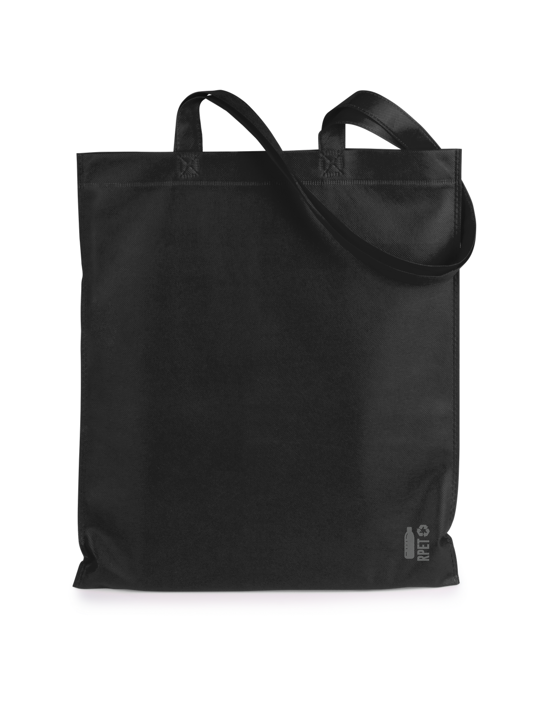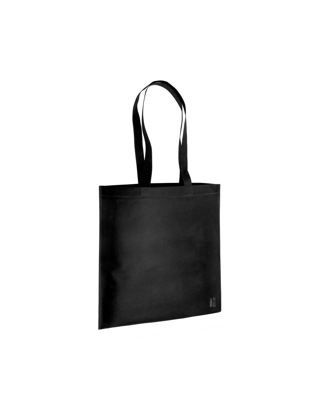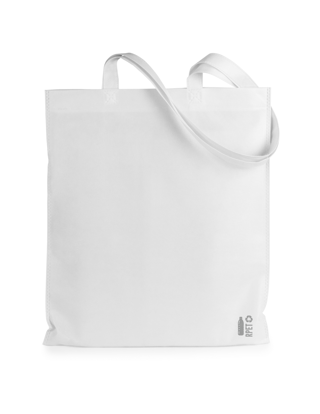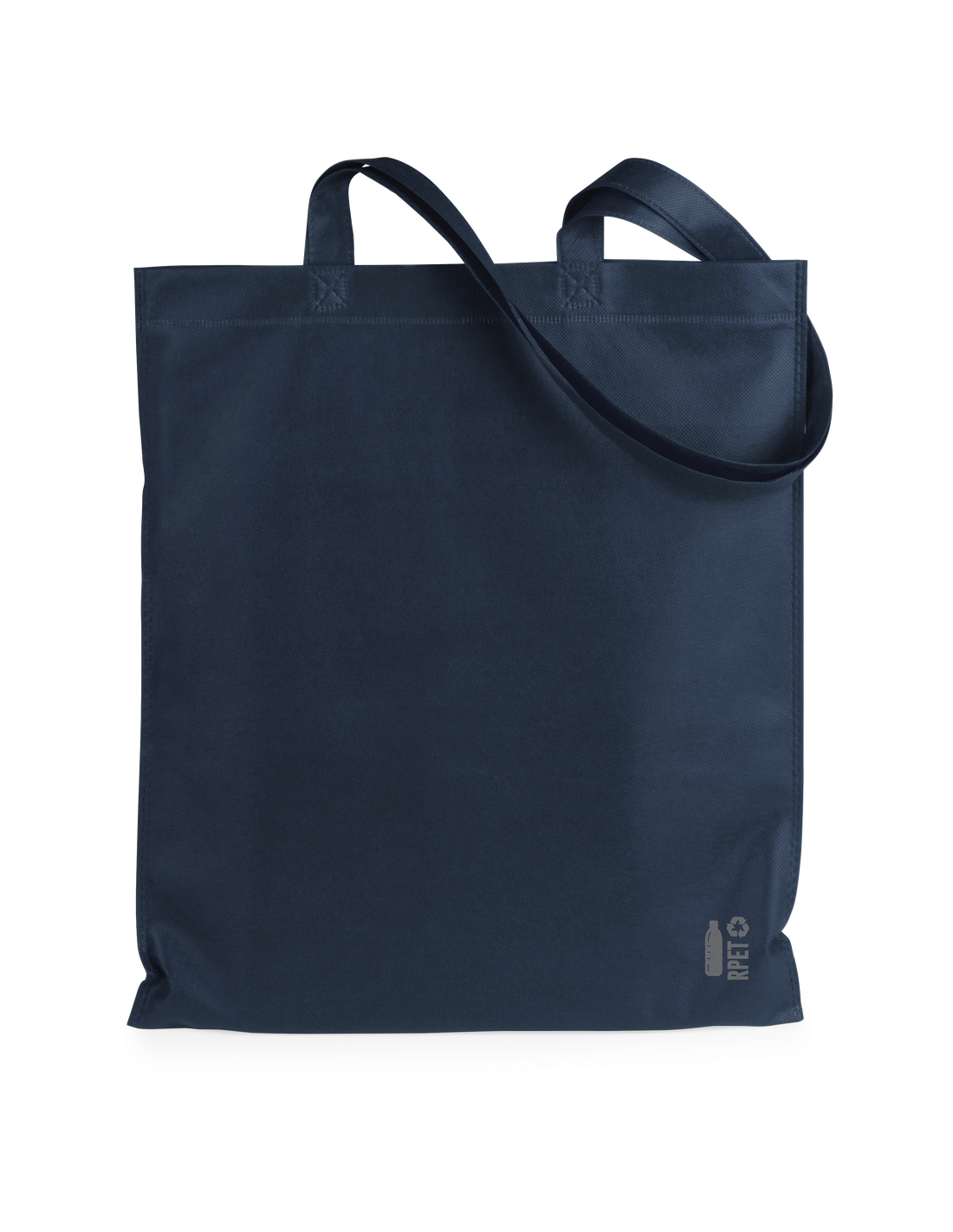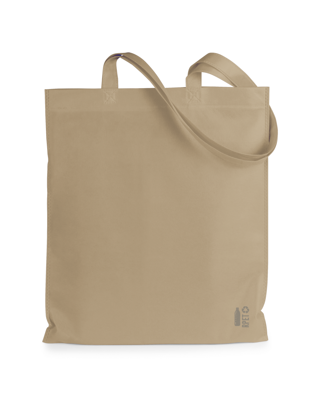 Bolsa de línea nature fabricada non-woven RPET de 70g/m2. De acabado termosellado y asas largas reforzadas (68 x 2,5cm). Disponible en variada gama de colores, con distintivo RPET en esquina inferior derecha. Resistencia hasta 5 kg de peso.El material RPET se elabora a partir de plástico reciclado, para así fomentar la reutilización de residuos plásticos y ayudar a la sostenibilidad del planeta.
