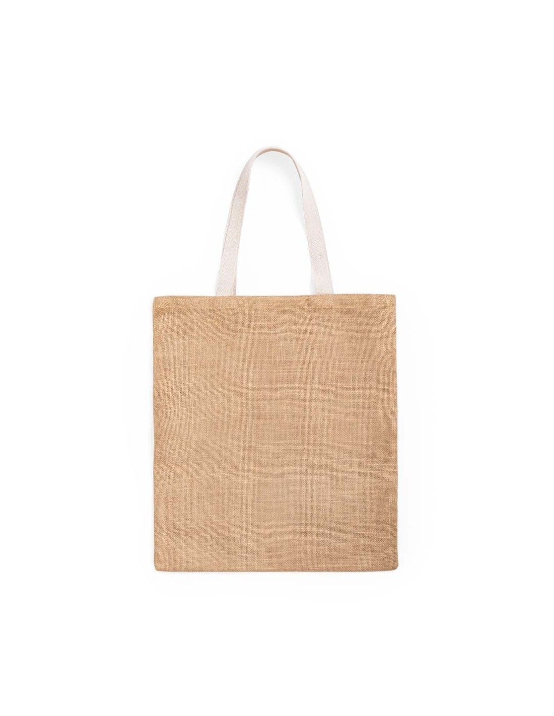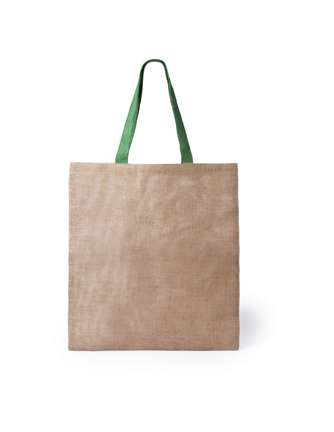 Bolsa ecológica de yute con cuerpo en color natural y asas medianas de 52cm en color verde. De acabado cosido y resistencia hasta 9kg de peso.