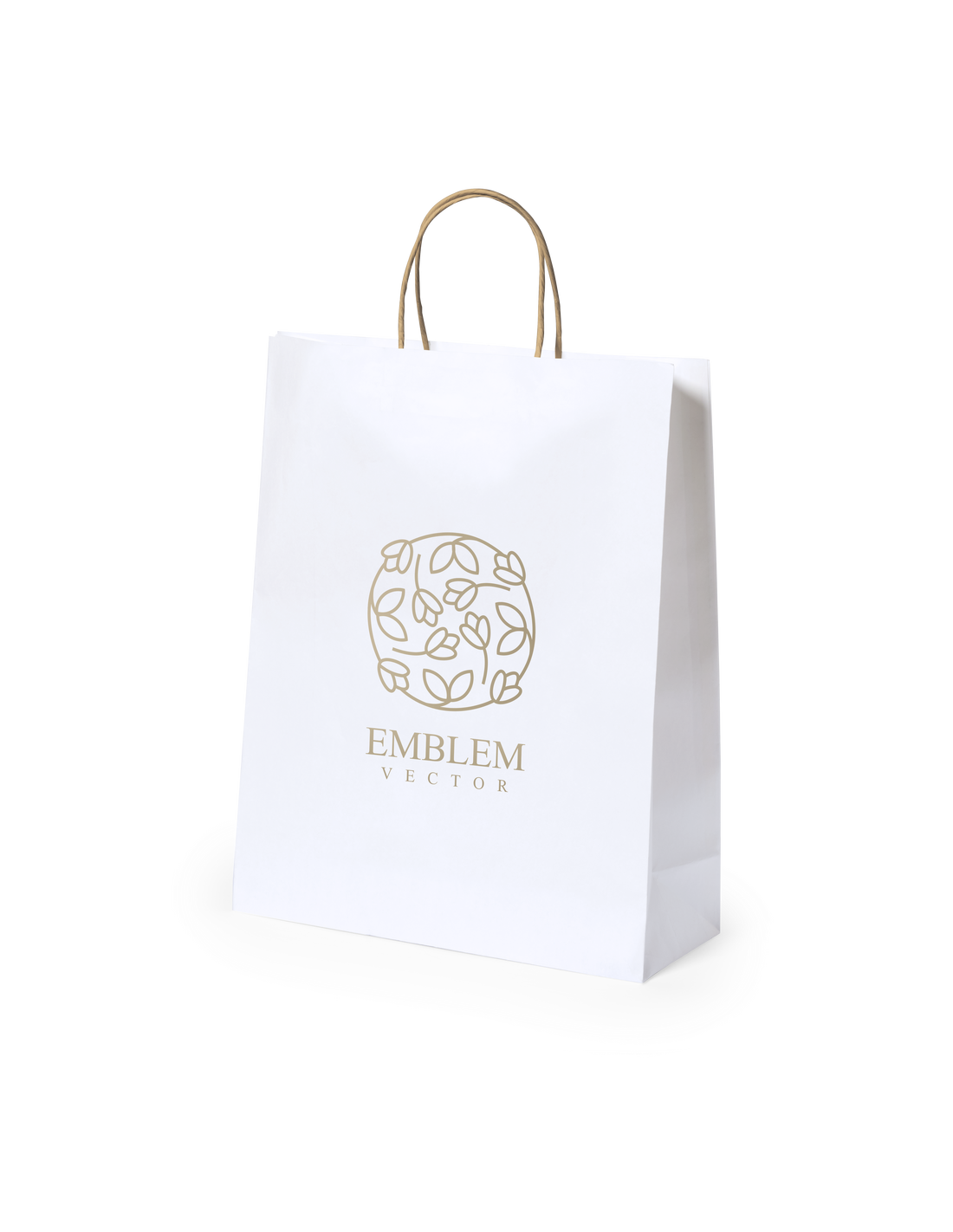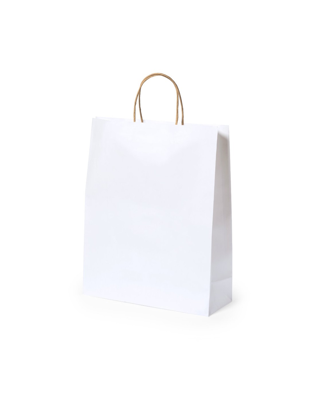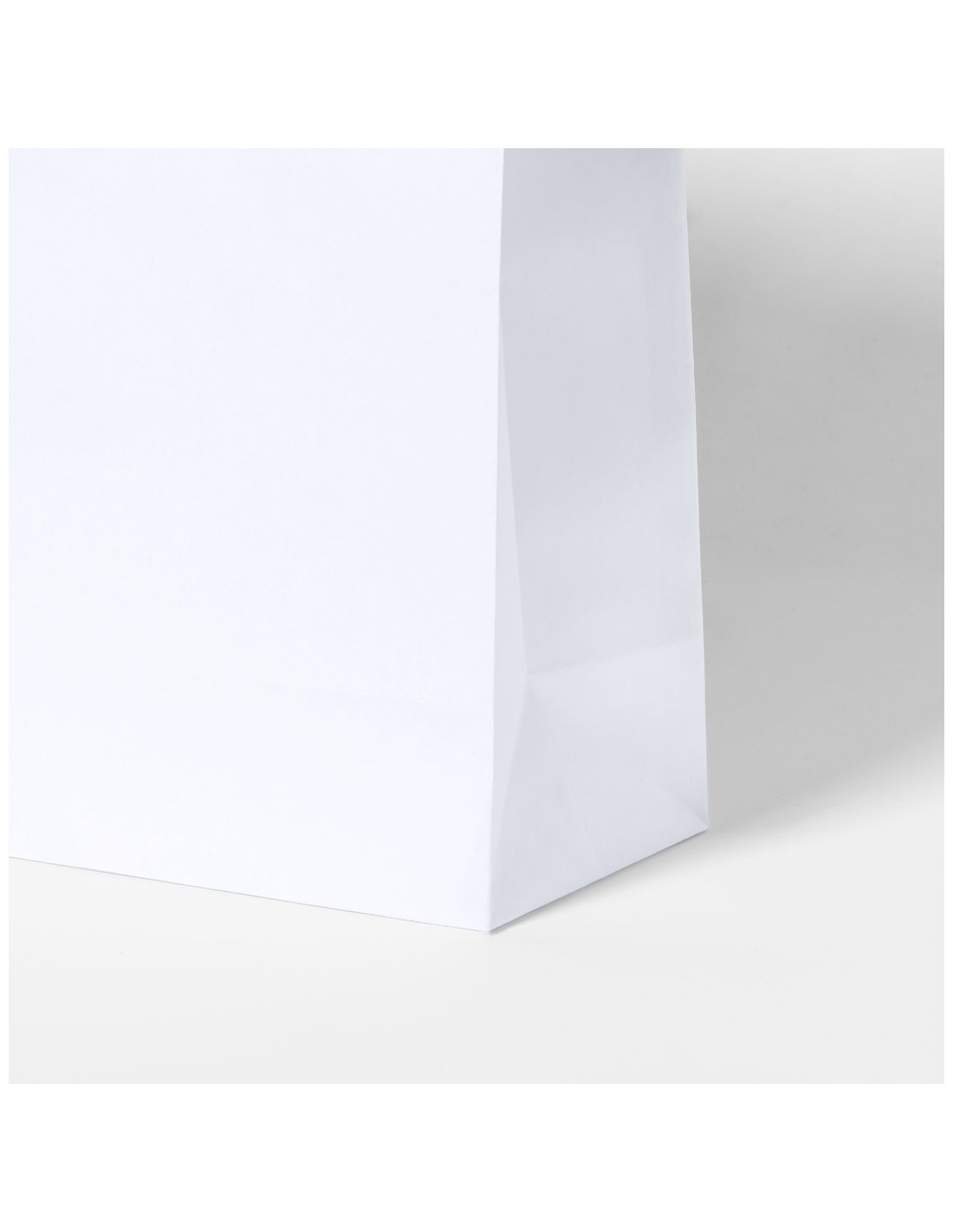 Bolsa de línea nature, fabricada en papel reciclado acabado en blanco de 100g/m2, con asas cortas reforzadas en tono natural y fuelle. Resistencia hasta 6 kg de peso.