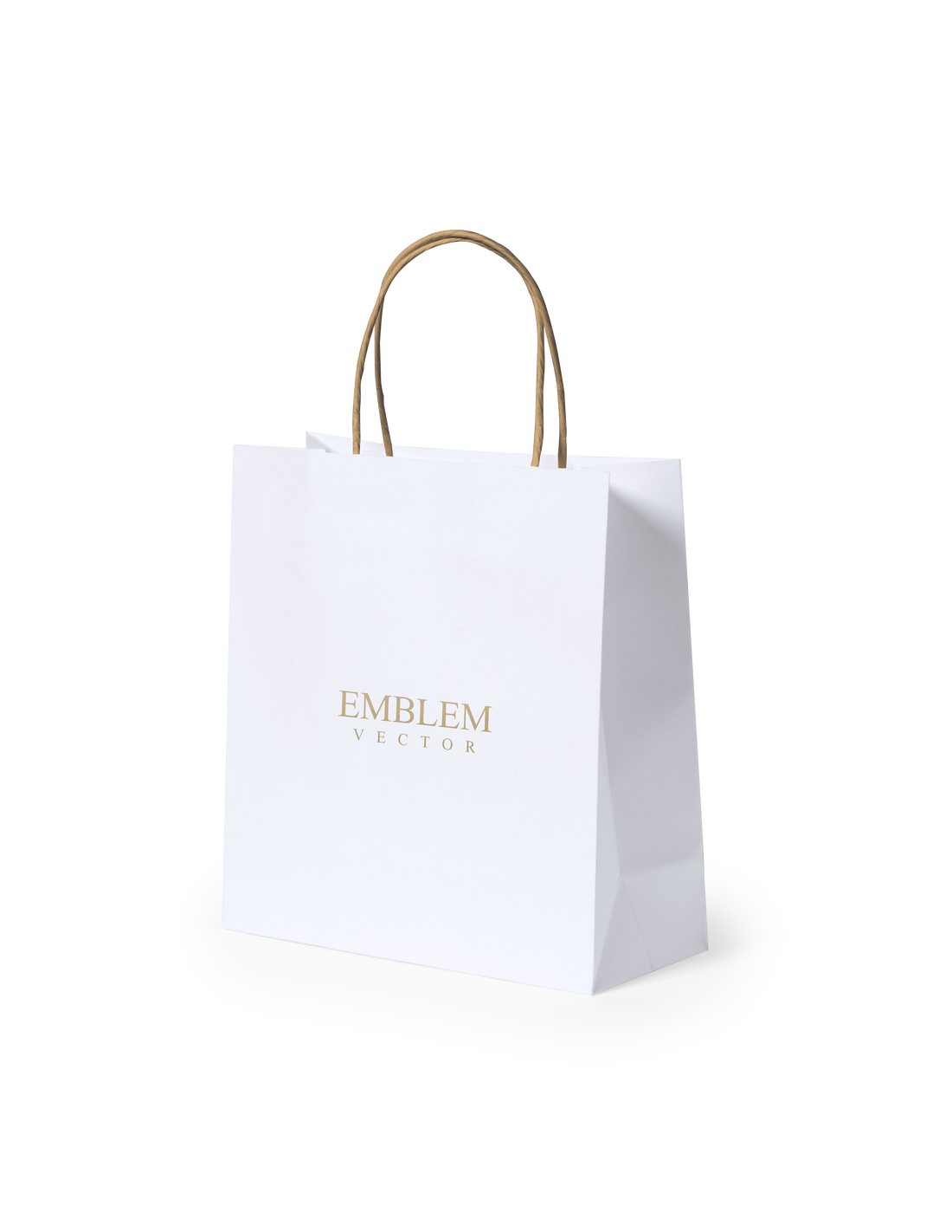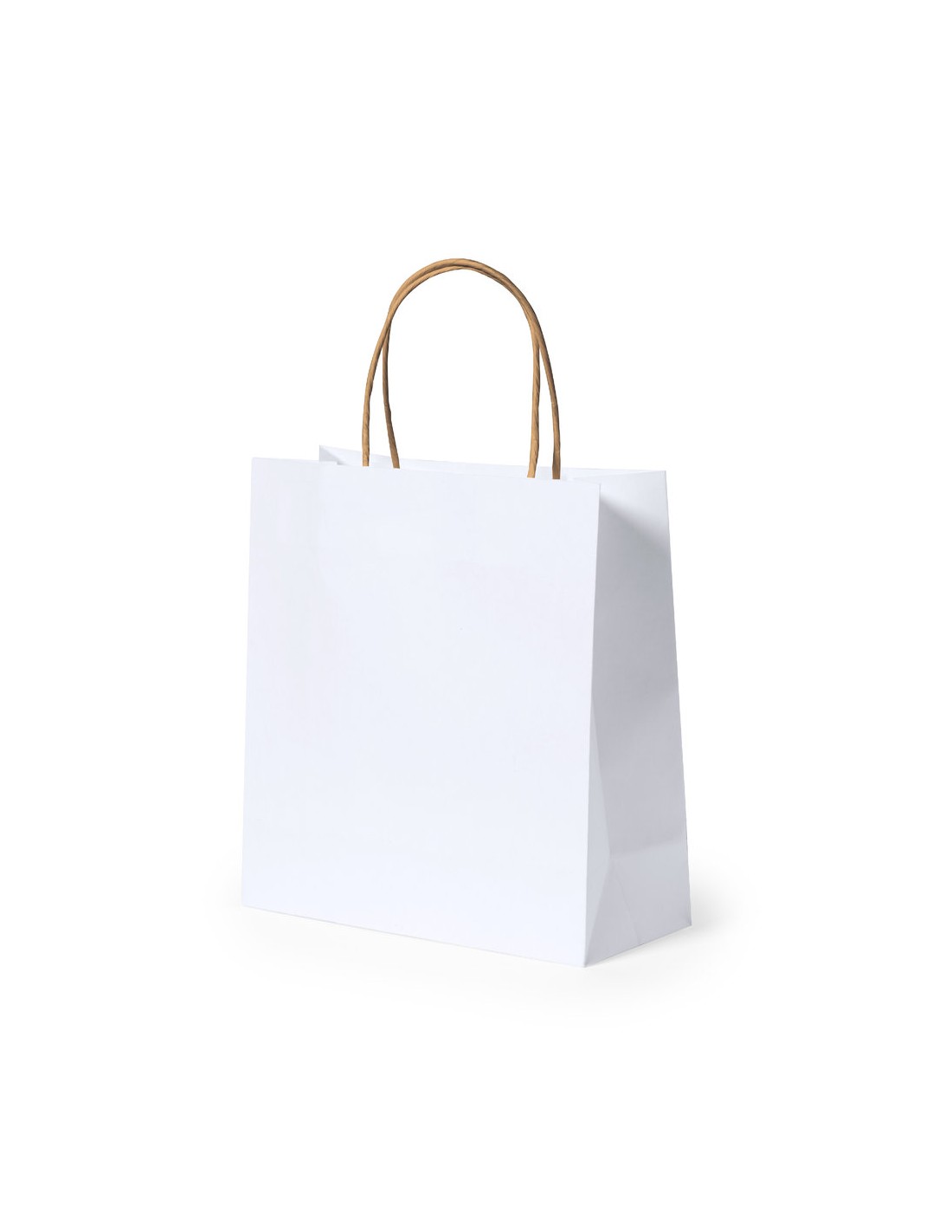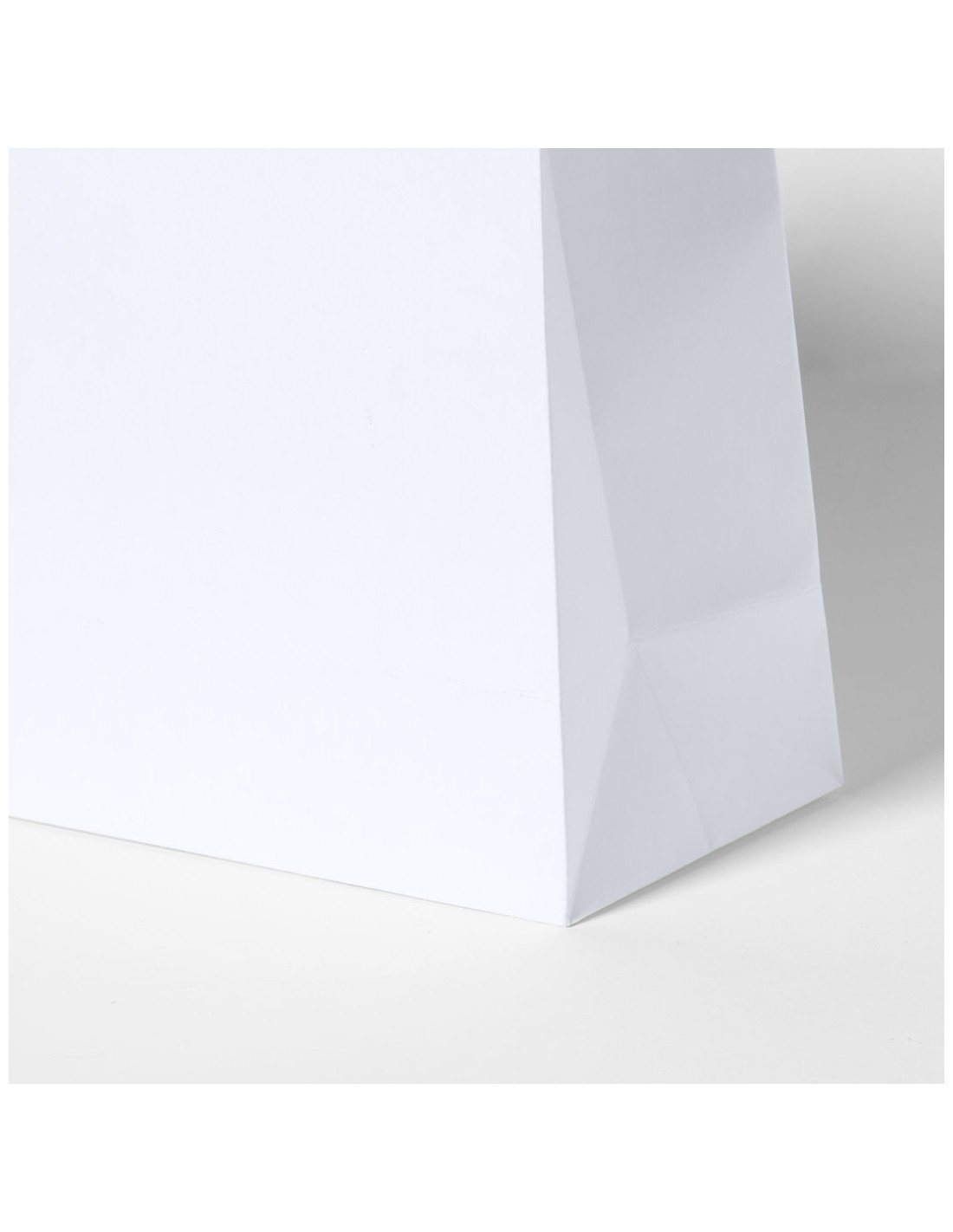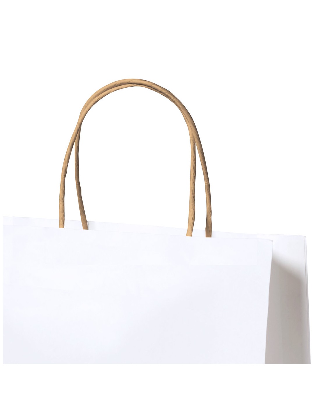 Bolsa de línea nature, fabricada en papel reciclado acabado en blanco de 100g/m2, con asas cortas reforzadas en tono natural y fuelle. Resistencia hasta 6 kg de peso.