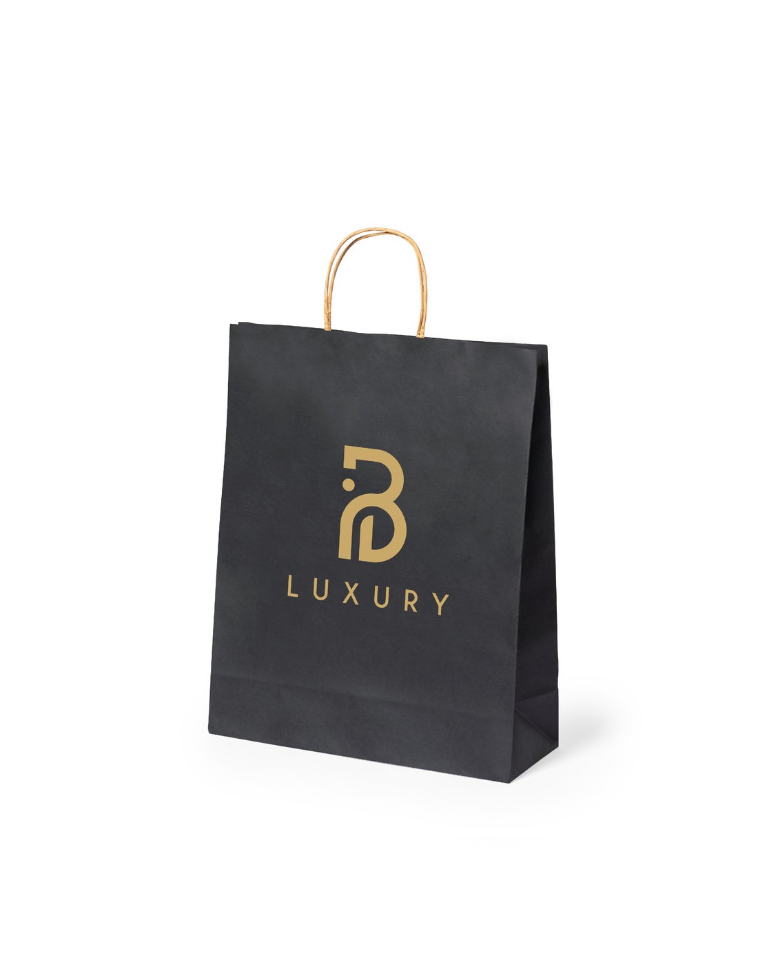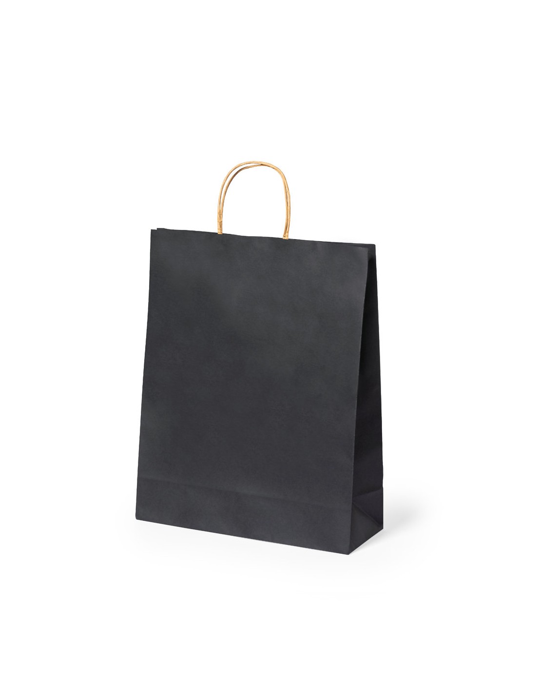 Bolsa de línea nature, fabricada en papel reciclado acabado en negro de 100g/m2, con asas cortas reforzadas en tono natural y fuelle. Resistencia hasta 6 kg de peso.