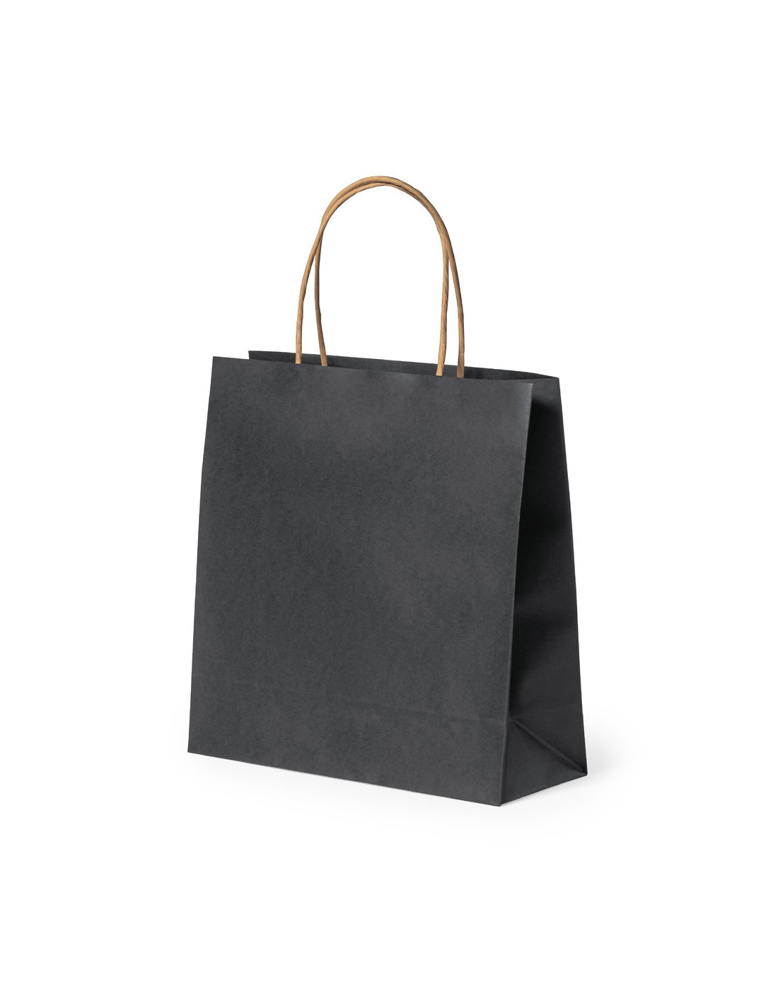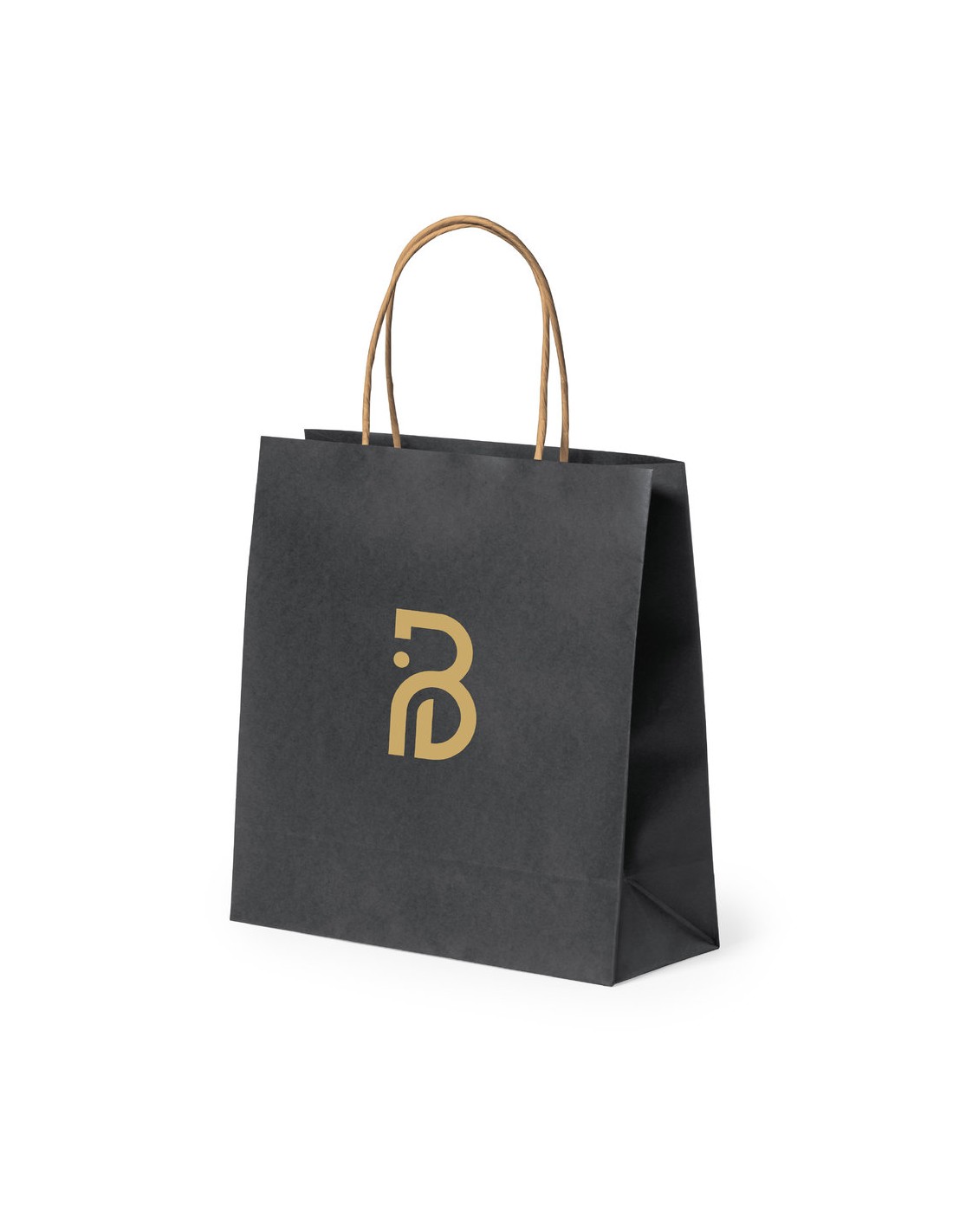 Bolsa de línea nature, fabricada en papel reciclado acabado en negro de 100g/m2, con asas cortas reforzadas en tono natural y fuelle. Resistencia hasta 6 kg de peso.
