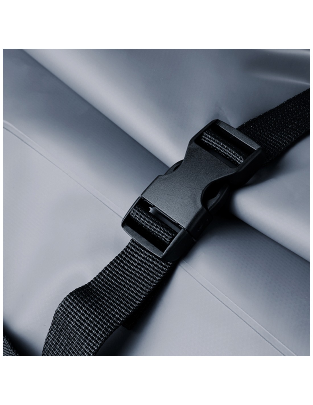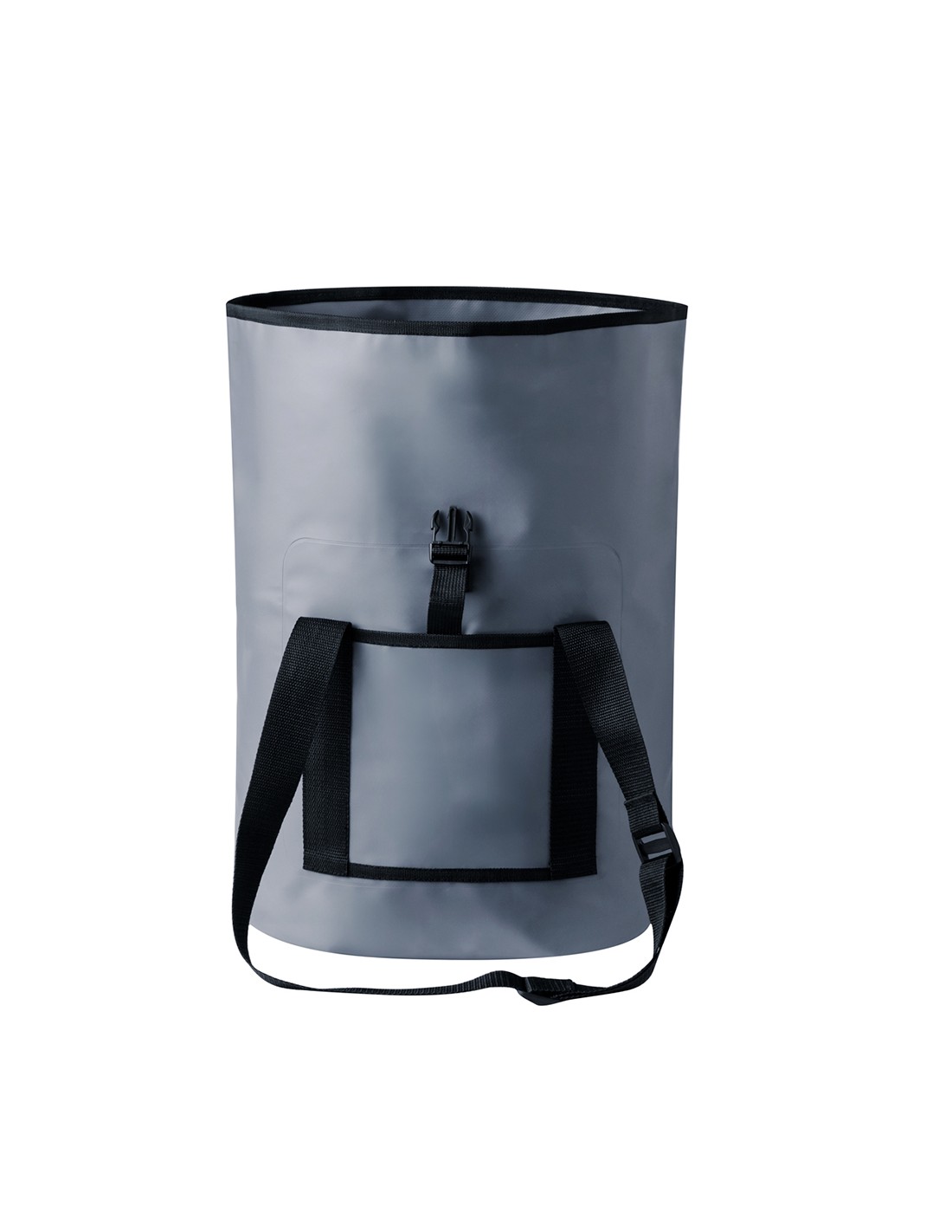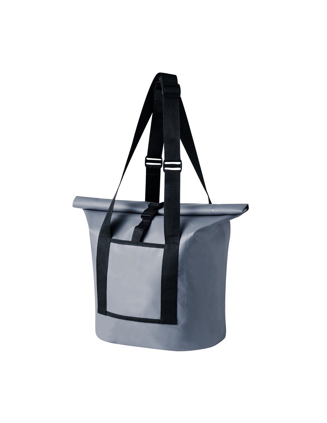Bolso impermeable de 25L de capacidad, confeccionado en resistente PVC. Compartimento principal con cierre de hebilla y asas ajustables para un cómodo transporte. Incluye bolsillo frontal abierto de fácil acceso. En elegante color gris con detalles en negro y presentado en bolsa individual reciclada.