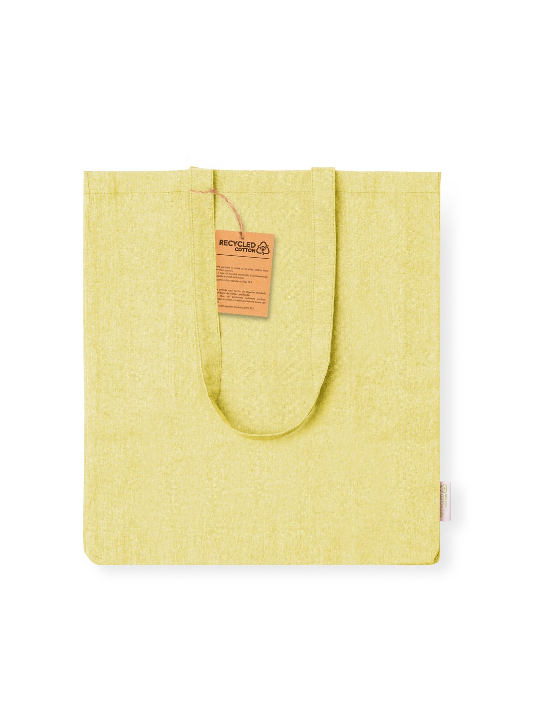 Bolsa en material 100% algodón reciclado de 140 g/m2. Asas largas de 70cm con refuerzo, de acabado cosido y fuelle. Logotipo en etiqueta lateral y resistencia hasta 8 kg de peso. Disponible en variada gama de colores nature.