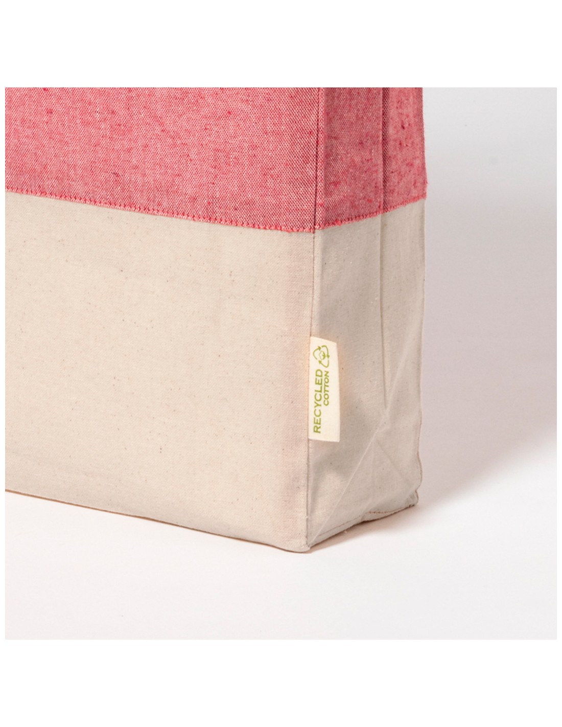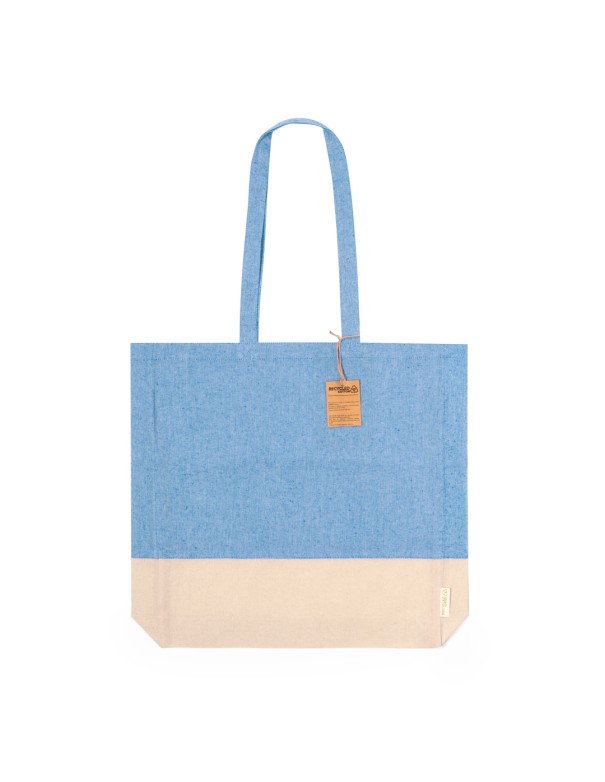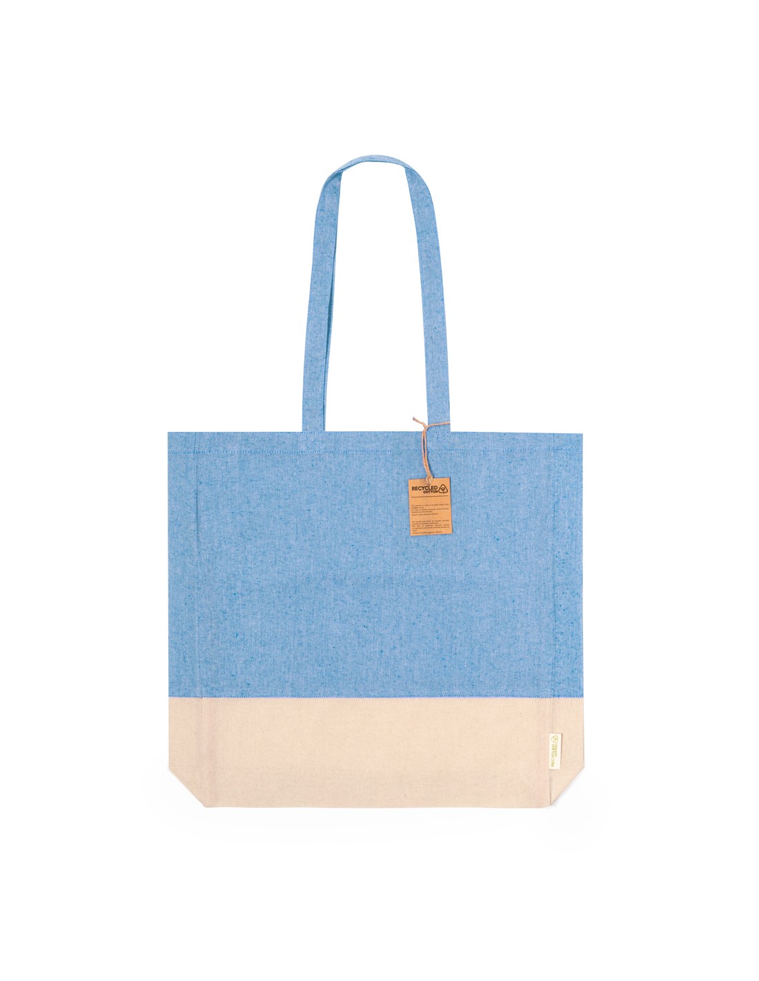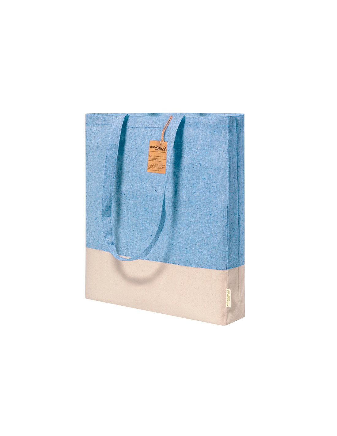Bolsa en material 100% algodón reciclado de 120 g/m2. Asas largas de 70cm con refuerzo, de acabado cosido y fuelle. Logotipo en etiqueta lateral y resistencia hasta 8 kg de peso. Disponible en variada gama de colores nature con base de color natural.