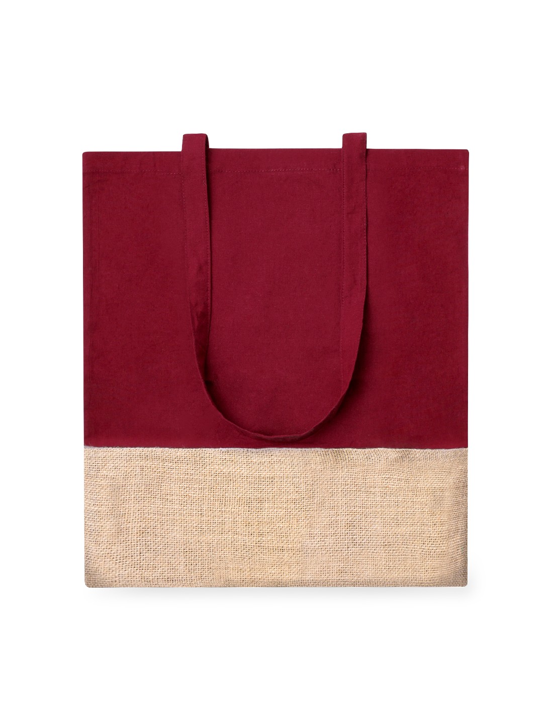 Bolsa de asas en material 100% algodón de 120 g/m2 en combinación con yute. Confortables asas planas y disponible en varios colores. Resistencia hasta 8kg de peso.
