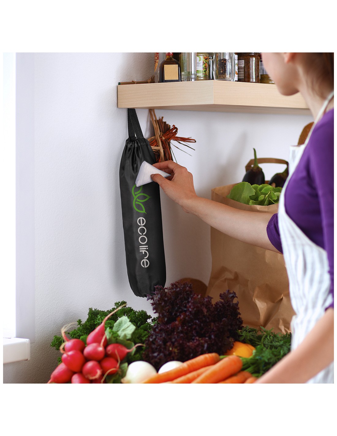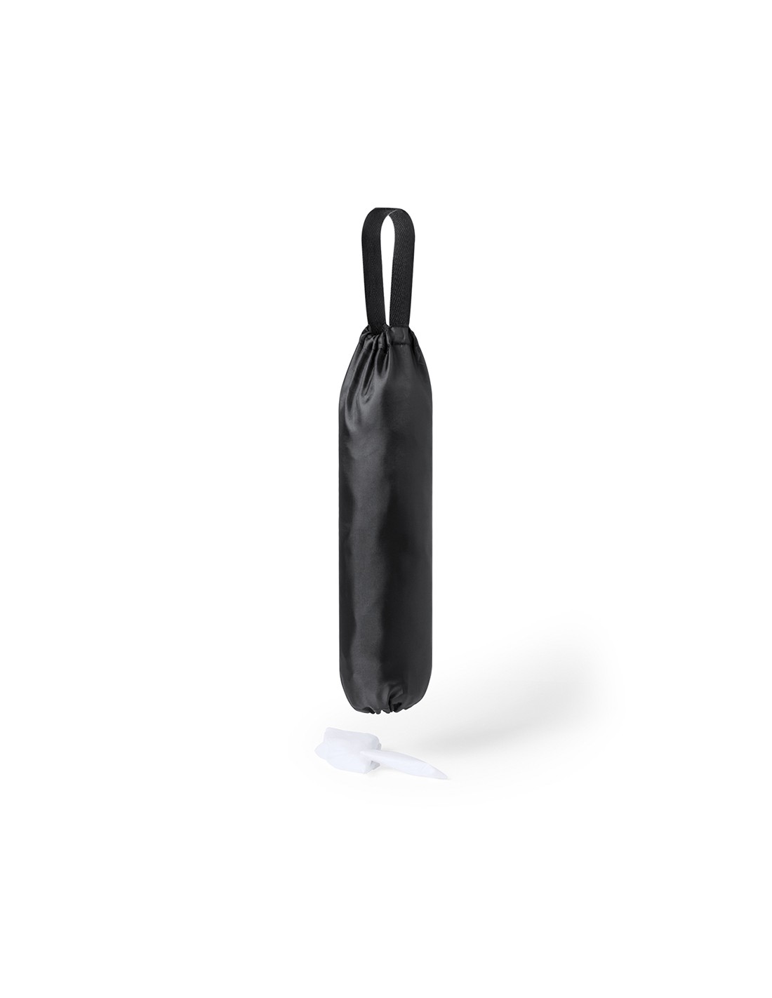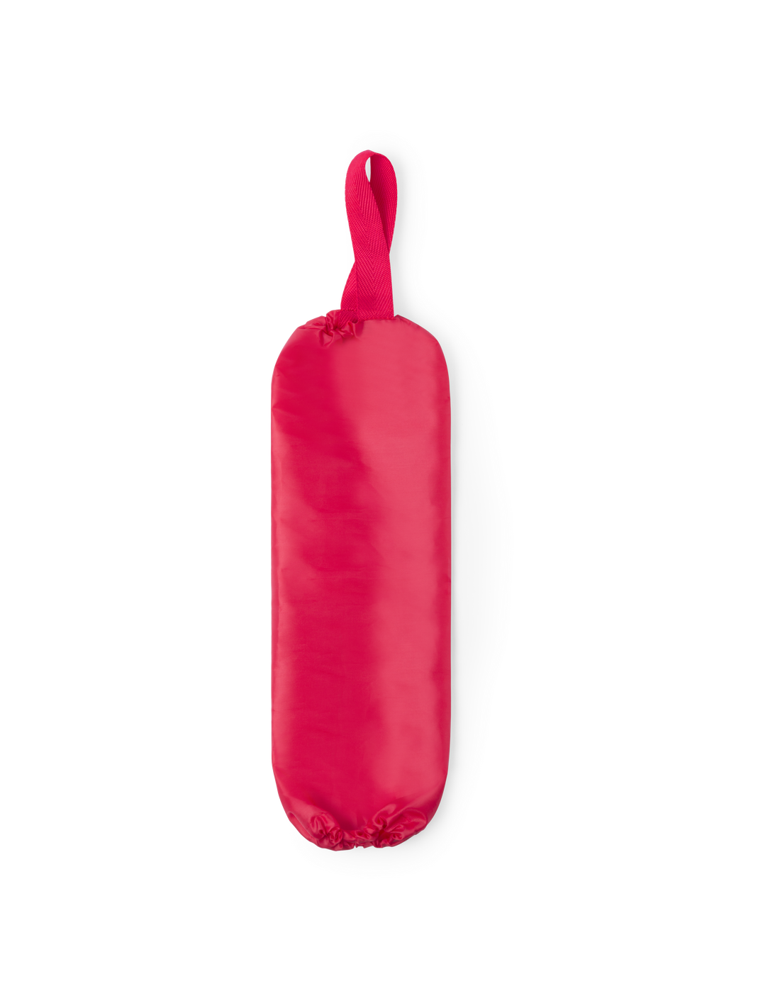 Bolsa de reciclaje para guardar bolsas de plástico. En suave poliéster 210D de alegres colores y con apertura superior e inferior. Con cinta a juego para colgar.