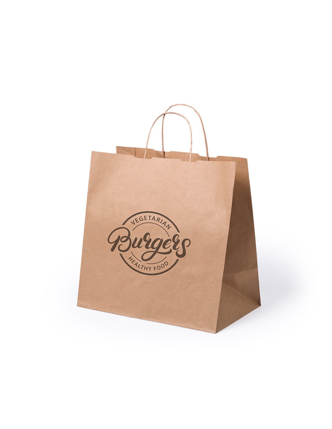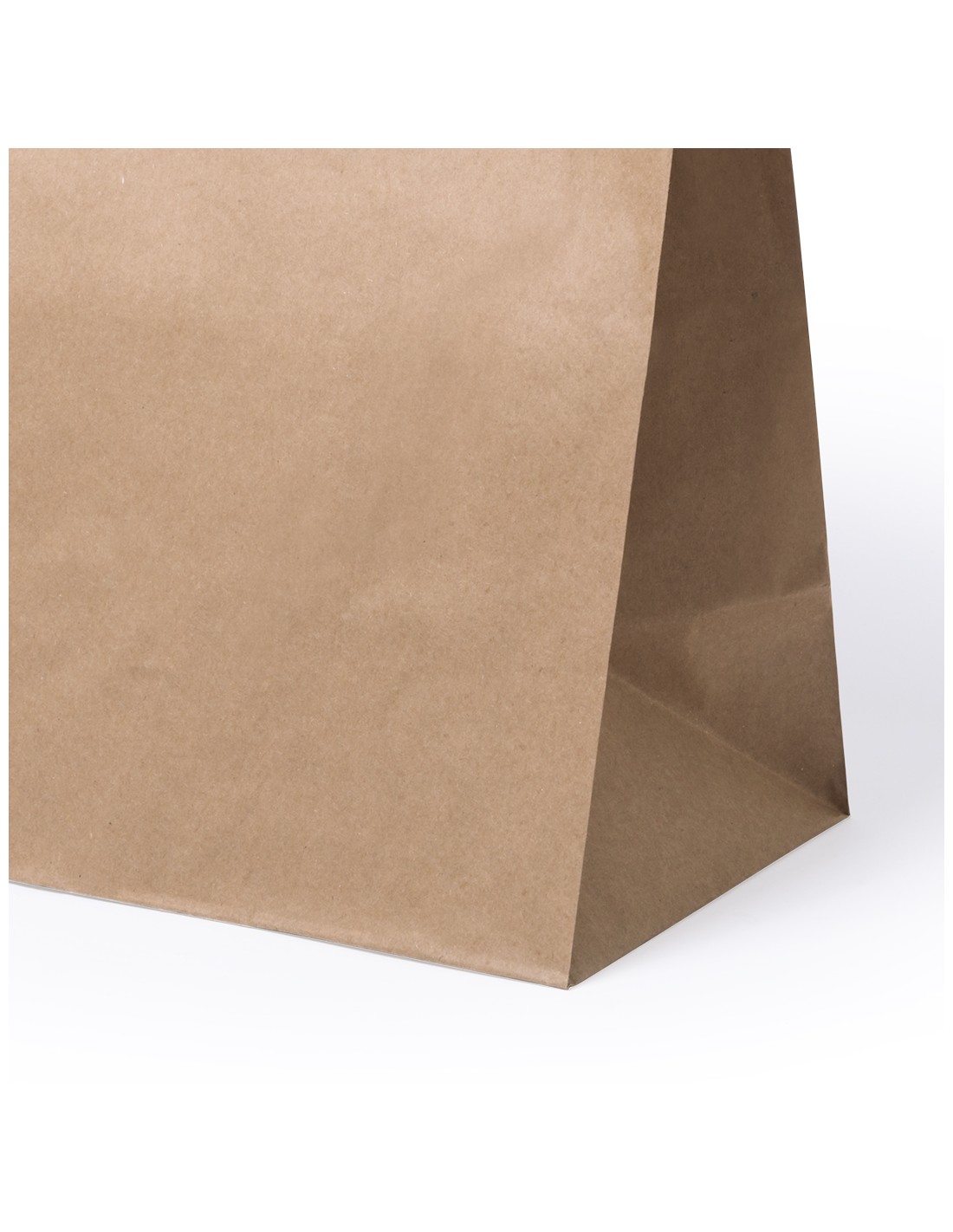 Bolsa en papel de acabado natural de 80g/m2 con asas cortas reforzadas y fuelle. Resistencia hasta 5kg de peso.