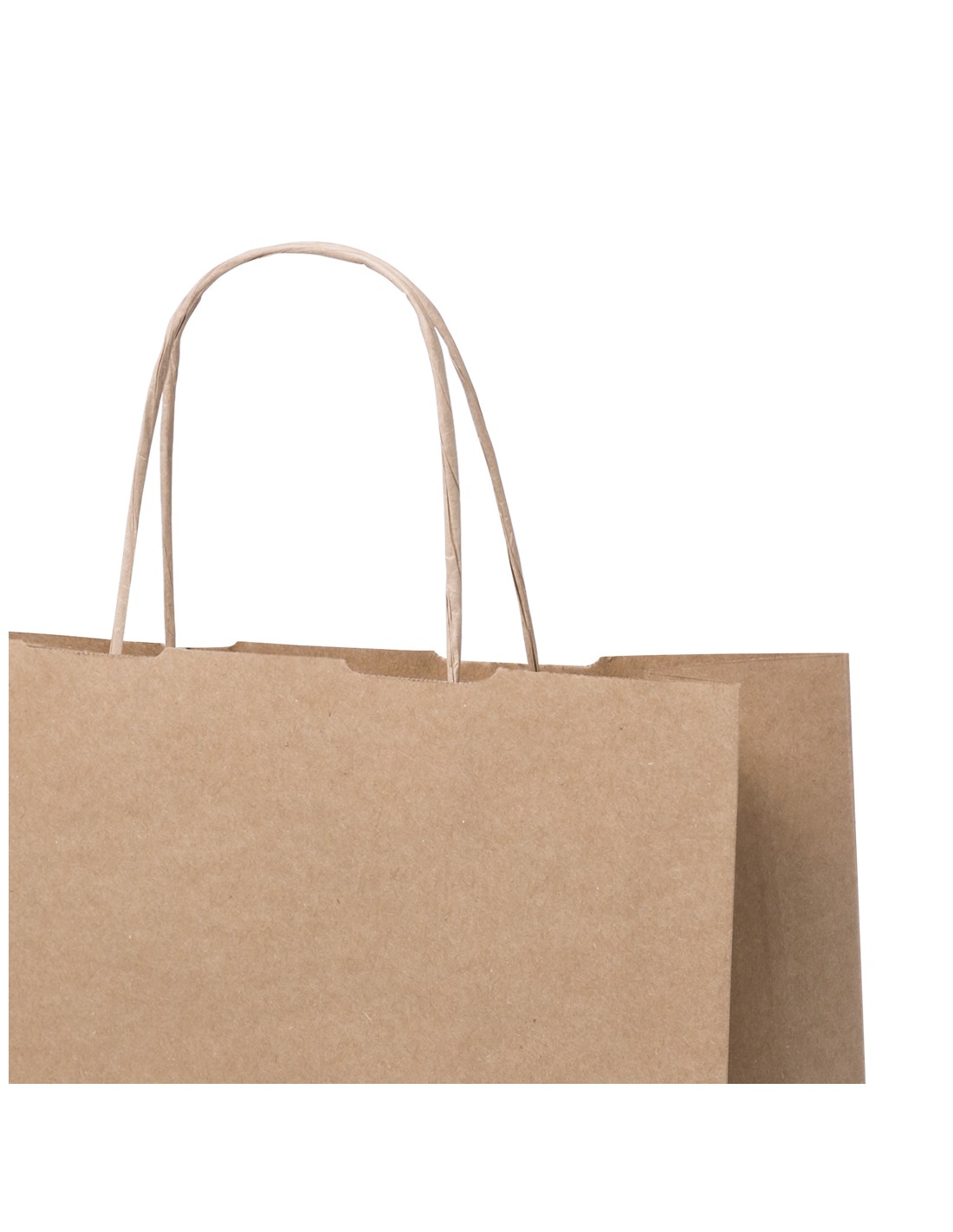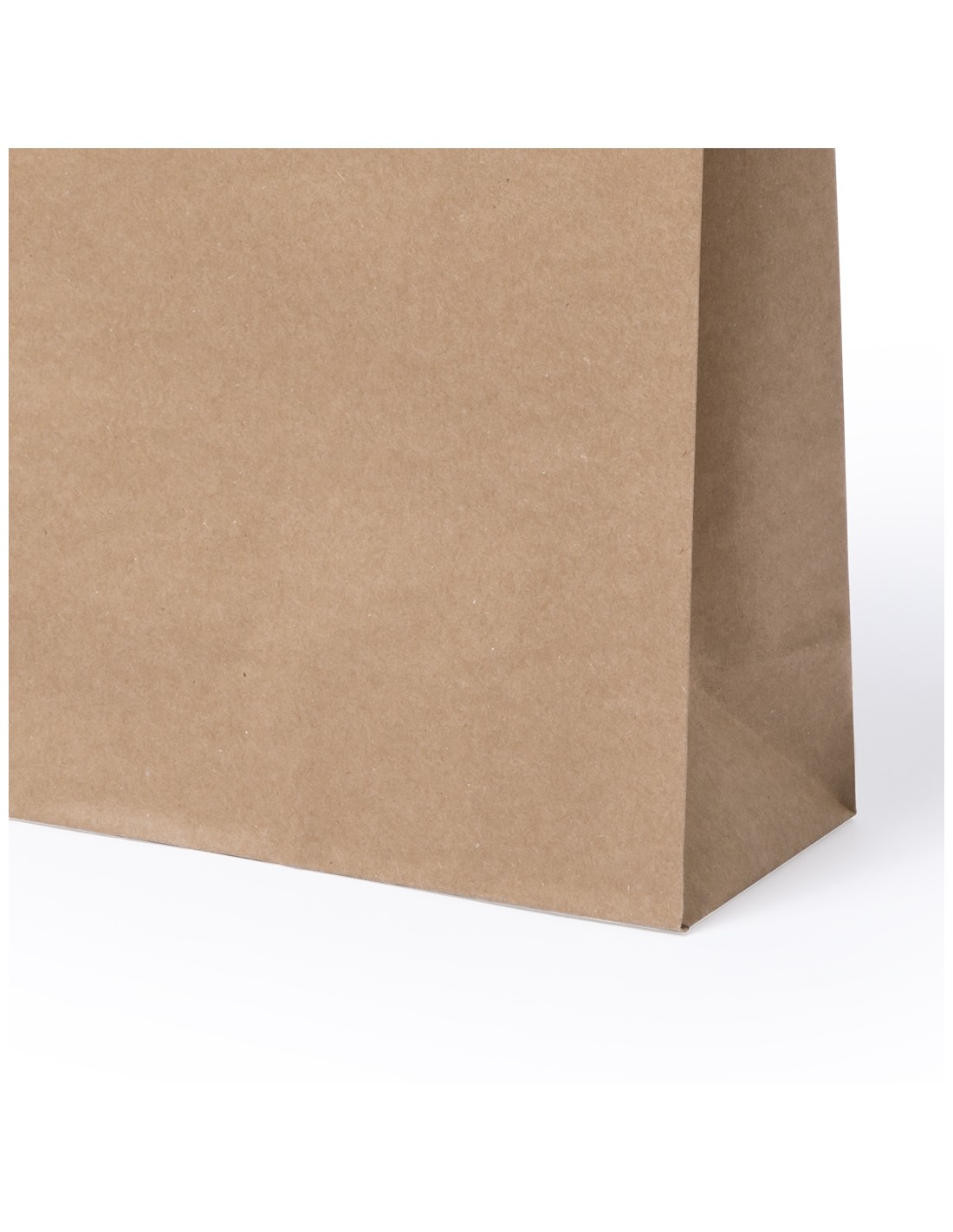 Bolsa en papel de acabado natural de 100g/m2 con asas cortas reforzadas y fuelle. Resistencia hasta 7kg de peso.