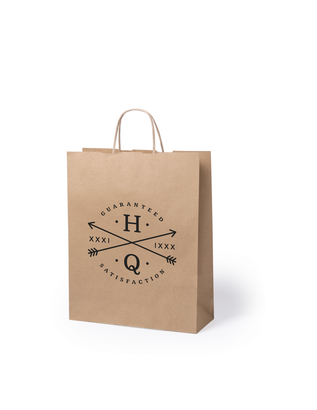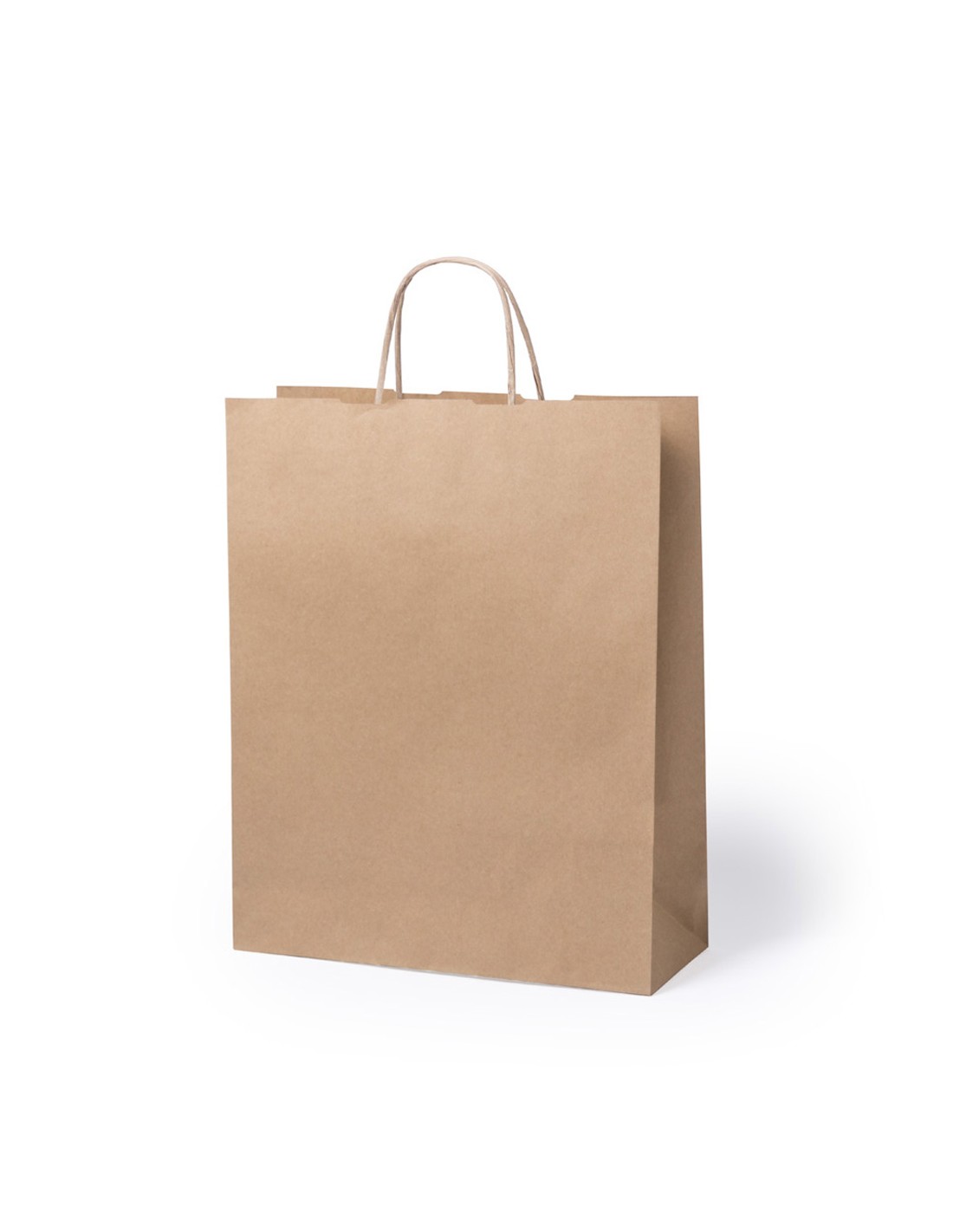 Bolsa en papel de acabado natural de 100g/m2 con asas cortas reforzadas y fuelle. Resistencia hasta 7kg de peso.