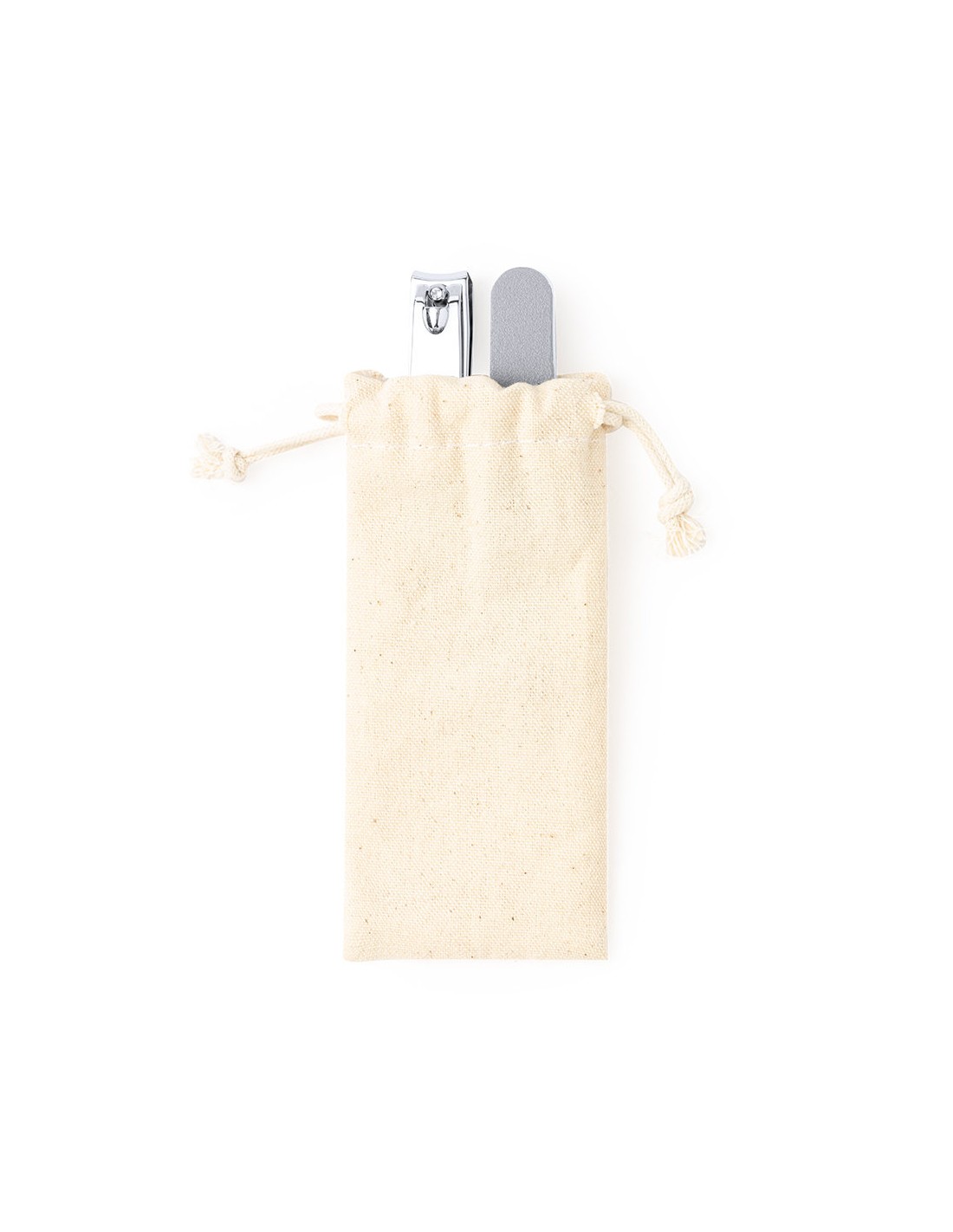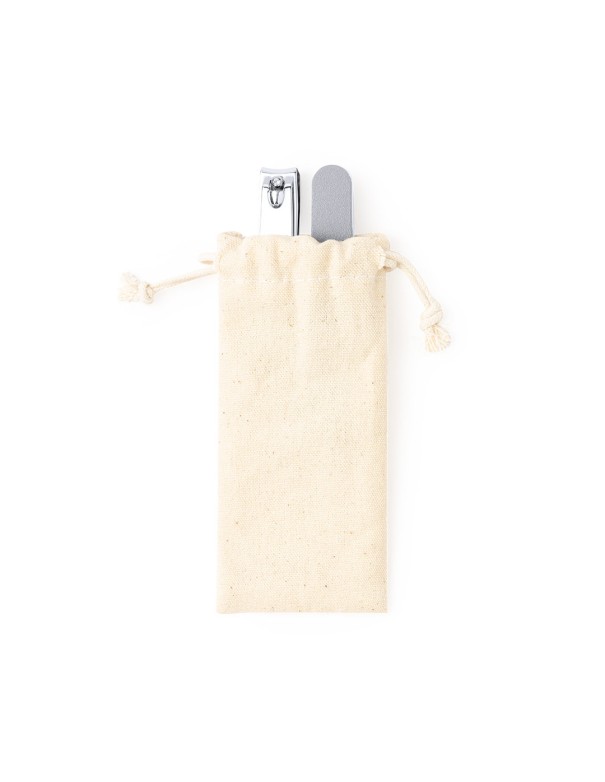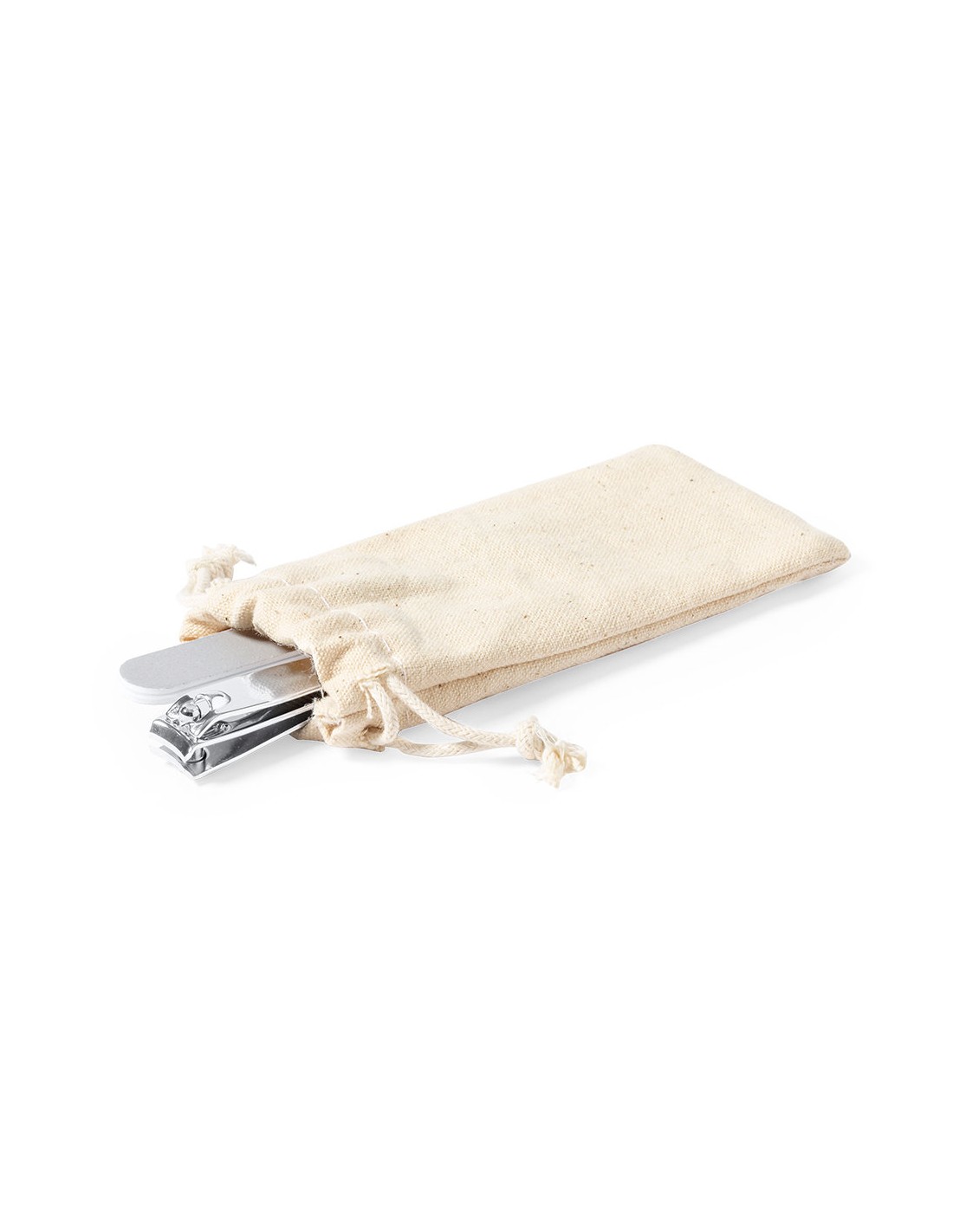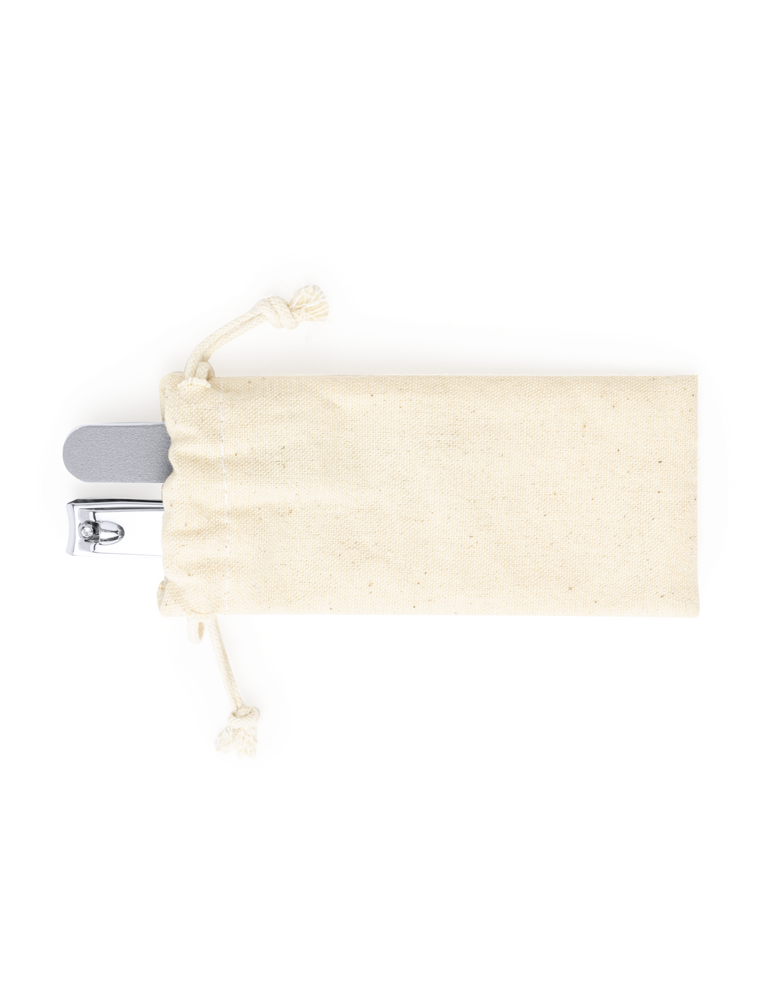 Set de manicura con cortauñas y lima. Presentado en bolsita individual con cordones de cierre en algodón crudo.