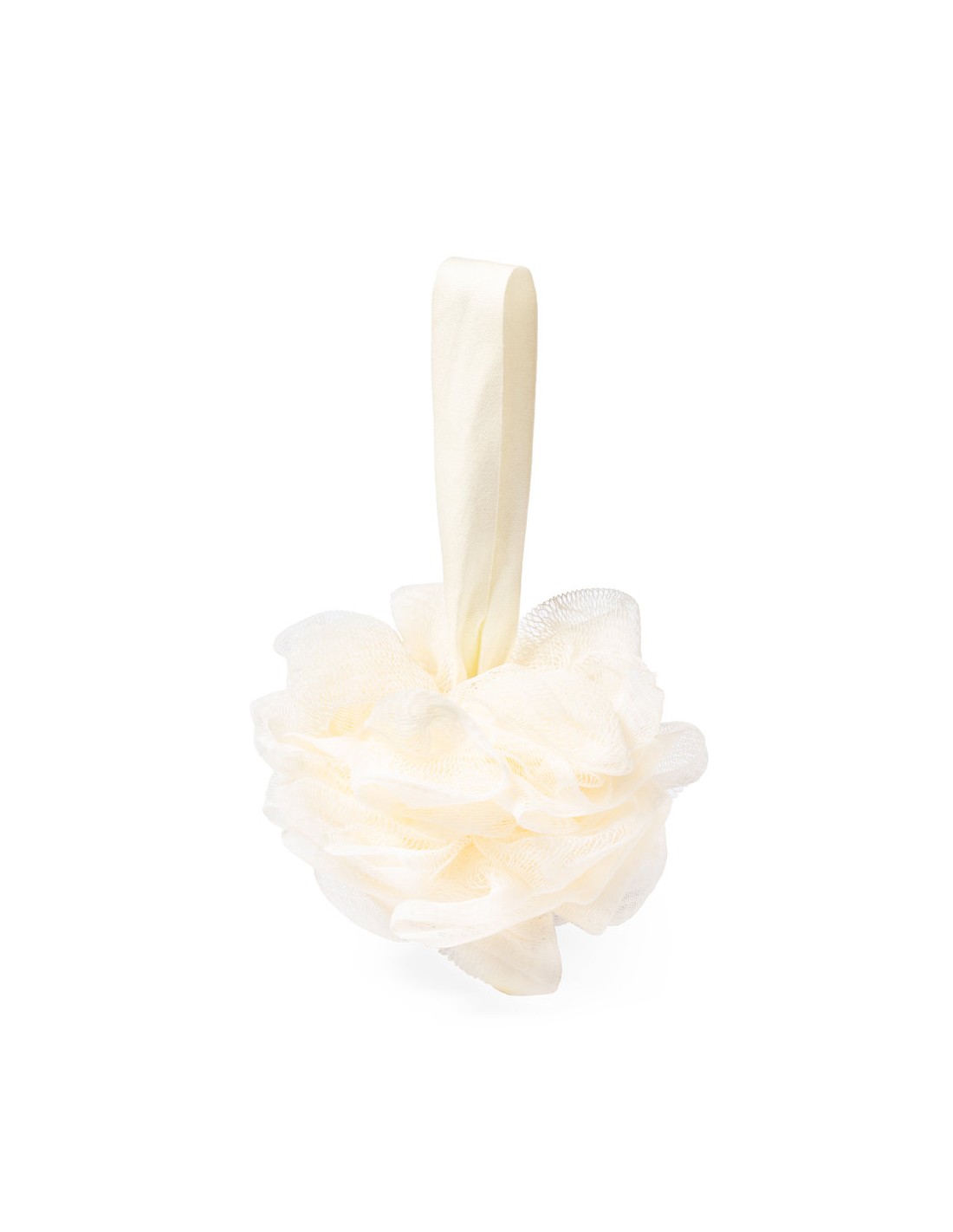 Suave esponja de baño en fibra de PE, con cinta de sujeción a juego y amplia superficie de marcaje.