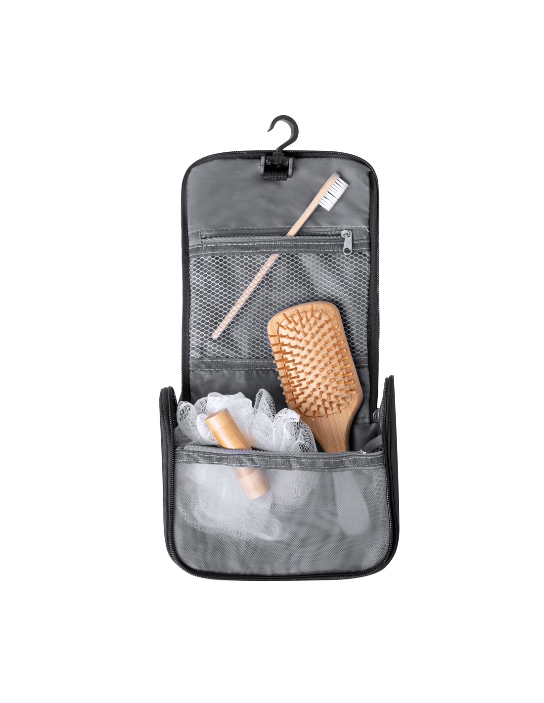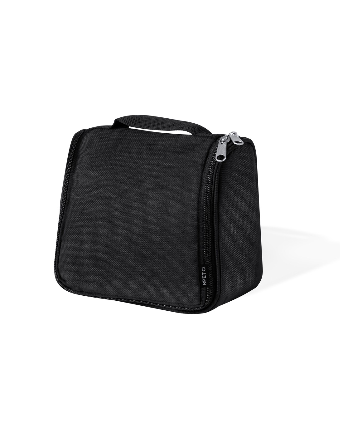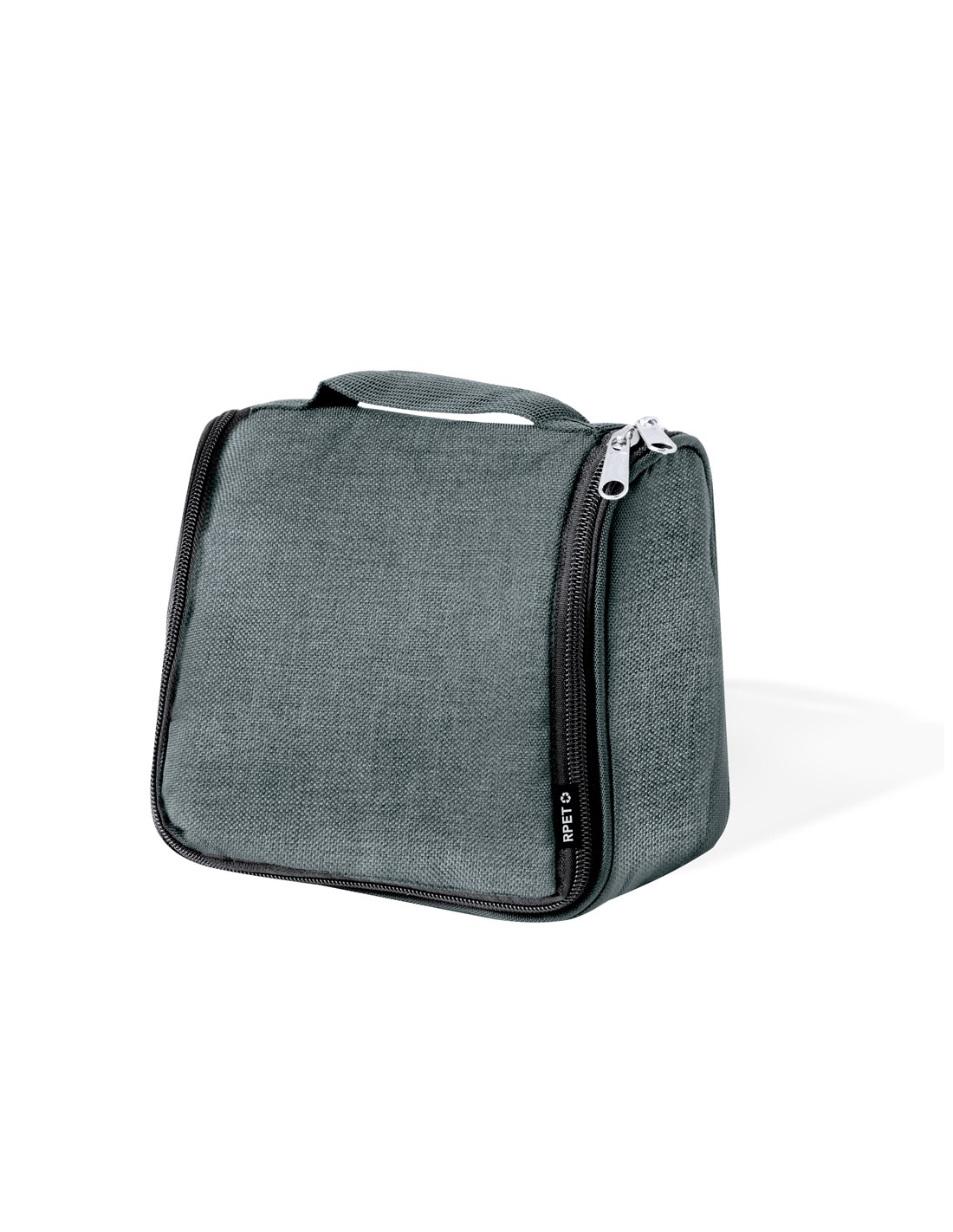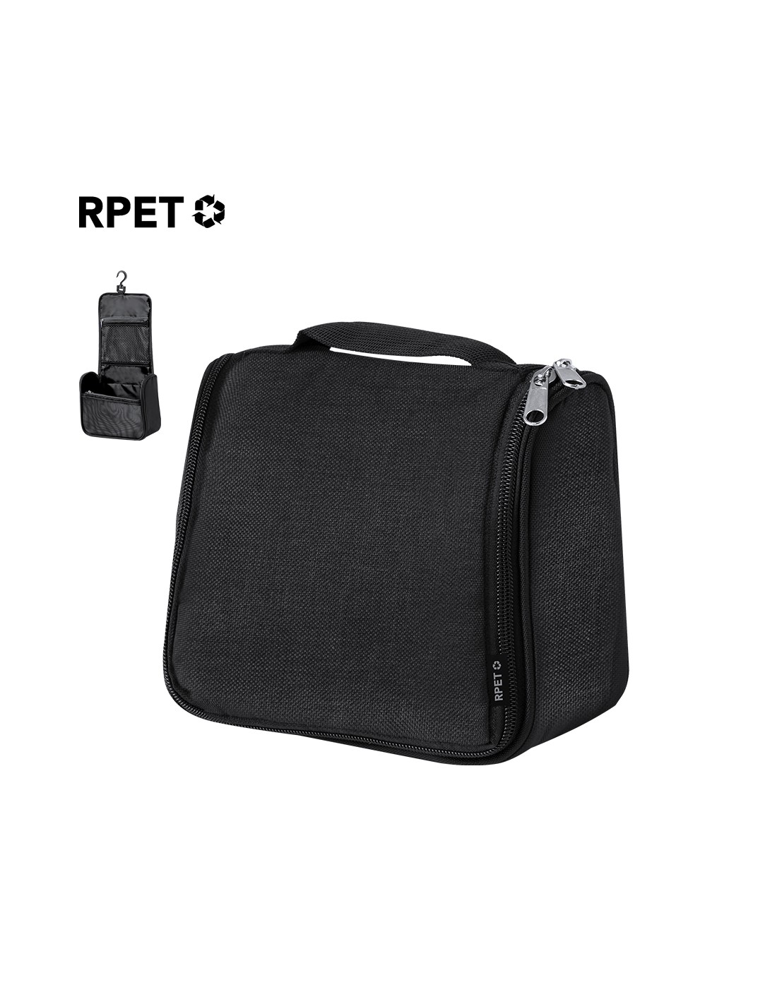 Neceser fabricado en RPET para guardar los objetos de higiene personal, con práctico gancho para poder sujetarlo en cualquier sitio. Práctico Interior con bolsillos de redecilla transpirables, que permiten ver los objetos que hay dentro. Con logotipo RPET en etiqueta. Disponible en varios colores y presentado en una bolsa individual reciclada. El material RPET se elabora a partir de plástico reciclado, para así fomentar la reutilización de residuos plásticos y ayudar a la sostenibilidad del planeta.