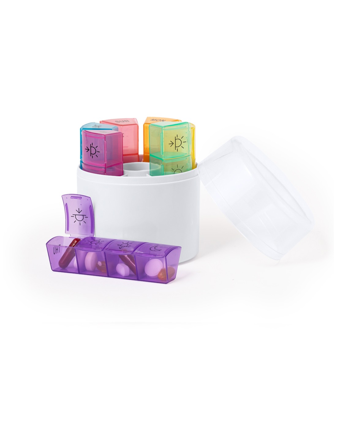 Compacto pastillero semanal. Estuche en forma de cilindro con 7 compartimentos diferenciados por colores y siglas para identificar rápidamente el día de la semana. Cada compartimento está dividido en 4 casillas independientes correspondientes a cada parte del día. Presentado individualmente en bolsa reciclada.