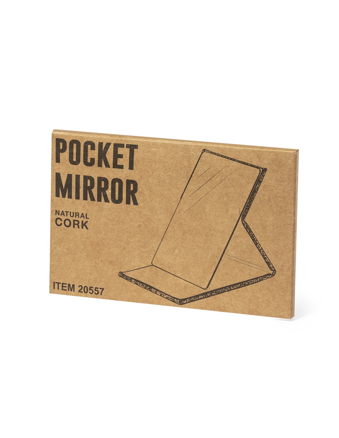 Espejo plegable 1X fabricado en corcho. Práctico espejo portátil recubierto de suave corcho con solapa para proteger el cristal y función de soporte para apoyarlo cómodamente. Presentado en una caja individual de diseño kraft.