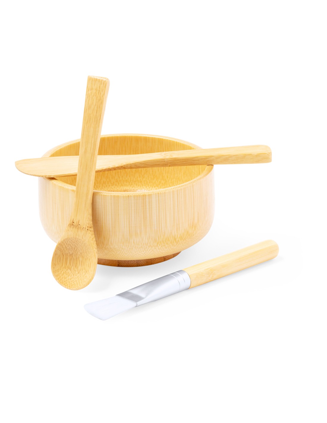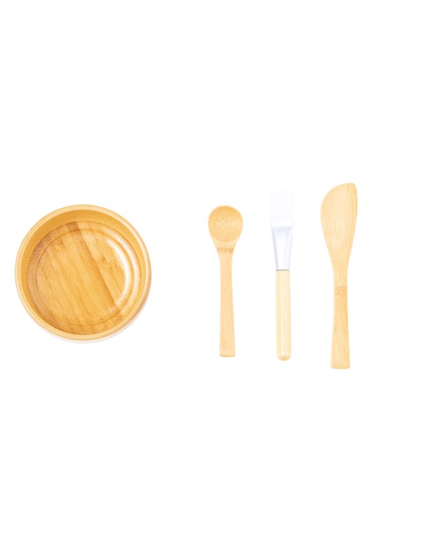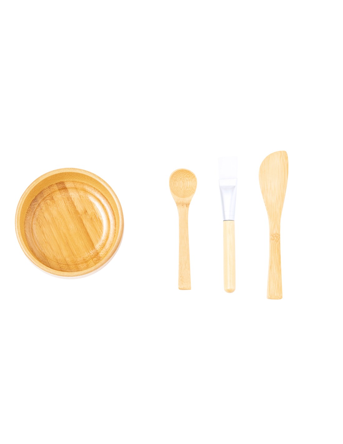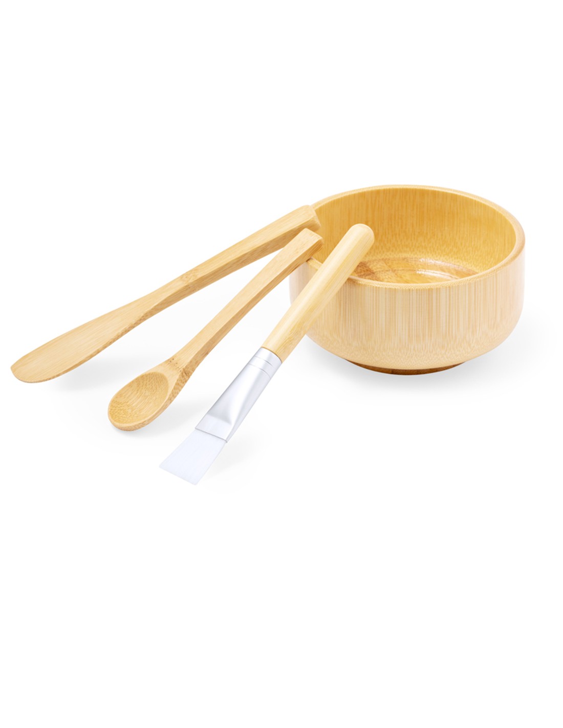 Completo set de mascarilla fabricado en bambú, ideal para una correcta aplicación de la mascarilla facial . Compuesto por 4 piezas: cuenco de elegante diseño, cuchara, paleta y brocha de suaves cerdas. Fácil de limpiar y presentado individualmente en caja de diseño kraft.