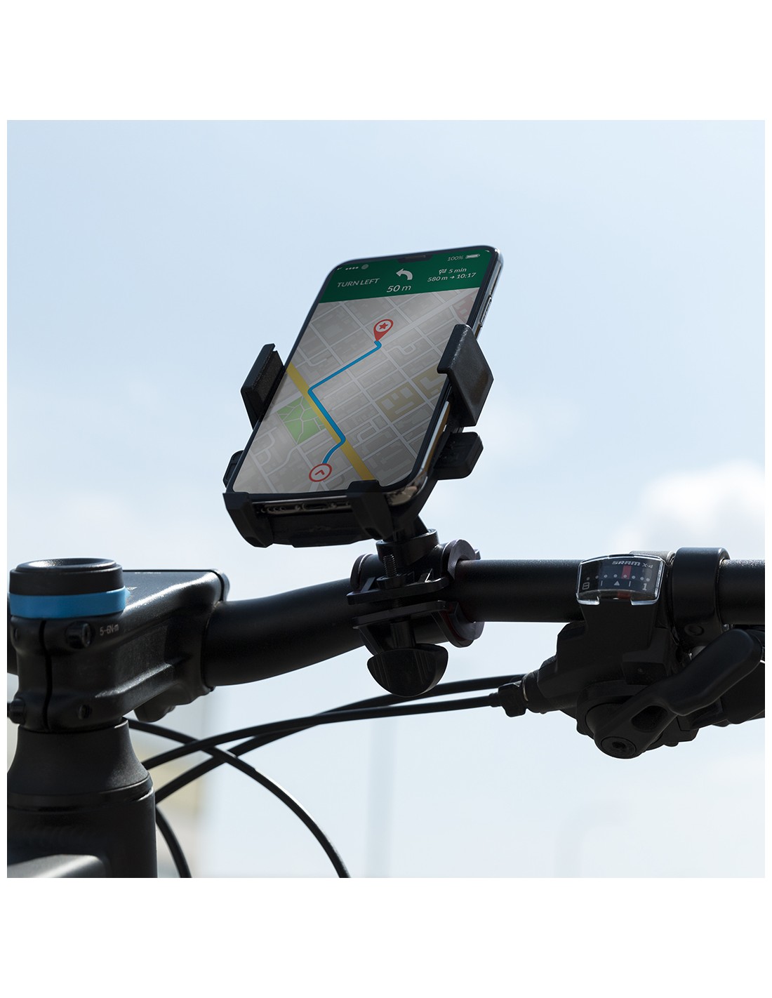 Práctico y resistente soporte de manillar para smartphone. Con 3 posiciones, rotación 360º y ángulo de inclinación de hasta 45º. Sólida pinza de agarre y presentado en atractiva caja de diseño.