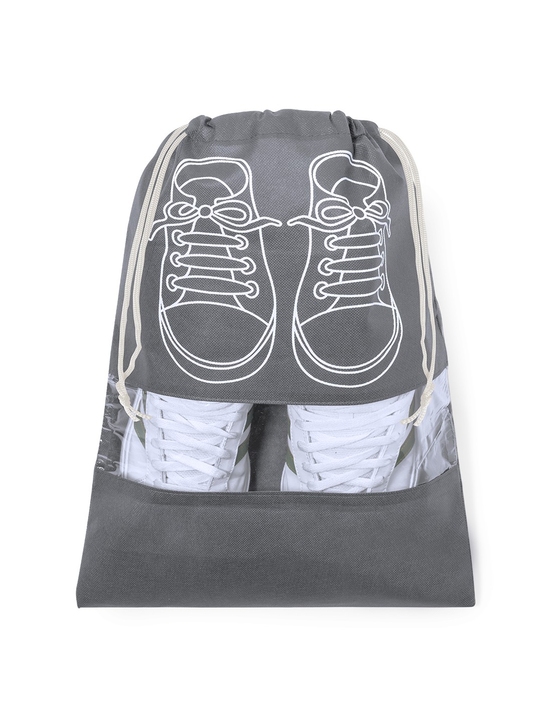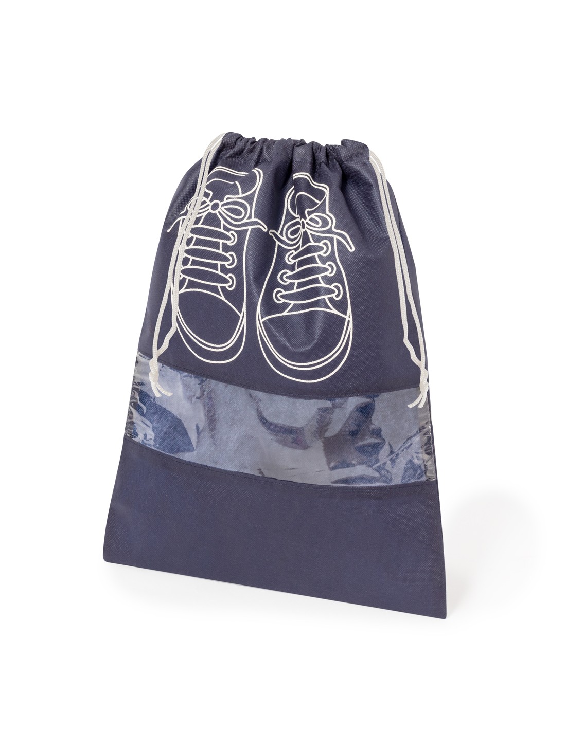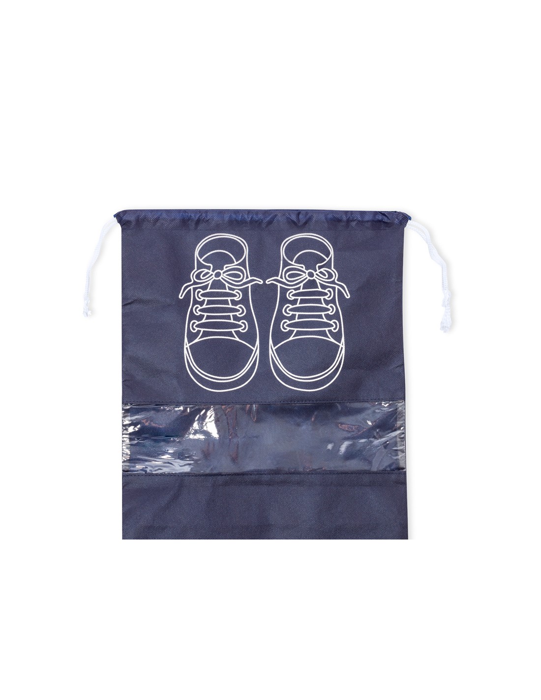 Bolsa portazapatos fabricada en non-woven. Práctica para guardar calzado, con serigrafía inspirada en zapatillas de cordones y práctica ventana transparente para visualizar el interior, con cierre de cordón. Disponible en variados colores diferentes y detalles en blanco.