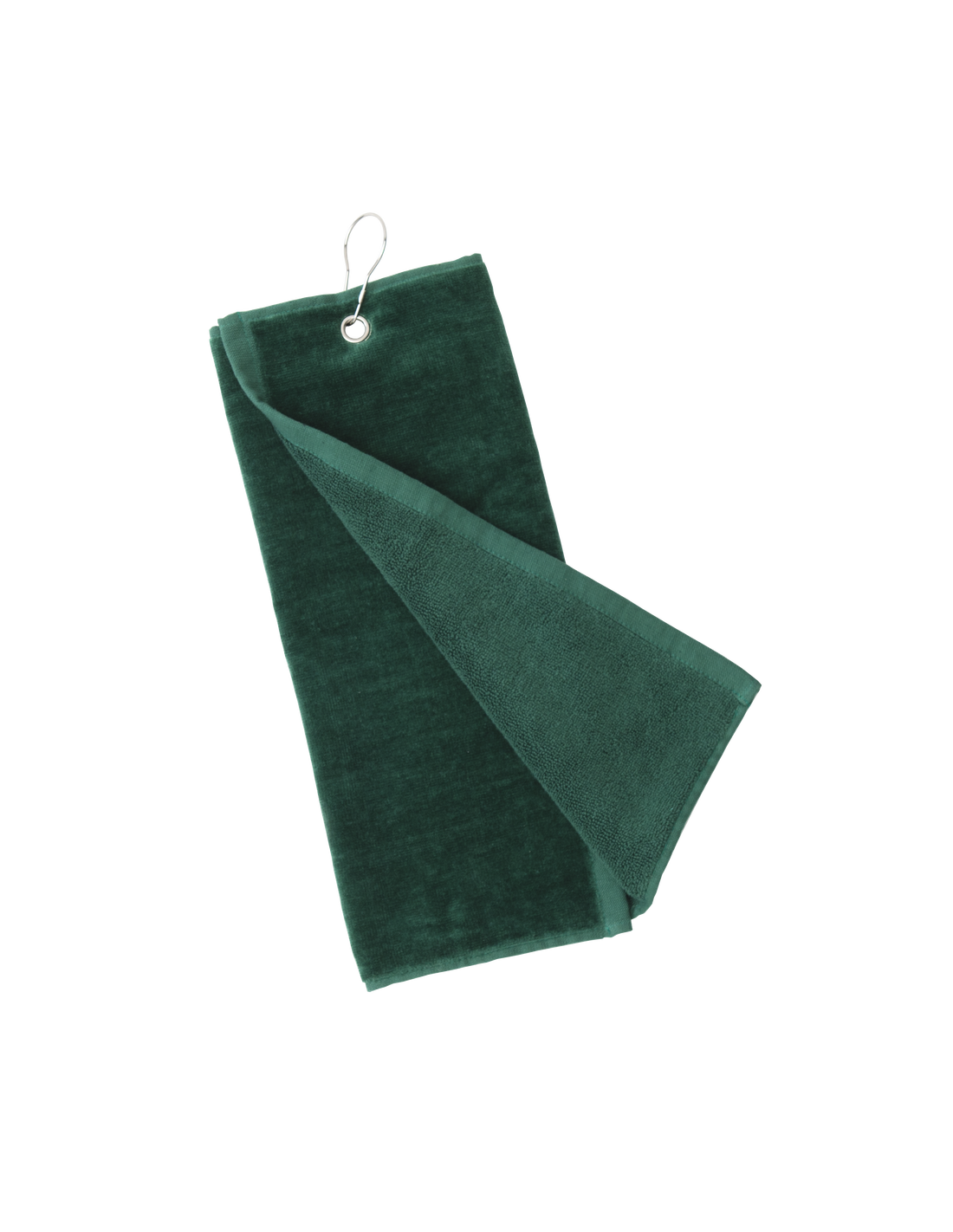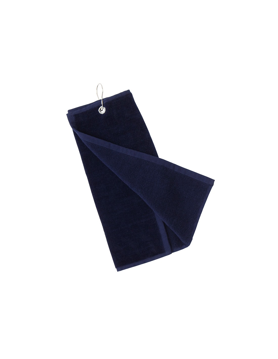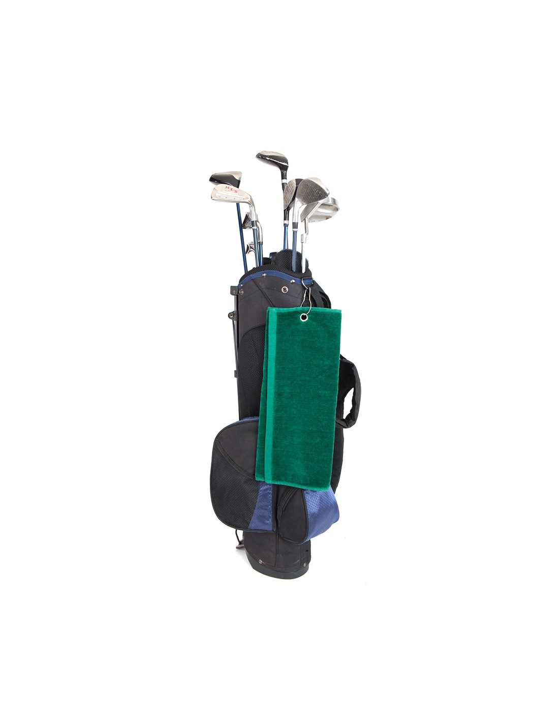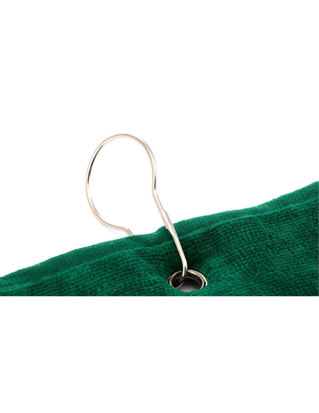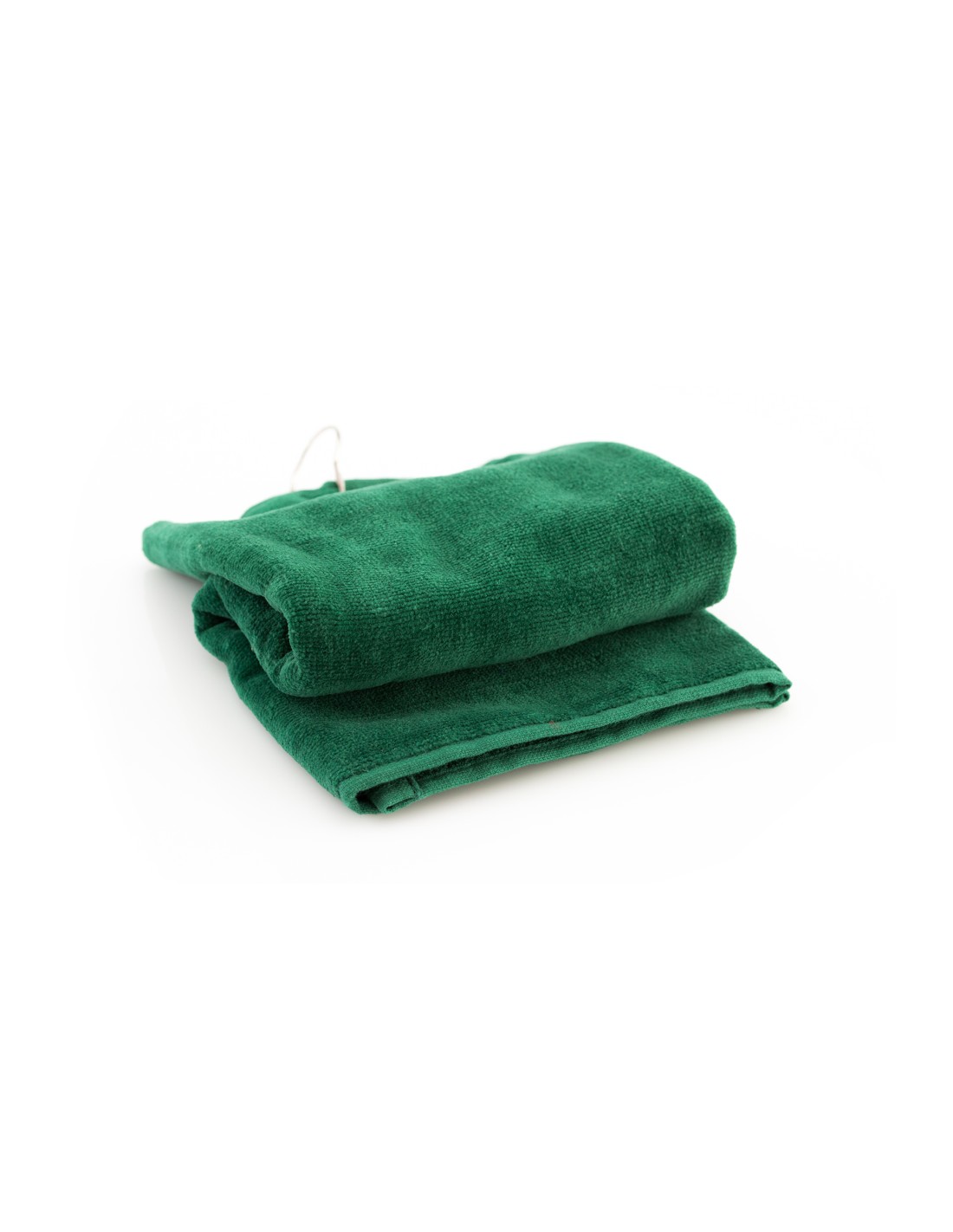 Toalla de golf de 40x50cm en absorbente y suave algodón de alta calidad de 650g/m2. Con argolla reforzada y mosquetón de acople, ambos de acero inox.