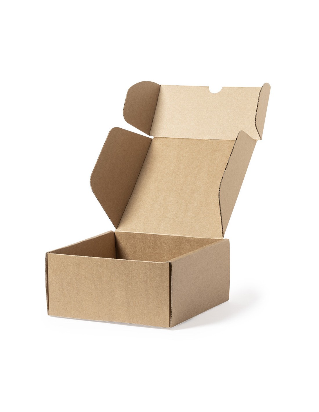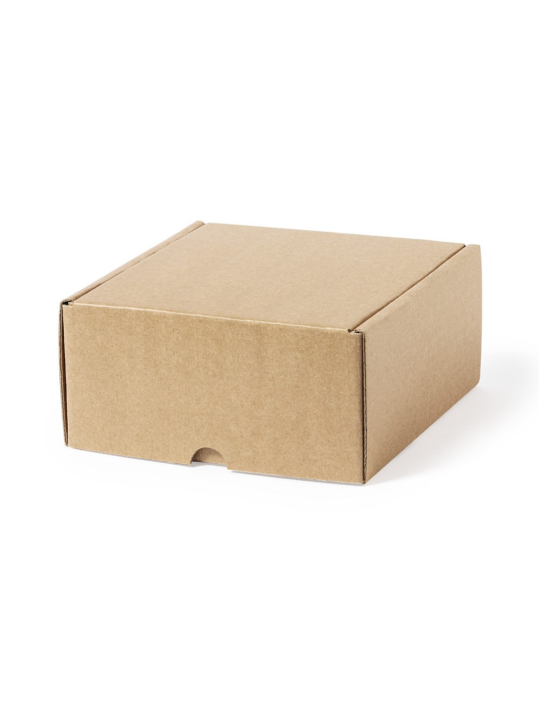Caja de presentación tamaño S, fabricada en cartón reciclado corrugado y acabado kraft. En línea con la tendencia del mercado hacia la sostenibilidad integral del regalo, ofreciendo soluciones de origen reciclado con el fin de ayudar a la mejora y conservación de nuestro planeta.