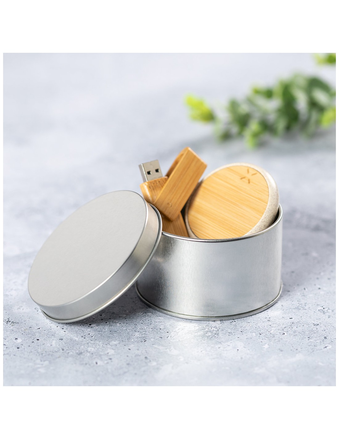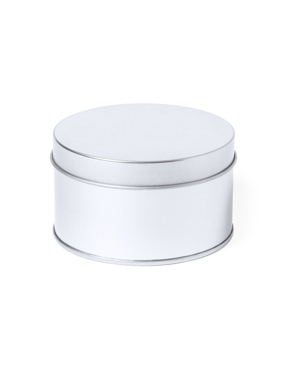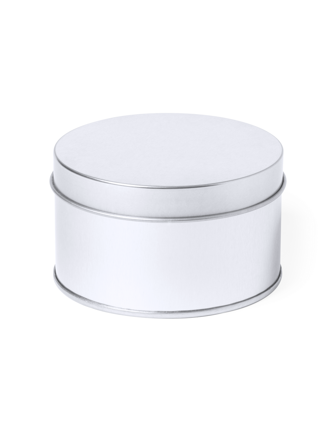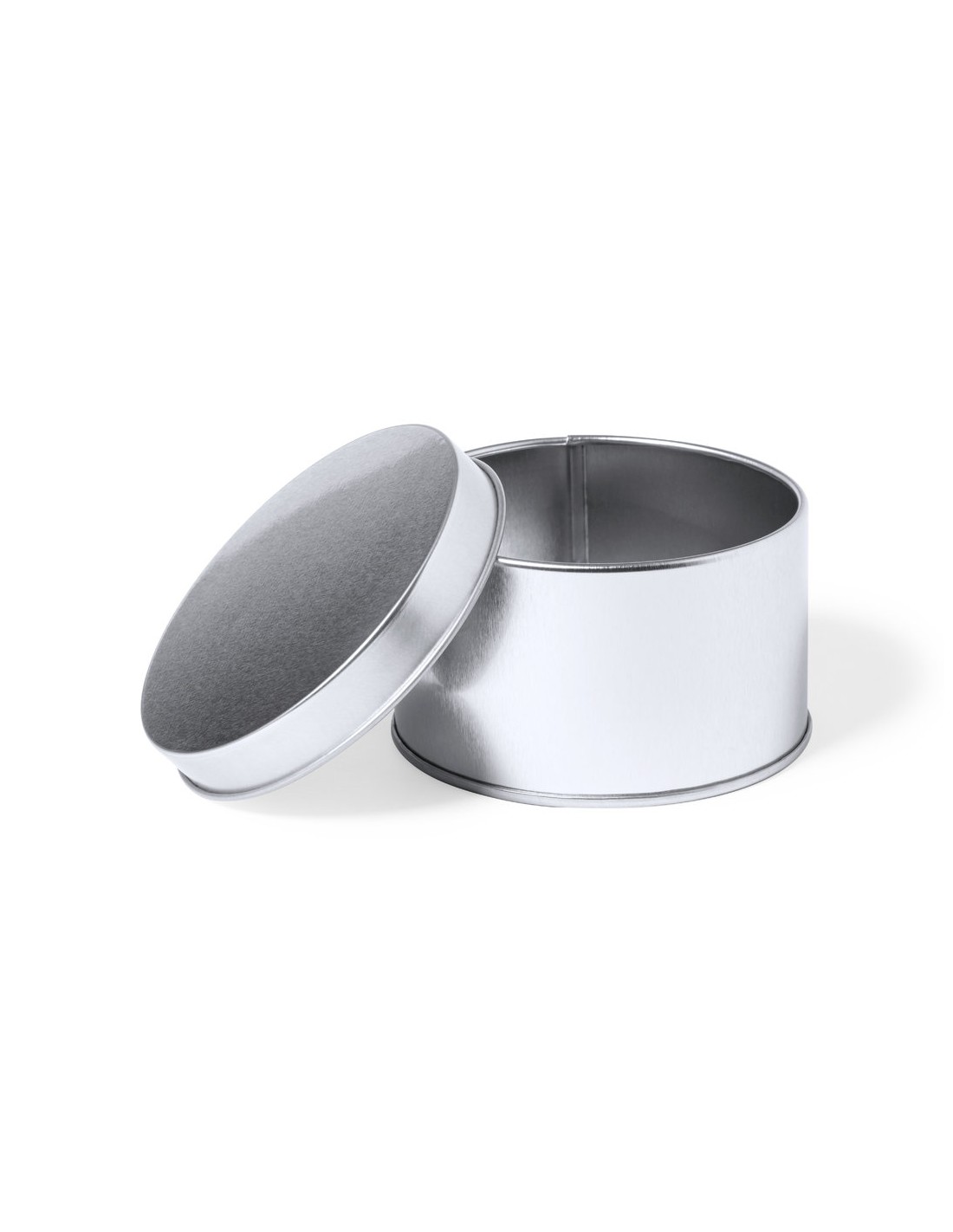 Caja de presentación formato redondo, fabricada en resistente metal de acabado plateado y con tapa a juego.